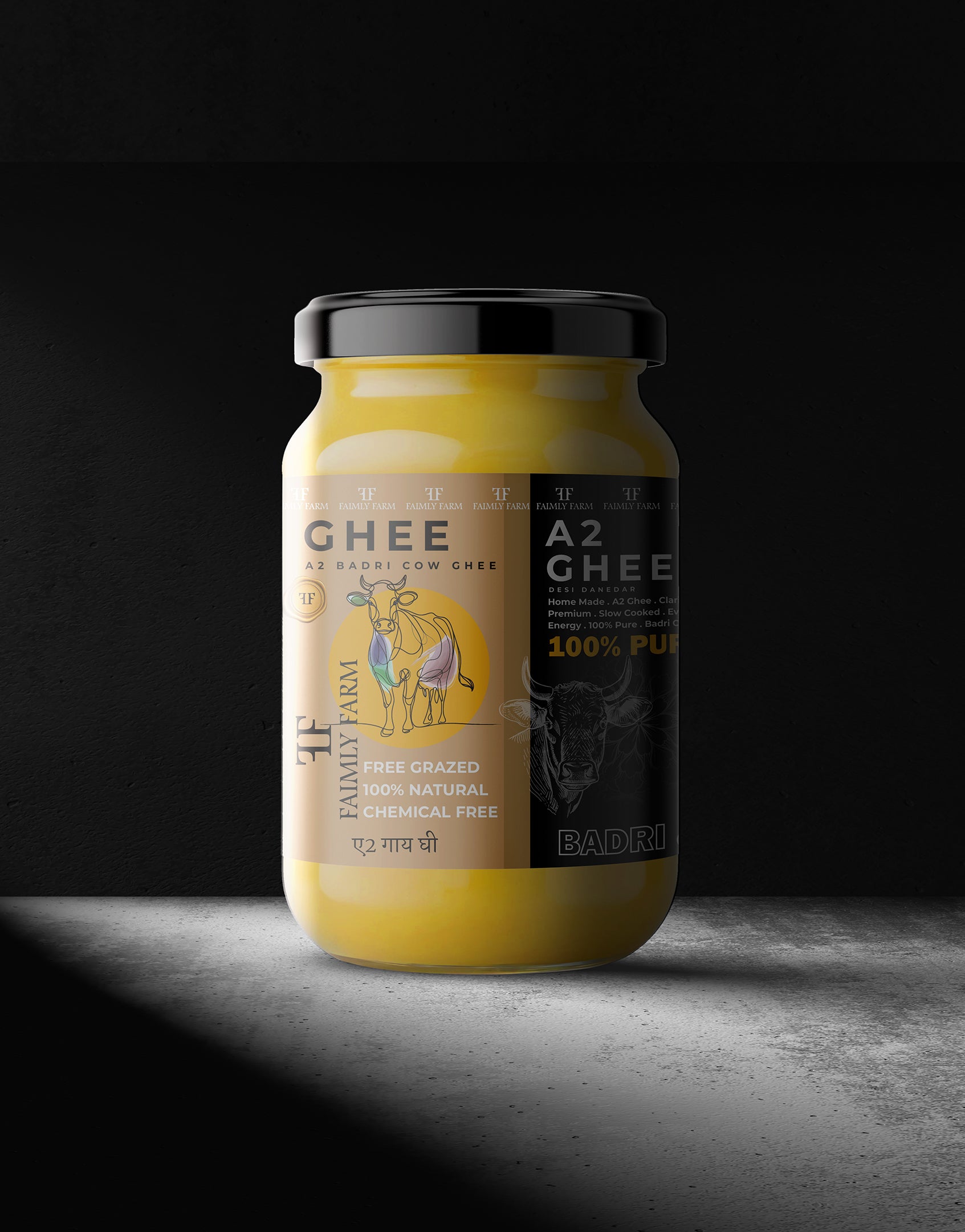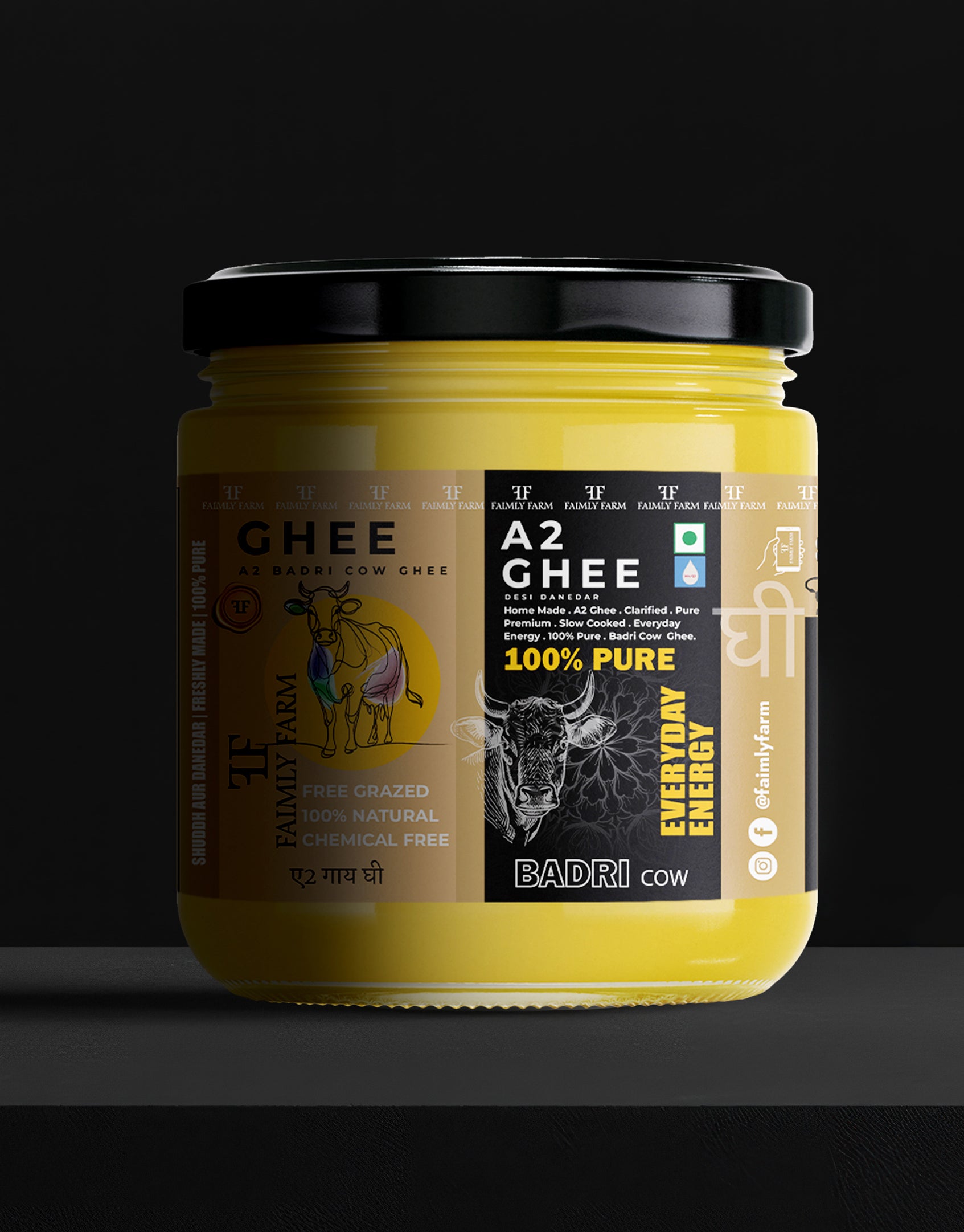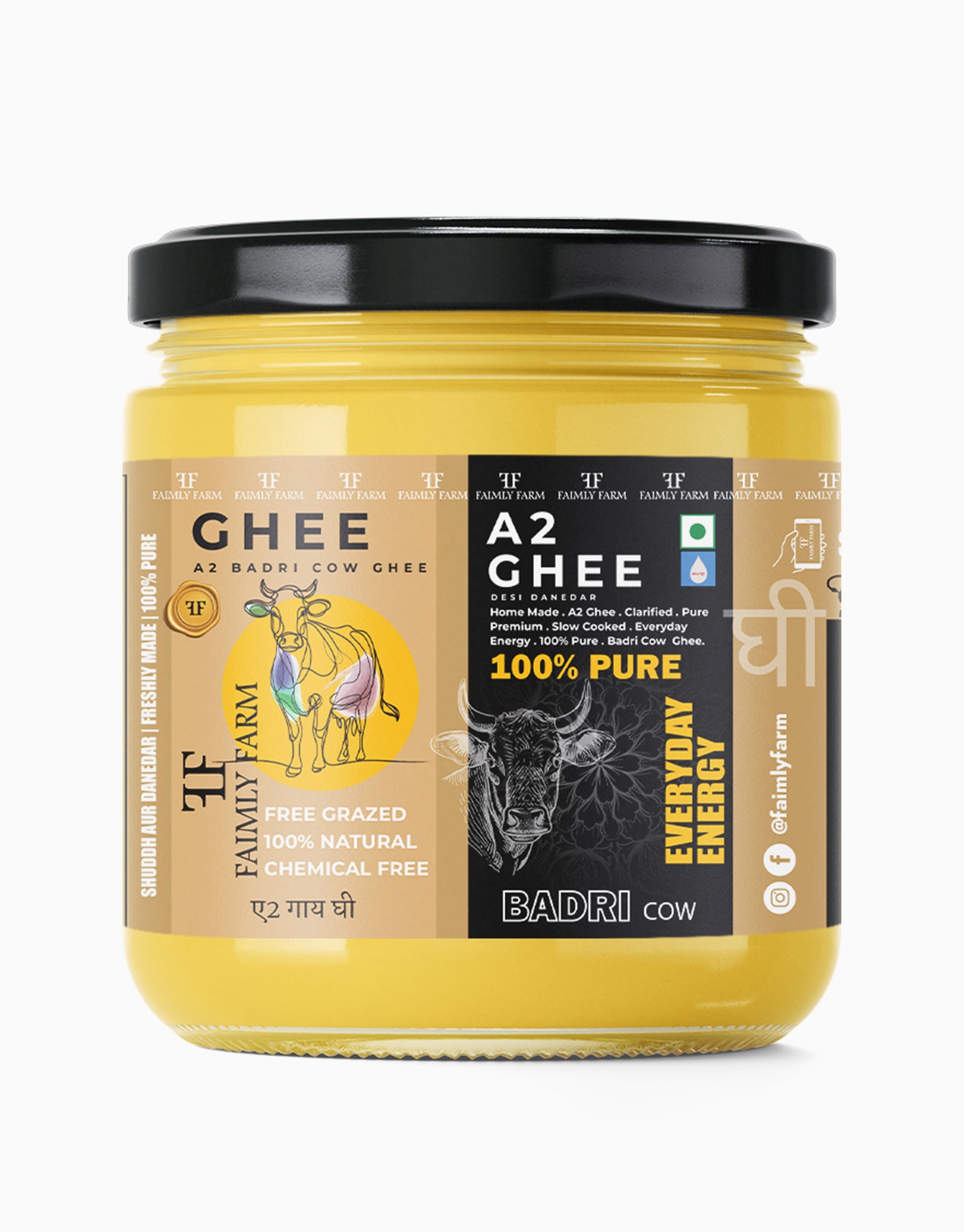 Faimly Farm (Desi Danedar A2 Ghee) – Shuddh aur Danedar | Freshly Made | 100% Pure - Made from the A2 milk of sacred Badri cows that graze freely in the Himalayan regions, this ghee is handcrafted using the traditional bilona method. The curd is churned and slow-cooked to retain its danedar (grainy) texture, rich golden color, and shuddh (pure) aroma. Freshly prepared in small batches, it is ideal for pooja rituals, Ayurvedic health, and authentic desi cooking.