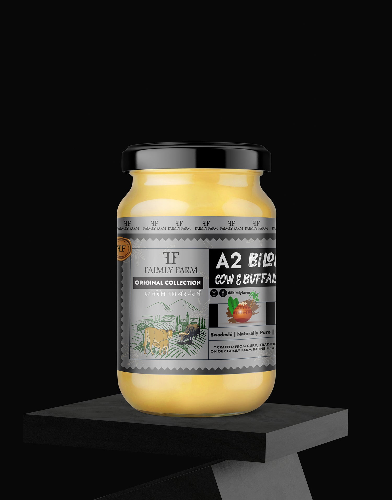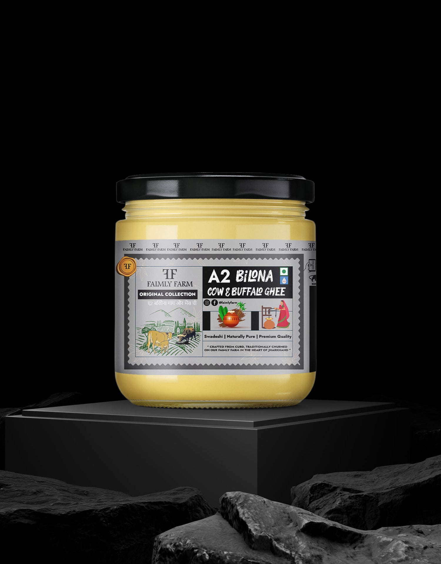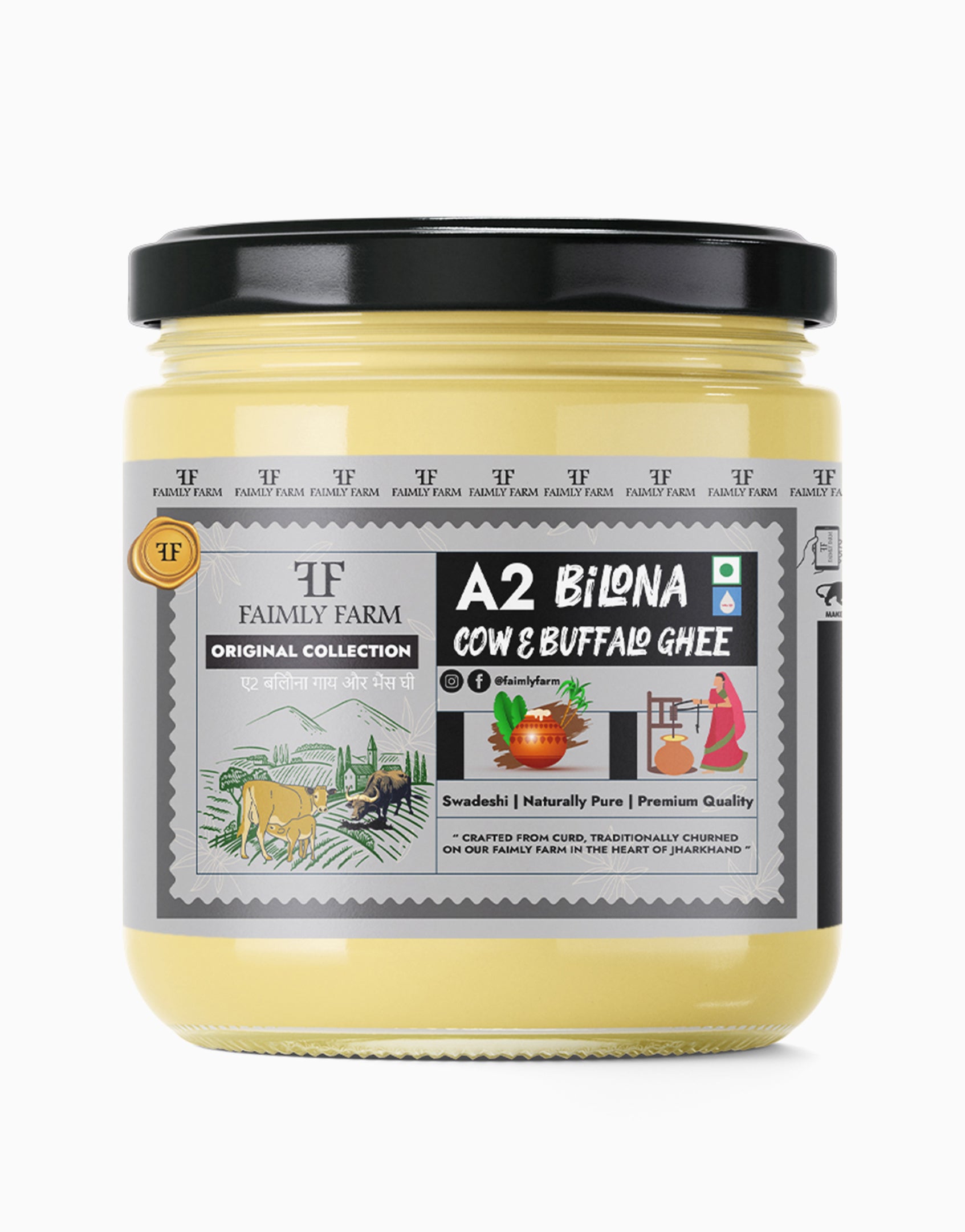 Faimly Farm (Orignal Collection A2 Ghee) – Swadeshi | Naturally Pure | Premium Quality - Discover the wholesome taste of A2 Bilona Cow & Buffalo Blend Ghee, crafted from native Indian A2 cow and buffalo milk. This traditional bilona churned ghee combines the light, aromatic flavor of cow ghee with the creamy richness of buffalo ghee, delivering balanced nutrition and authentic taste in every spoonful.