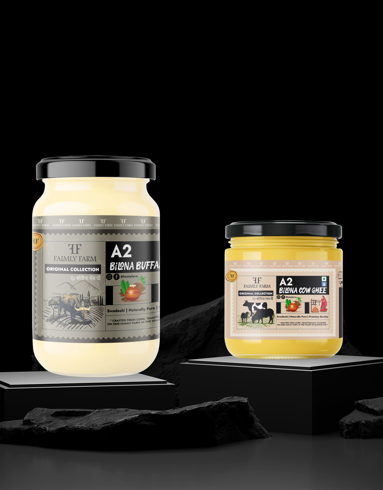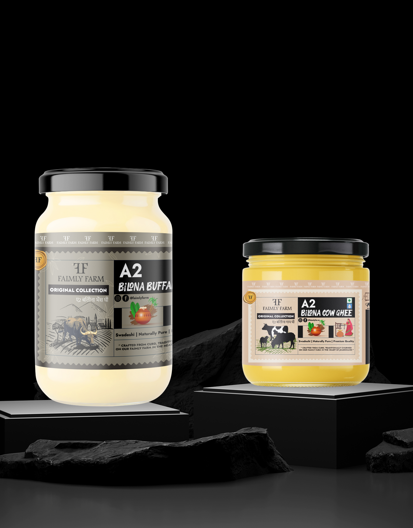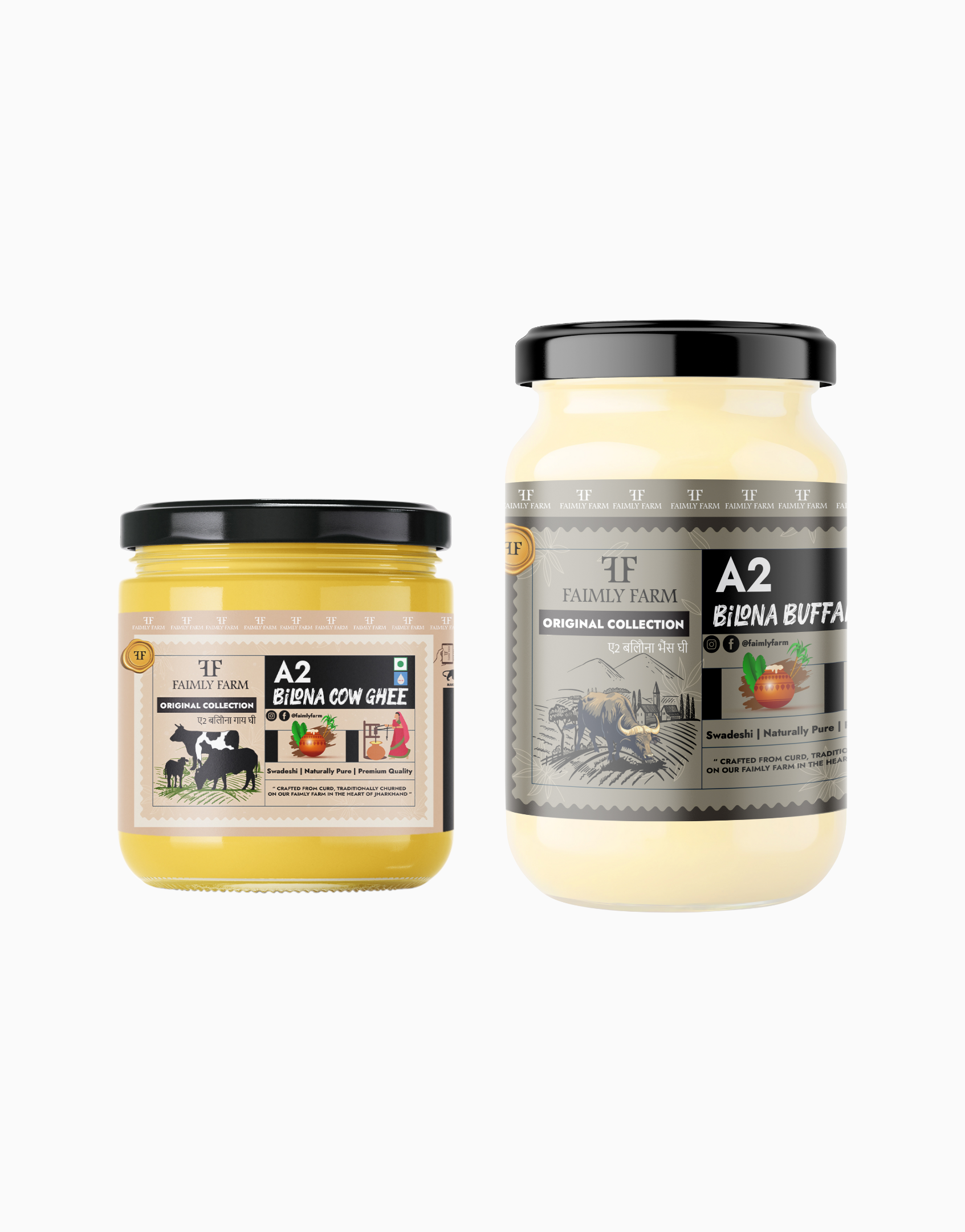 Faimly Farm (Orignal Collection A2 Ghee) – Swadeshi | Naturally Pure | Premium Quality - Celebrate Indian tradition with the Original Collection A2 Ghee Combo by Faimly Farm. This Swadeshi blend includes A2 Cow Ghee and A2 Buffalo Ghee, handcrafted using the ancient Bilona method. Naturally Pure and Premium in Quality, it delivers authentic taste, rich aroma, and nutritional purity in every spoonful.