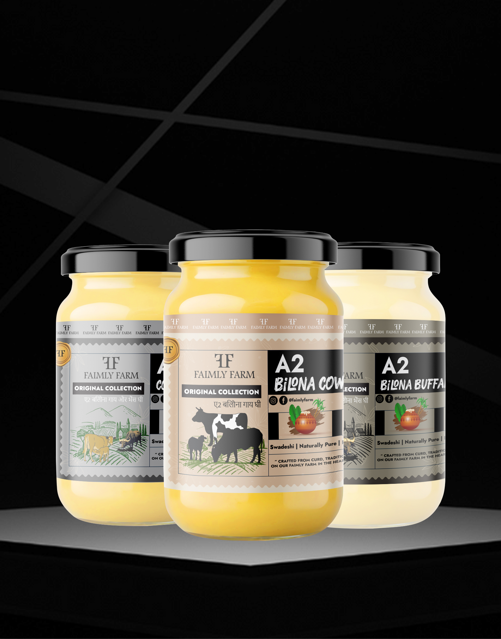 Faimly Farm (Orignal Collection A2 Ghee) – Swadeshi | Naturally Pure | Premium Quality - Rediscover the essence of Indian tradition with Faimly Farm’s Original Collection A2 Ghee Trio—featuring A2 Cow Ghee, A2 Buffalo Ghee, and A2 Cow & Buffalo Blend Ghee. Crafted through the authentic Bilona method, this Swadeshi trio is naturally pure, rich in nutrients, and perfect for those who value premium quality and taste in every meal.