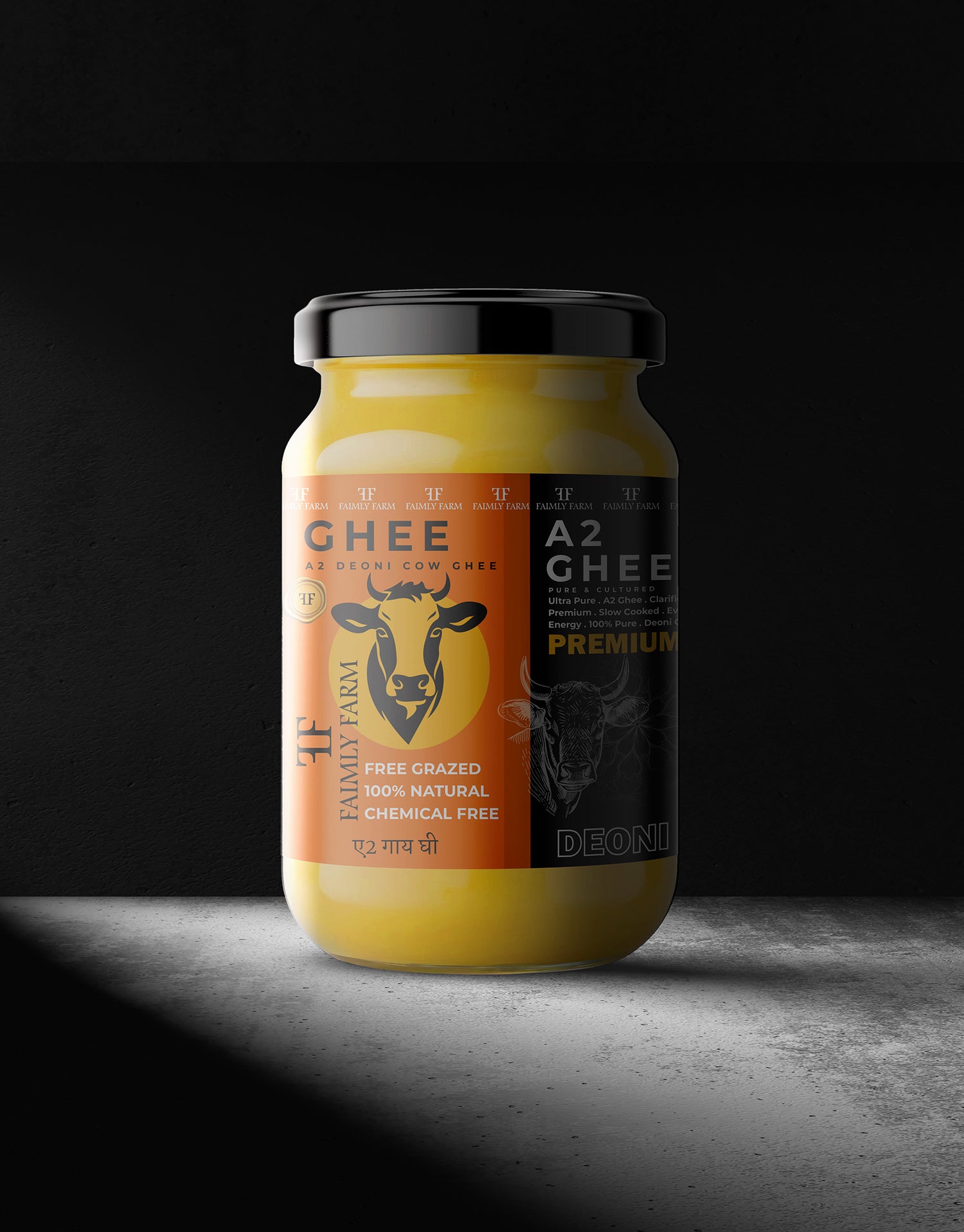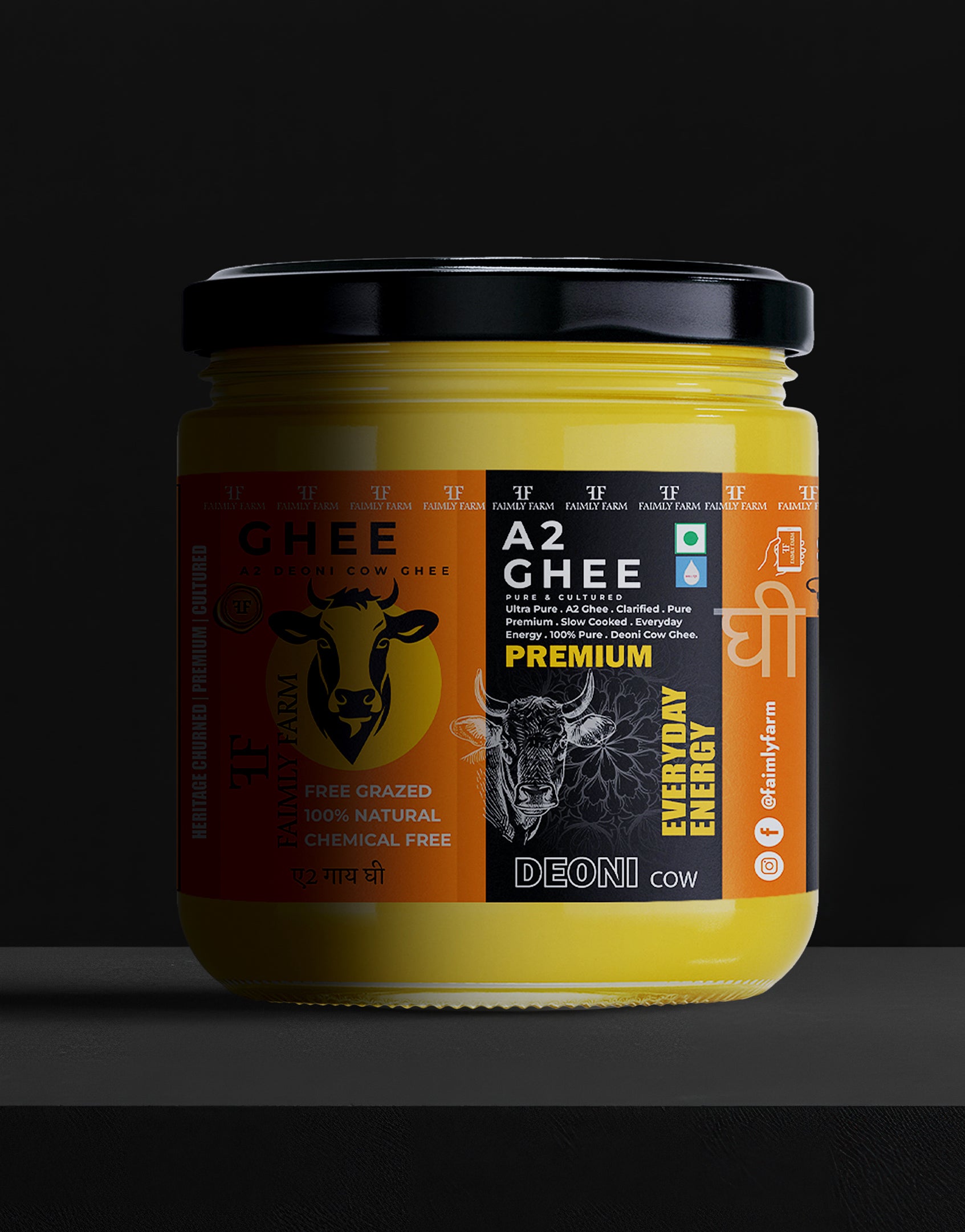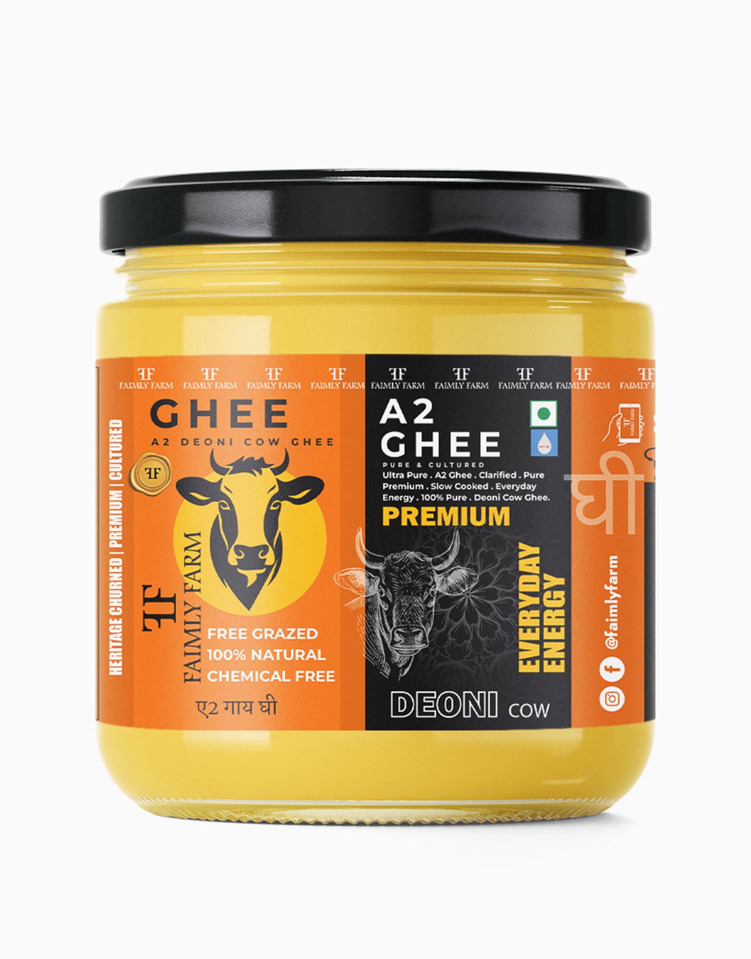 Faimly Farm (Cultural Heritage A2 Ghee) – Heritage Churned | Premium | Cultured - Experience authentic nutrition with A2 Deoni Cow Ghee, crafted from the A2 milk of native Deoni cows, a cherished Indian breed. Made using the heritage bilona method, where curd is hand-churned and slow-cooked, this ghee retains its probiotic richness, deep aroma, and digestive benefits. Perfect for daily use, Ayurvedic rituals, and premium Indian cooking, it brings rural tradition to modern kitchens.