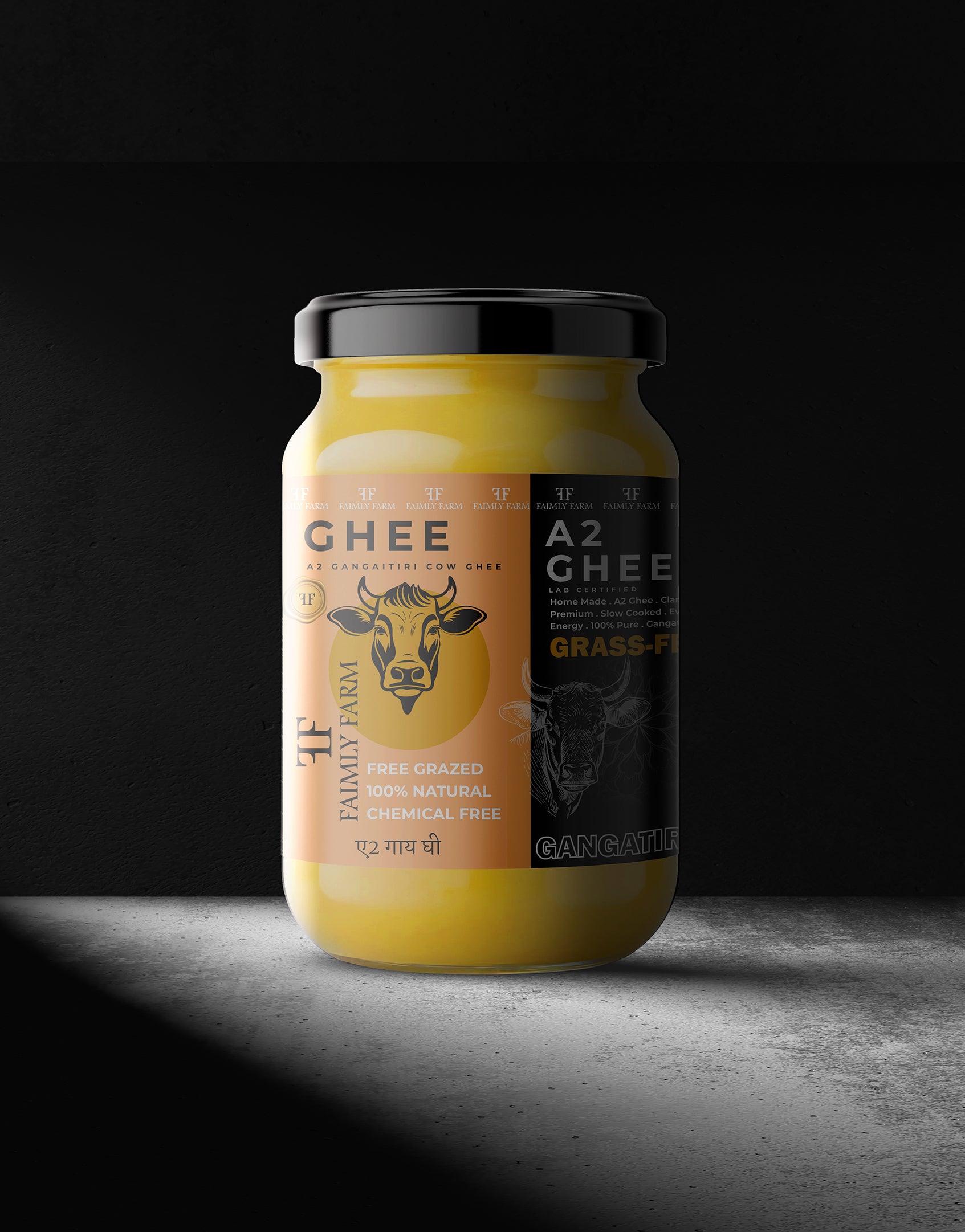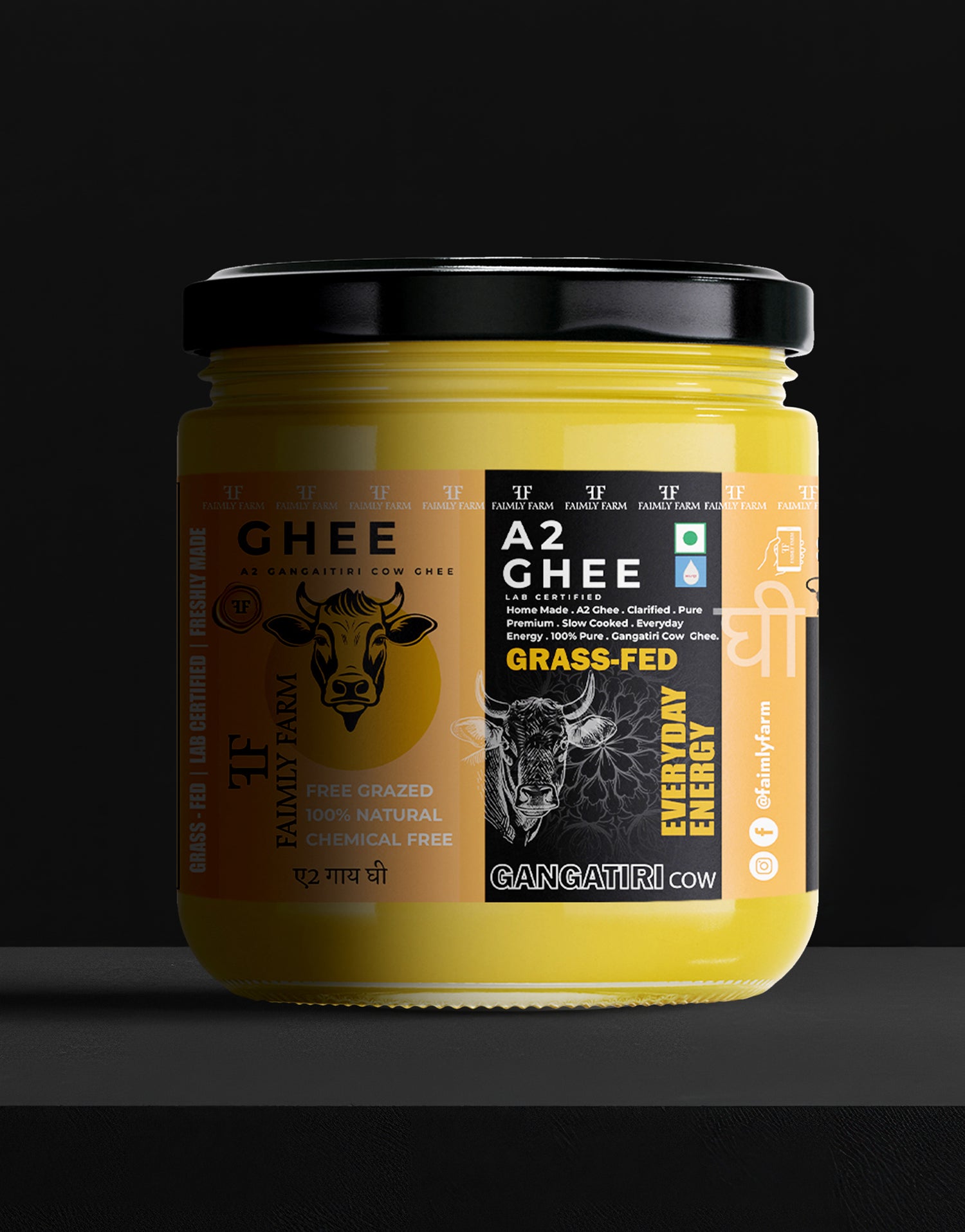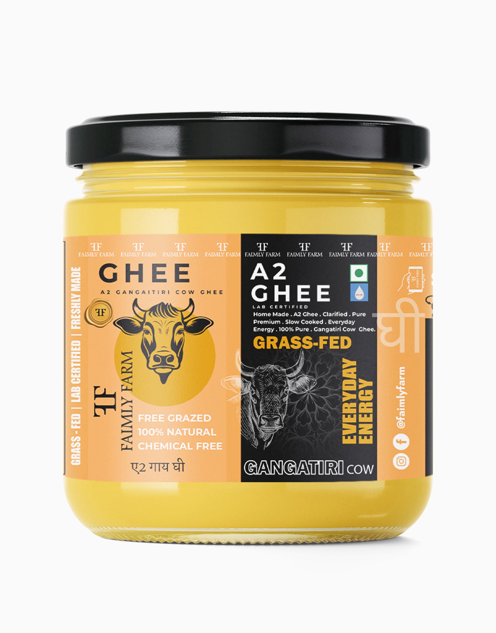 Faimly Farm (Farm Fresh A2 Ghee Series) – Grass-Fed | Lab Certified | Freshly Made - Sourced from the indigenous Gangatiri cows of the Ganga plains in Bihar and Eastern Uttar Pradesh, this A2 ghee embodies natural purity. The cows graze freely on organic pastures, and their nutrient-rich milk is converted into ghee using the traditional bilona churning process. Every batch is lab-tested for quality, ensuring a fresh, grainy texture and authentic taste.