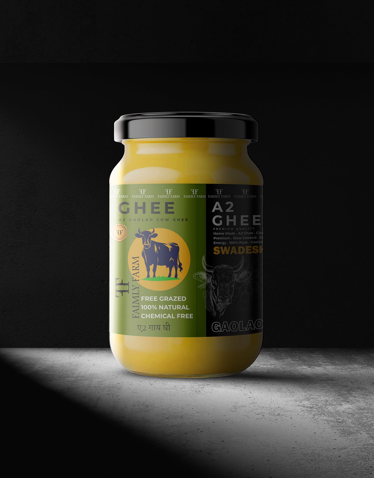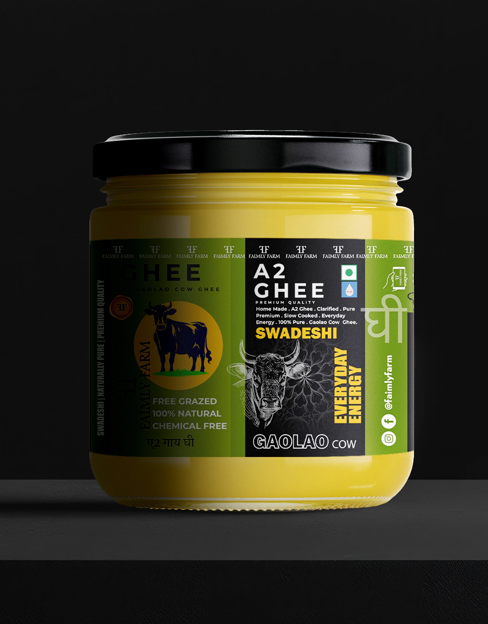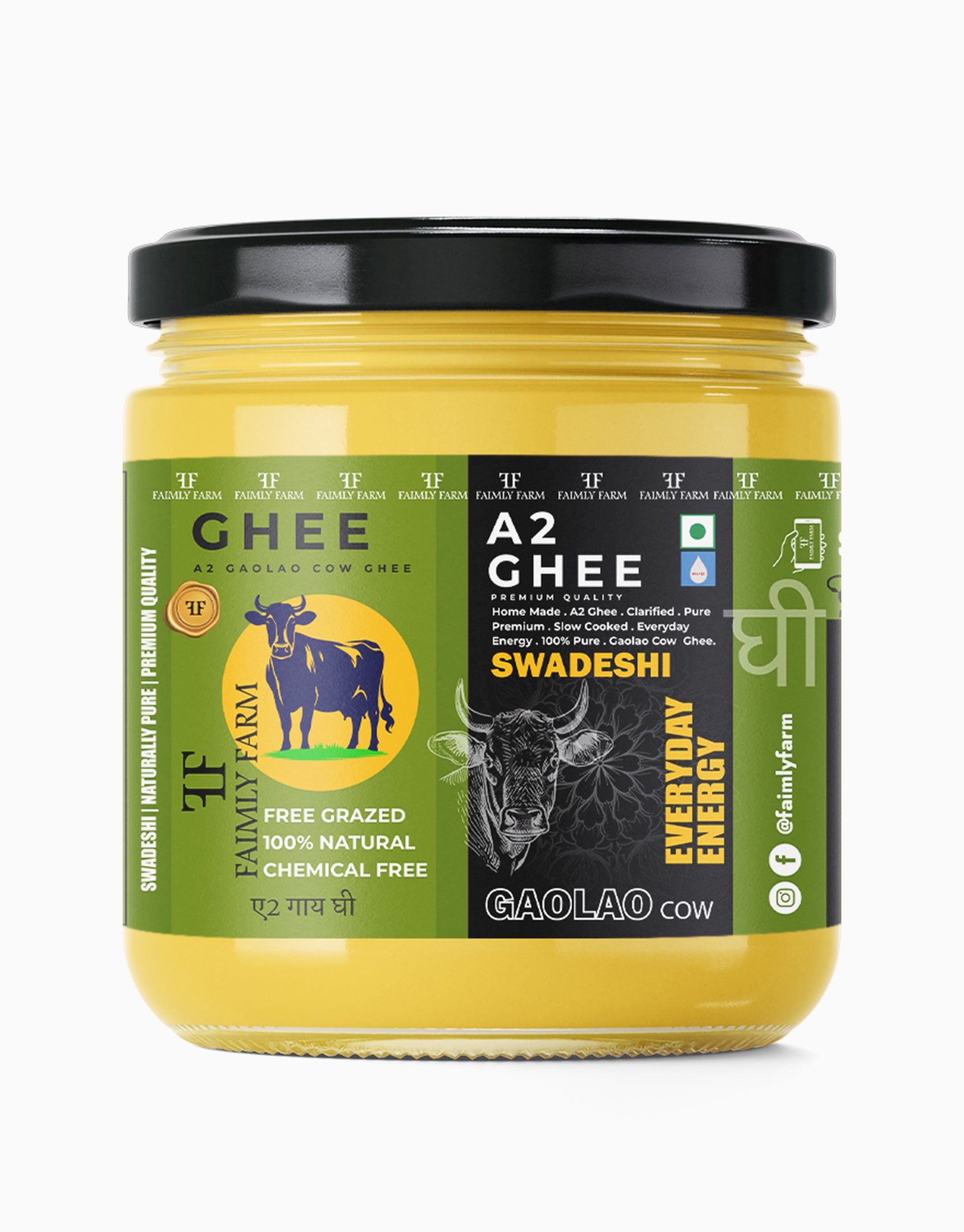 Faimly Farm (Nature's Pure A2 Collection) – Swadeshi | Naturally Pure | Premium Quality - Crafted from the A2 milk of India’s rare Gaolao cows, this ghee embodies the wisdom of indigenous farming and the purity of traditional methods. Made with the bilona process, it begins with curd-churned butter, which is slow-cooked to a soft, golden, grainy perfection. Free from additives and chemicals, this ghee offers a clean aroma, smooth texture, and wholesome nutrients, making it an ideal everyday superfood for immunity, digestion, and vitality.