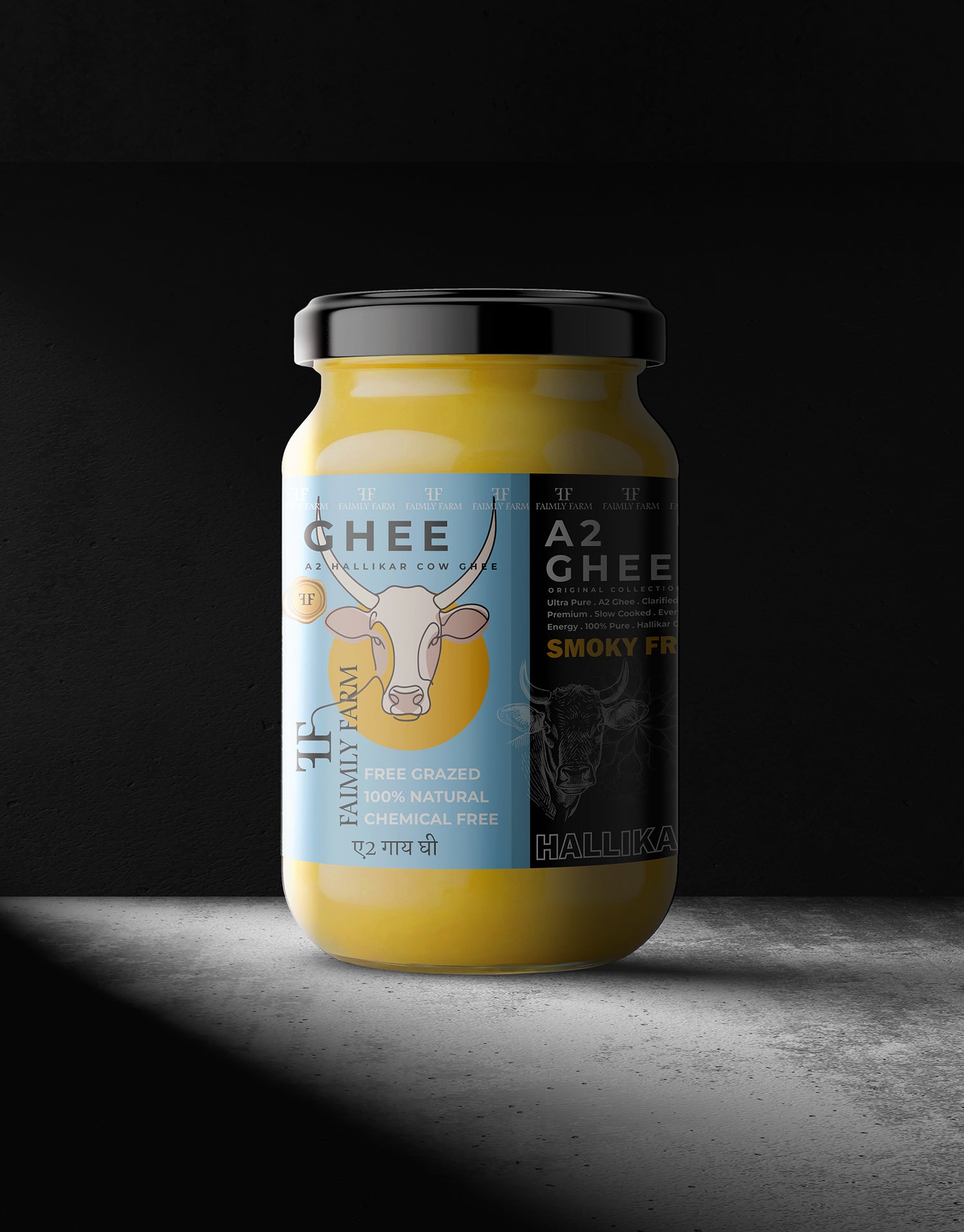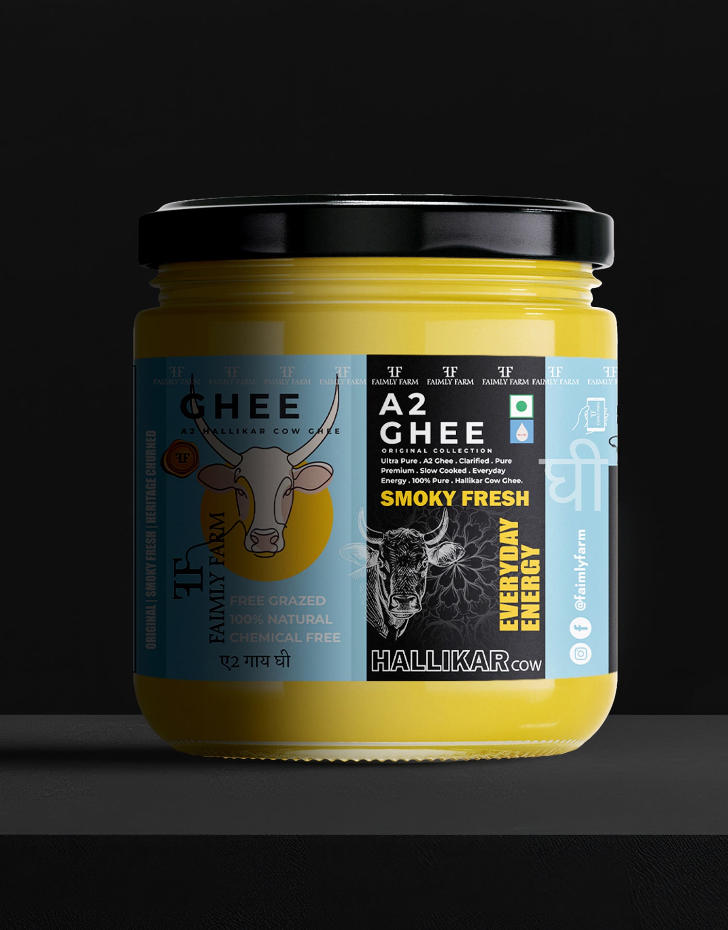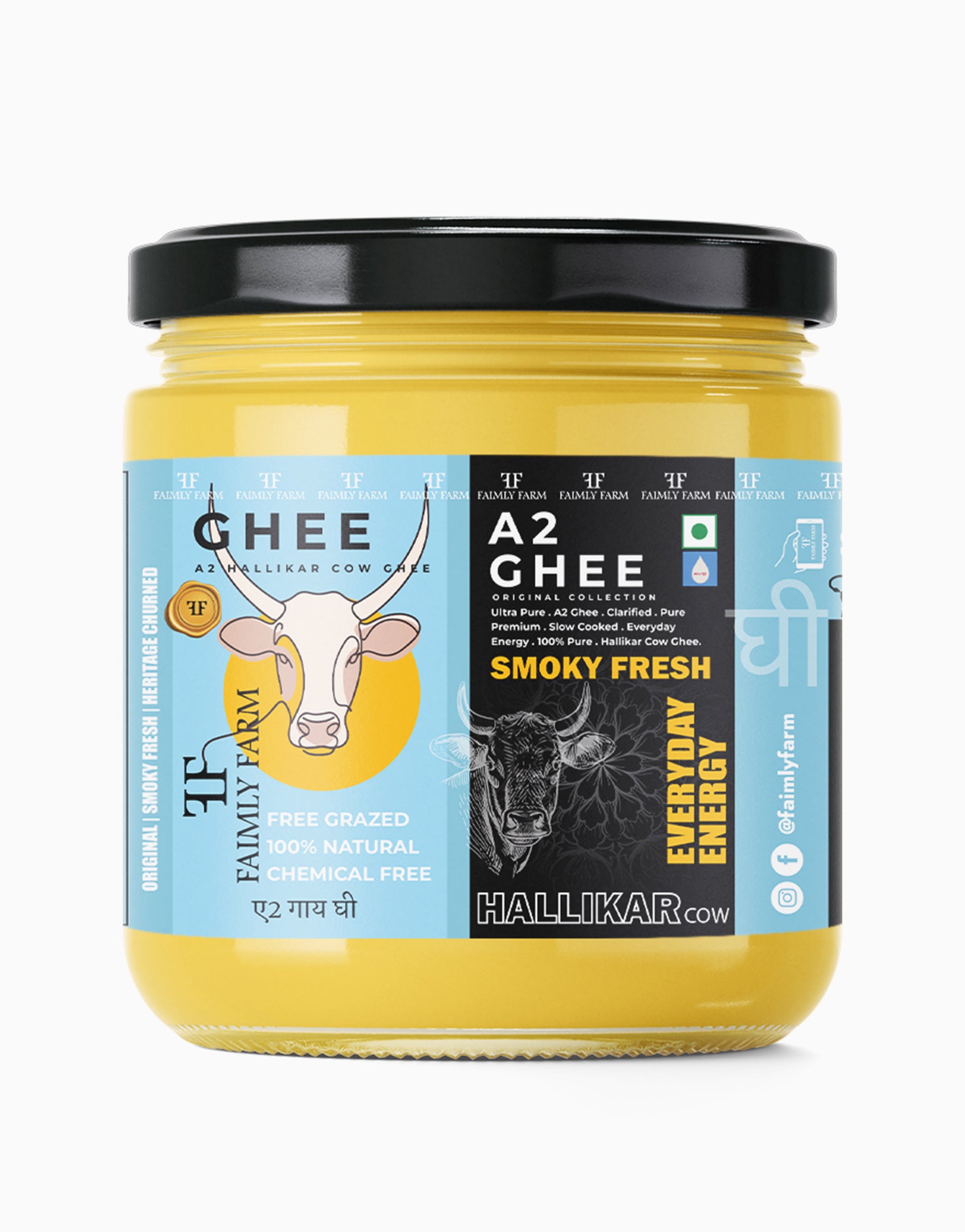 Faimly Farm (OrigInal Collection A2 Ghee) – Original | Smoky Fresh | Heritage Churned - Crafted from the A2 milk of ancient Hallikar cows of Karnataka, Hallikar A2 Cow Ghee is made using the traditional bilona method, where curd is hand-churned and butter is slow-simmered. This ghee is finished with a natural smoky touch, offering bold aroma, rich taste, and authentic nourishment. Ideal for daily wellness, rituals, and heritage cooking, it delivers purity with a bold, earthy essence.