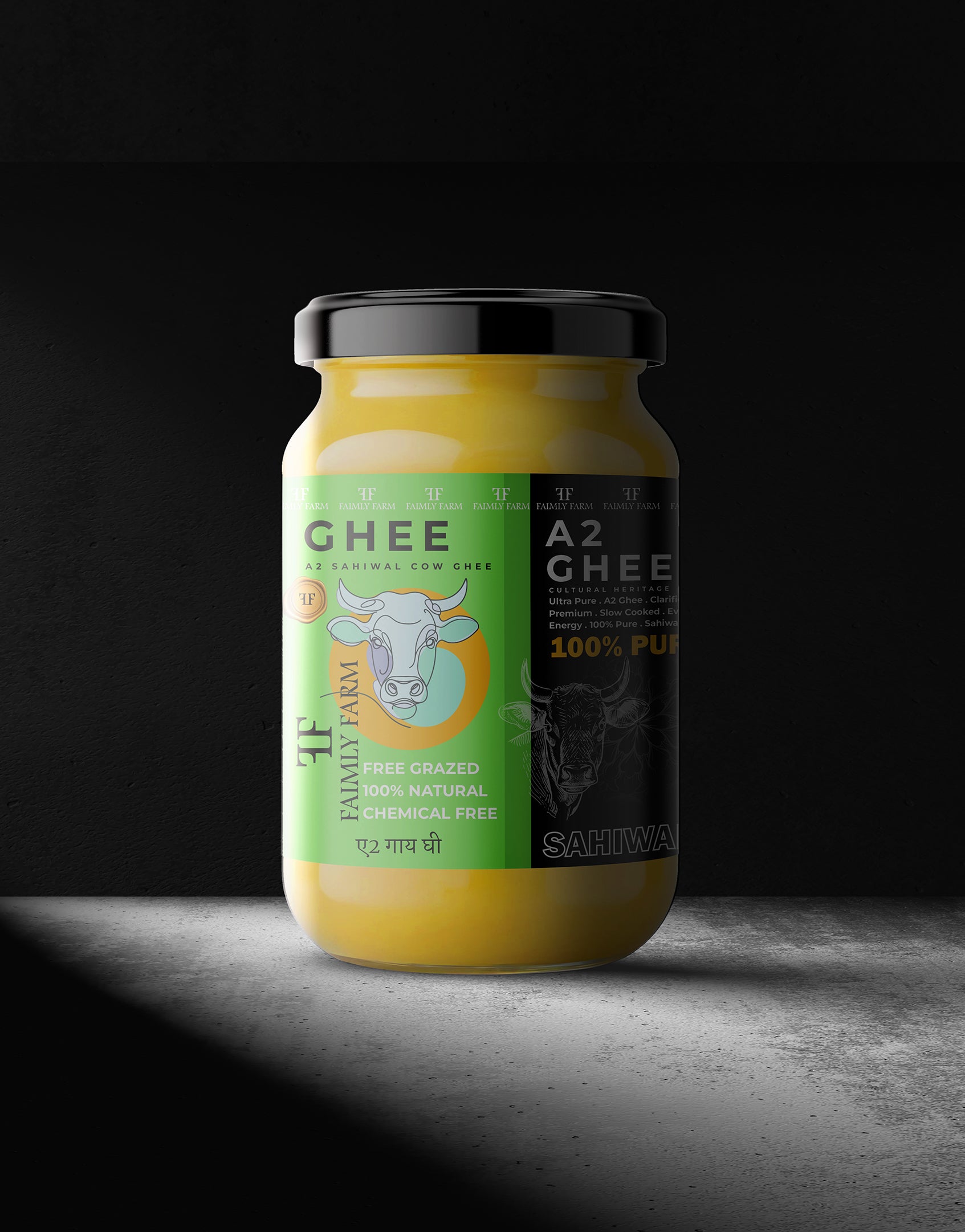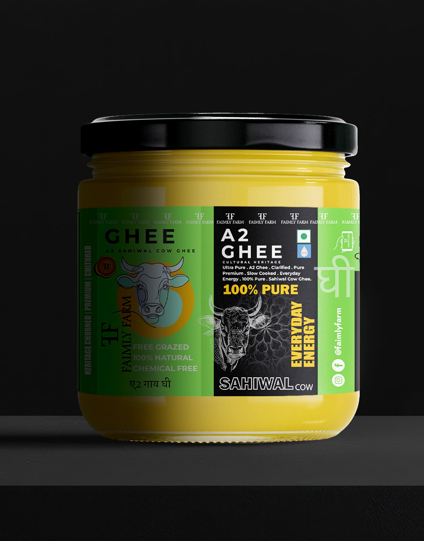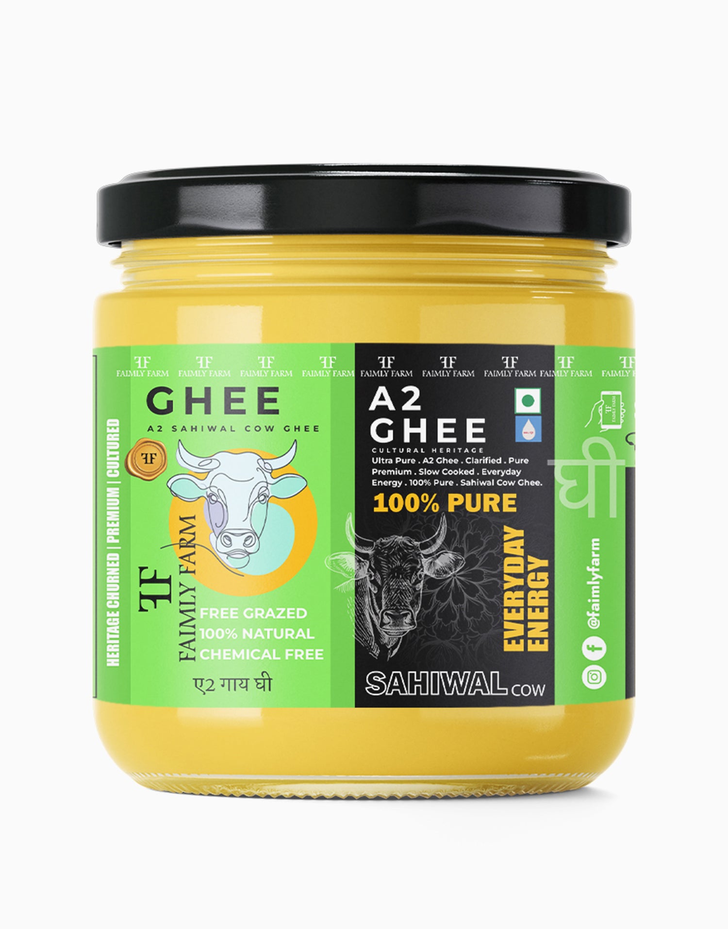 Faimly Farm (Cultural Heritage A2 Ghee) – Heritage Churned | Premium | Cultured - Experience the richness of A2 Sahiwal Cow Ghee, made from the A2 milk of India’s prized Sahiwal cows using the heritage bilona method. The process involves culturing curd, hand-churning into butter, and slow-cooking to create a grainy, aromatic, and nutrient-rich ghee. Ideal for digestion, daily wellness, and premium Indian cooking, this ghee delivers tradition and purity in every drop.