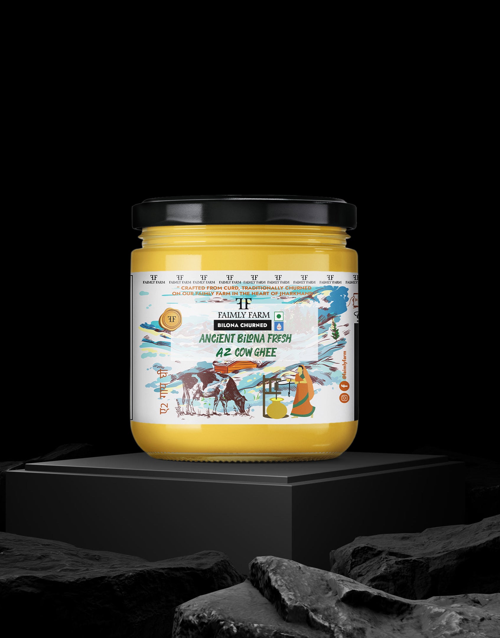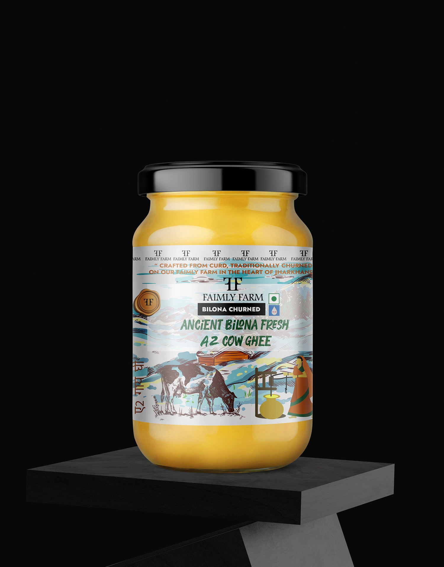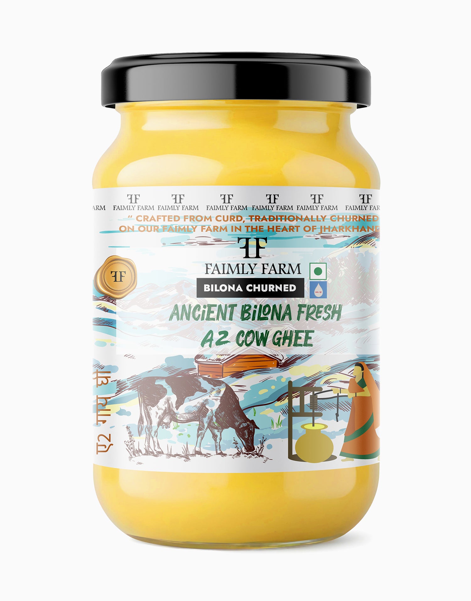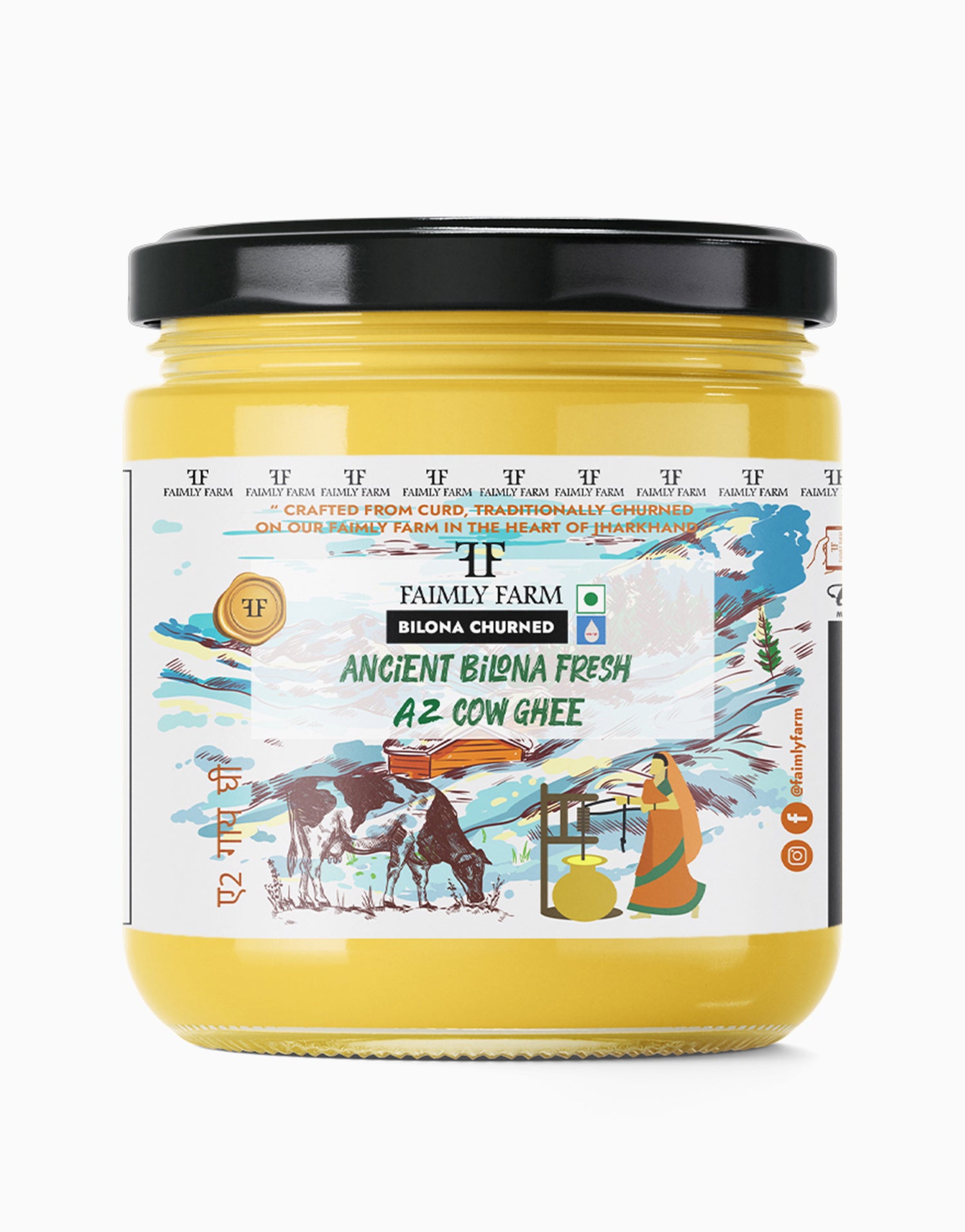 Faimly Farm (Bilona Churned ) – Made with Bilona Churned - Experience authentic nutrition with this heritage-grade A2 Cow Ghee, handcrafted using the ancient bilona churned method. Fresh milk is set into curd, churned into butter, and slow-cooked over fire to preserve nutrients and deliver a rich, danedar (grainy) texture, vibrant golden color, and deep natural aroma.