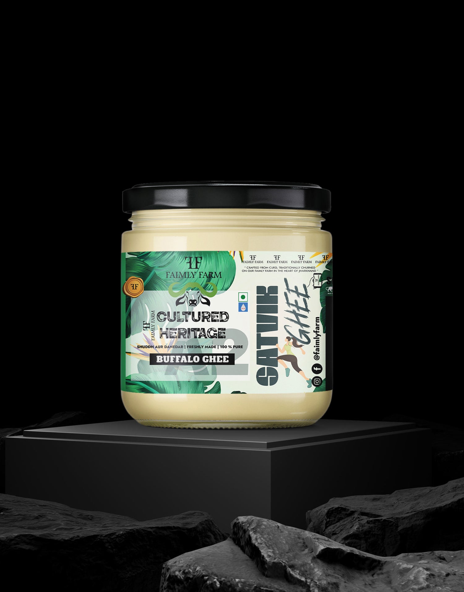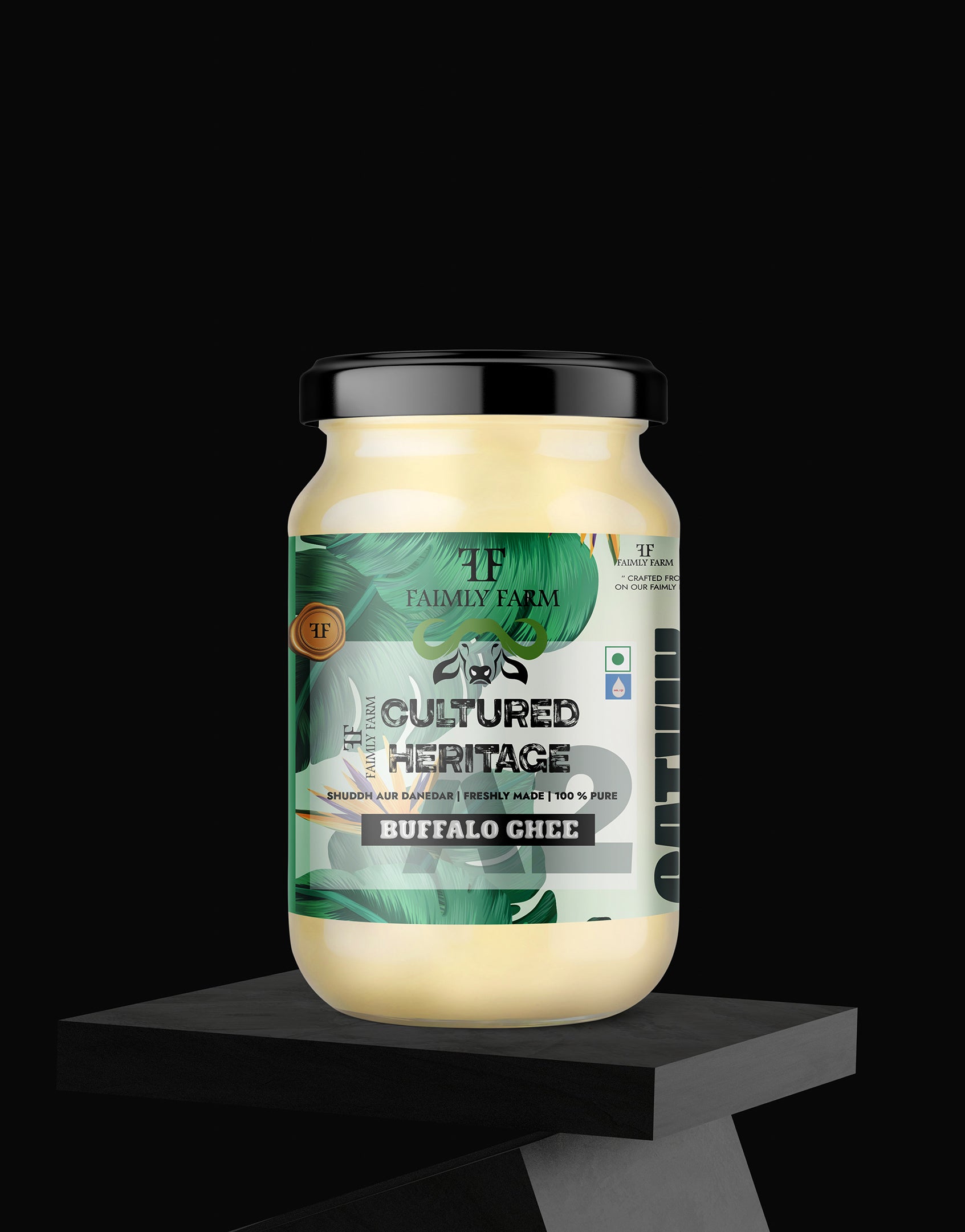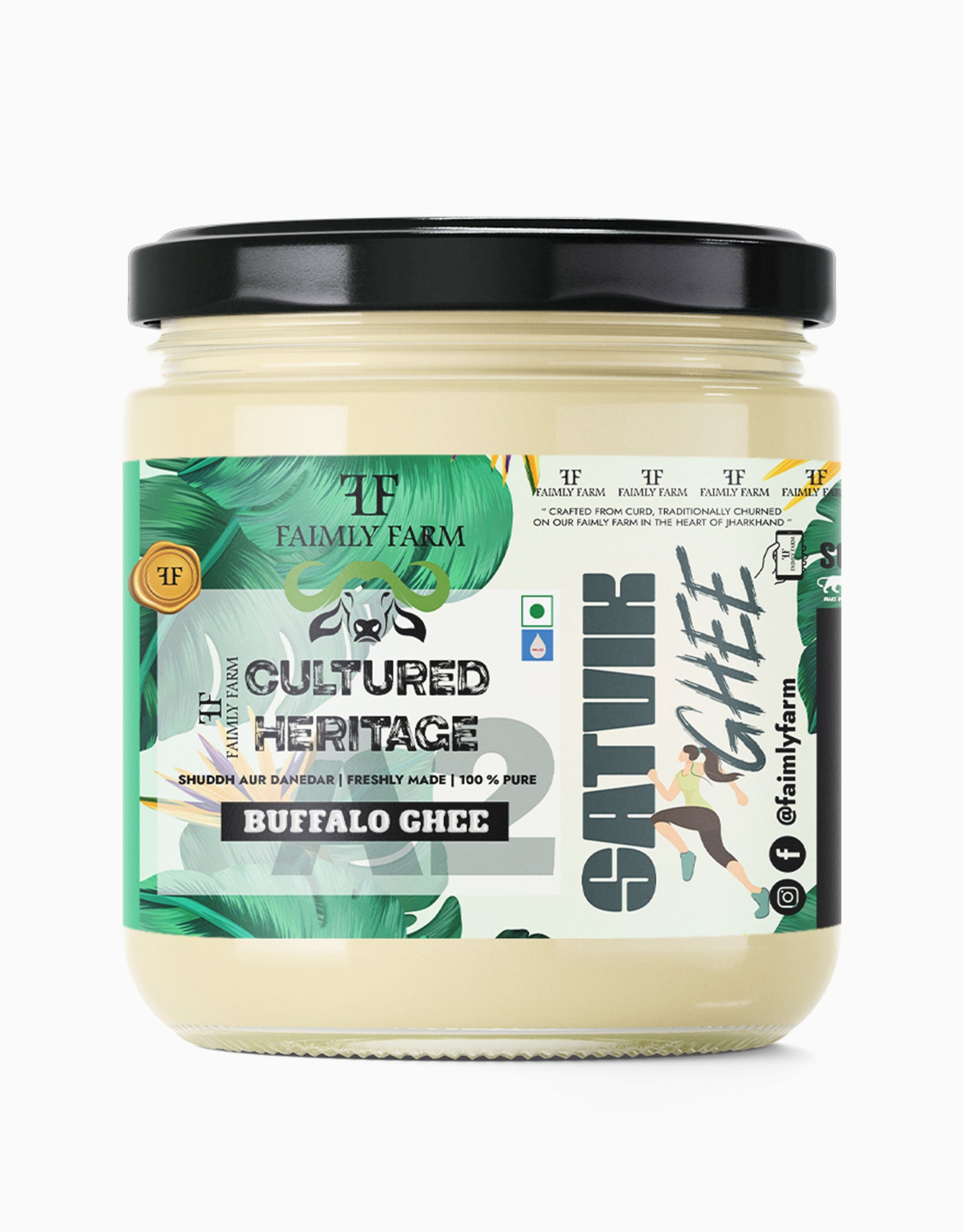 Faimly Farm (Cultural Heritage A2 Ghee) – Shuddh aur Danedar | Freshly Made | 100% Pure - Made from A2 buffalo milk, Cultural Heritage Ghee is prepared using the bilona process—cultured curd is churned to butter and gently slow-cooked in fresh batches. Its danedar texture, rich aroma, and deep flavor make it a nourishing addition to traditional satvik diets and rituals.