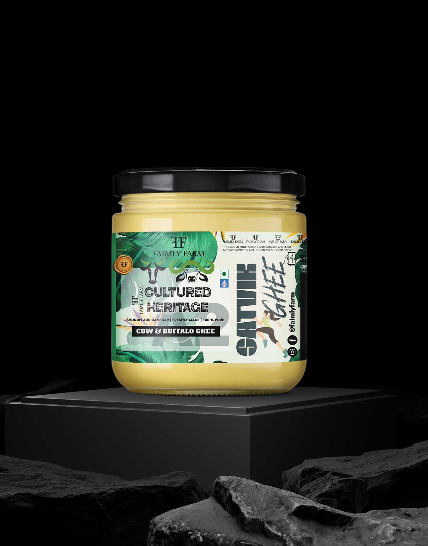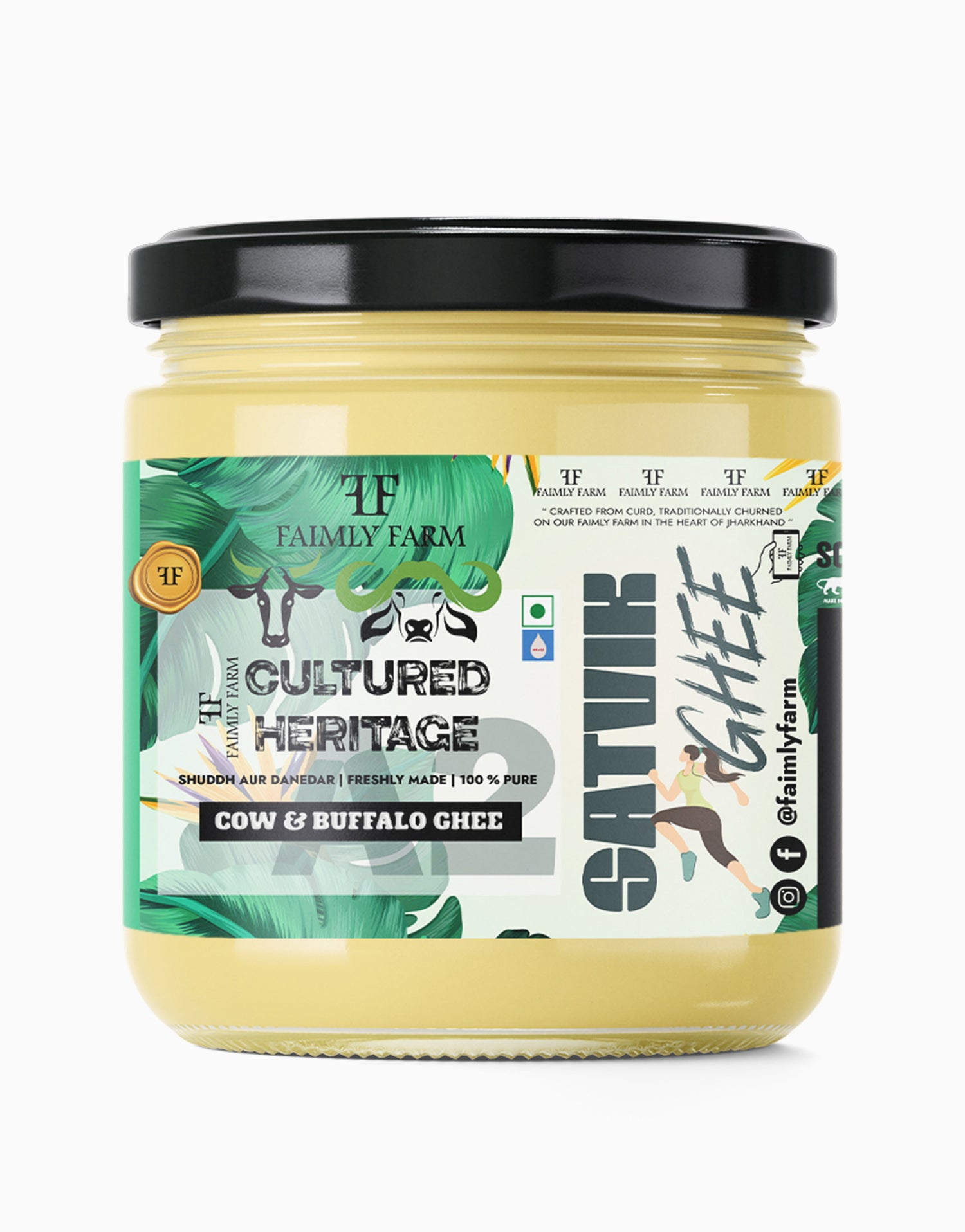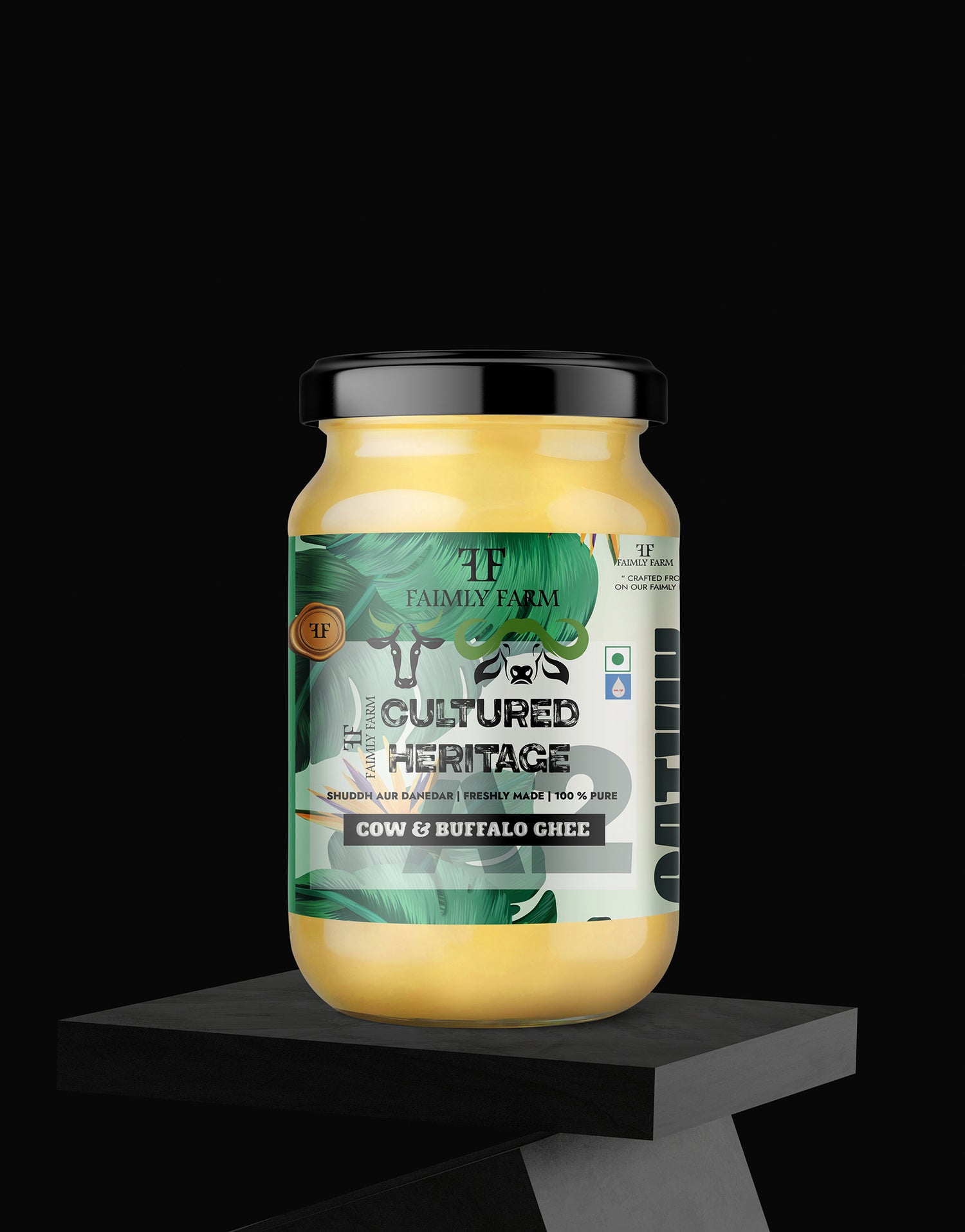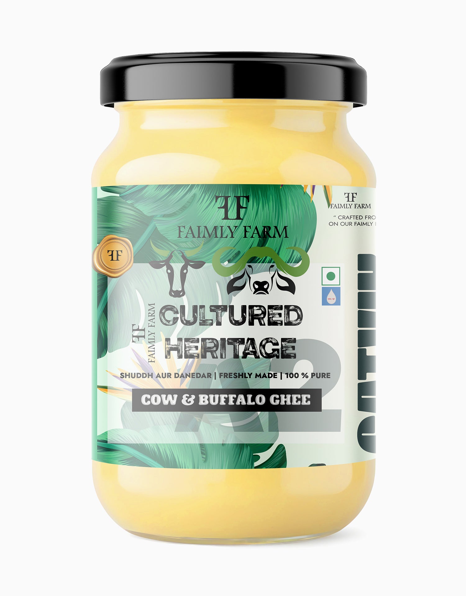 Faimly Farm (Cultural Heritage A2 Ghee) – Shuddh aur Danedar | Freshly Made | 100% Pure - A perfect blend of A2 cow milk and buffalo milk, this ghee is crafted by the traditional bilona method of curd-churning and slow-cooking to preserve its danedar (grainy) texture, golden hue, and rich aroma. Freshly prepared in small batches, it is 100% pure—ideal for puja rituals, fasting, authentic Indian cooking, and holistic wellness.