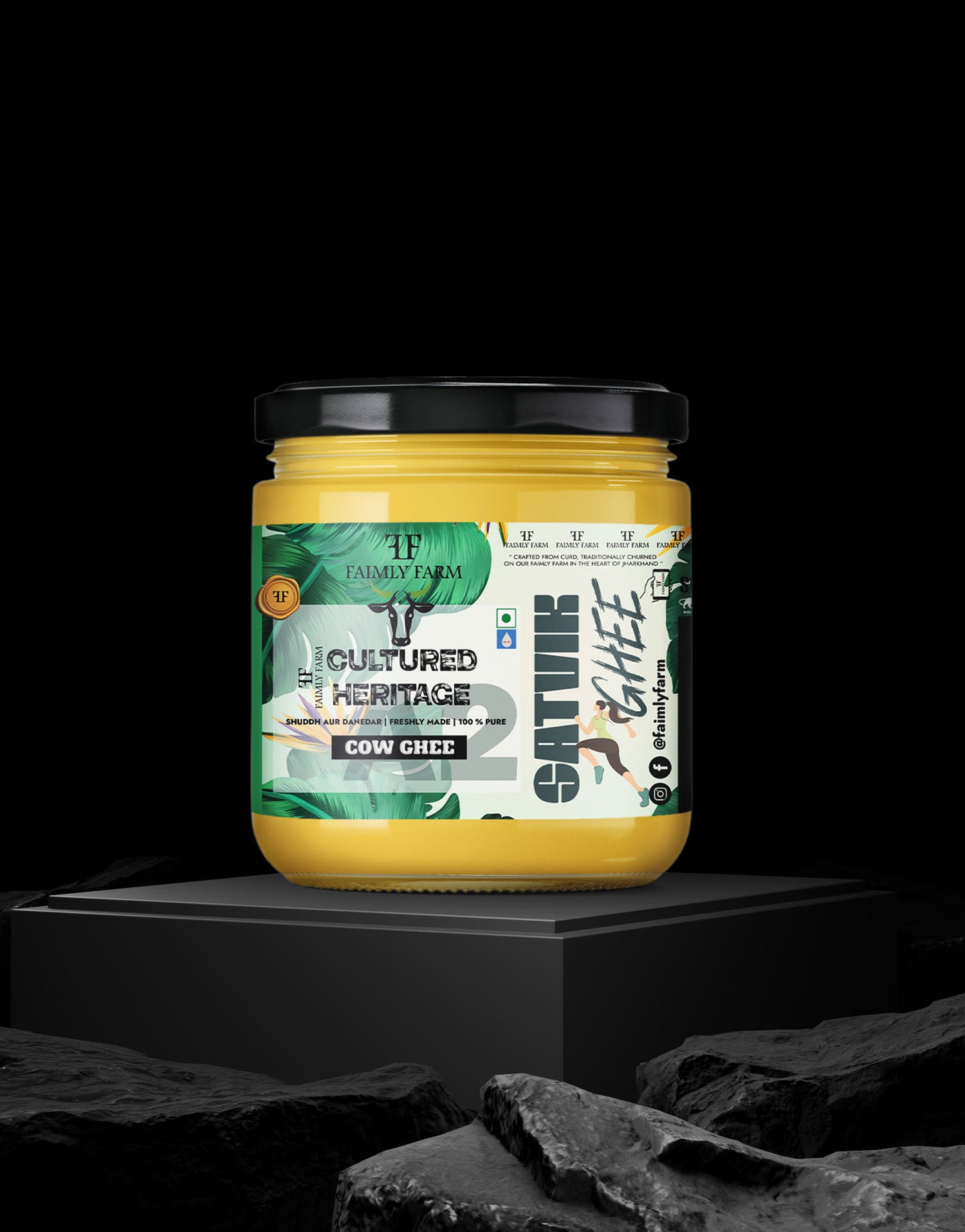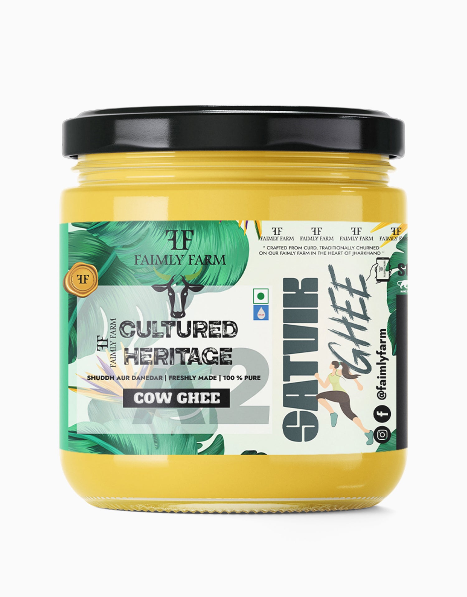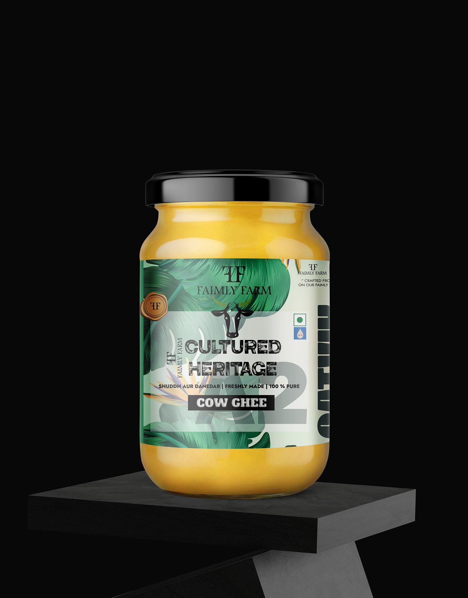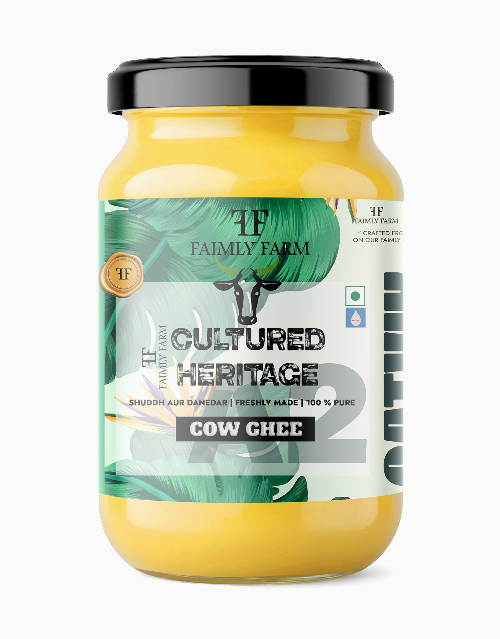 Faimly Farm (Cultural Heritage A2 Ghee) – Shuddh aur Danedar | Freshly Made | 100% Pure - Cultural Heritage A2 Cow Ghee is made using the traditional bilona method, where curd from desi A2 cow milk is hand-churned and slow-cooked to perfection. Its rich golden color, danedar (grainy) texture, and fresh aroma reflect purity at its finest.
