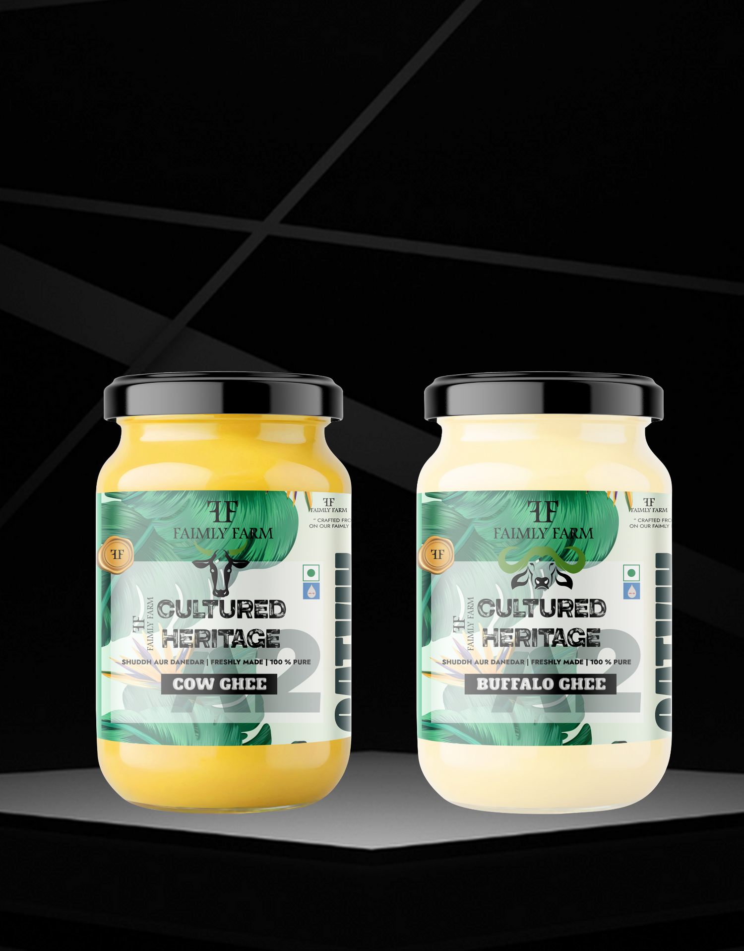 Faimly Farm (Cultural Heritage A2 Ghee) – Shuddh aur Danedar | Freshly Made | 100% Pure - Faimly Farm’s Cultural Heritage A2 Cow & Buffalo Ghee Combo is 100% Pure, Shuddh aur Danedar, and Freshly Made – a perfect match for puja, prasadam, and healthy desi cooking. Shop the satvik collection online now!