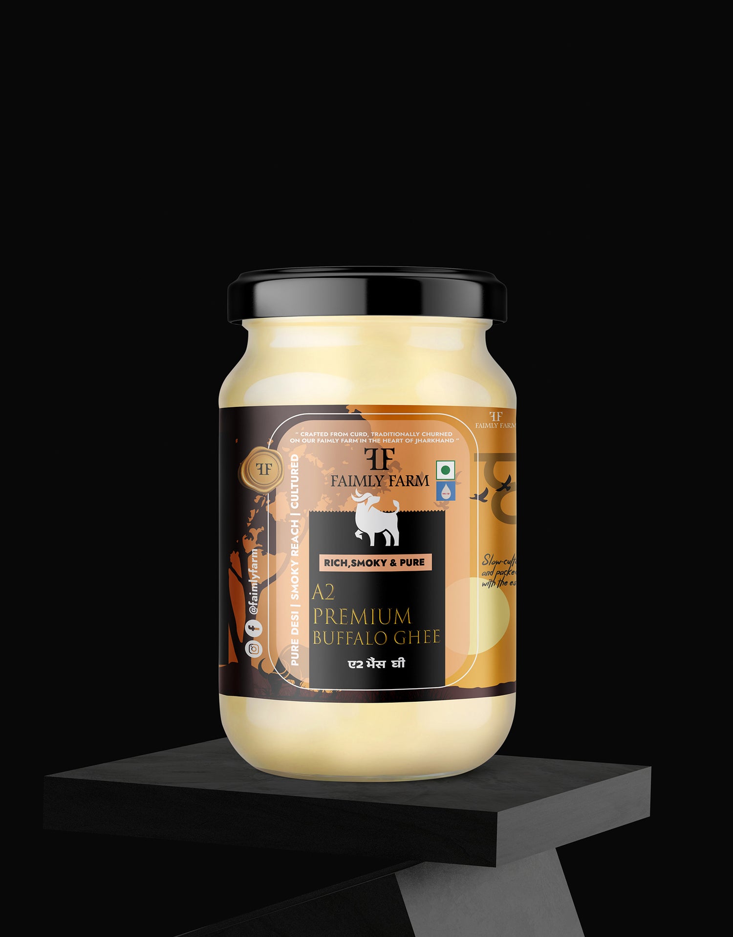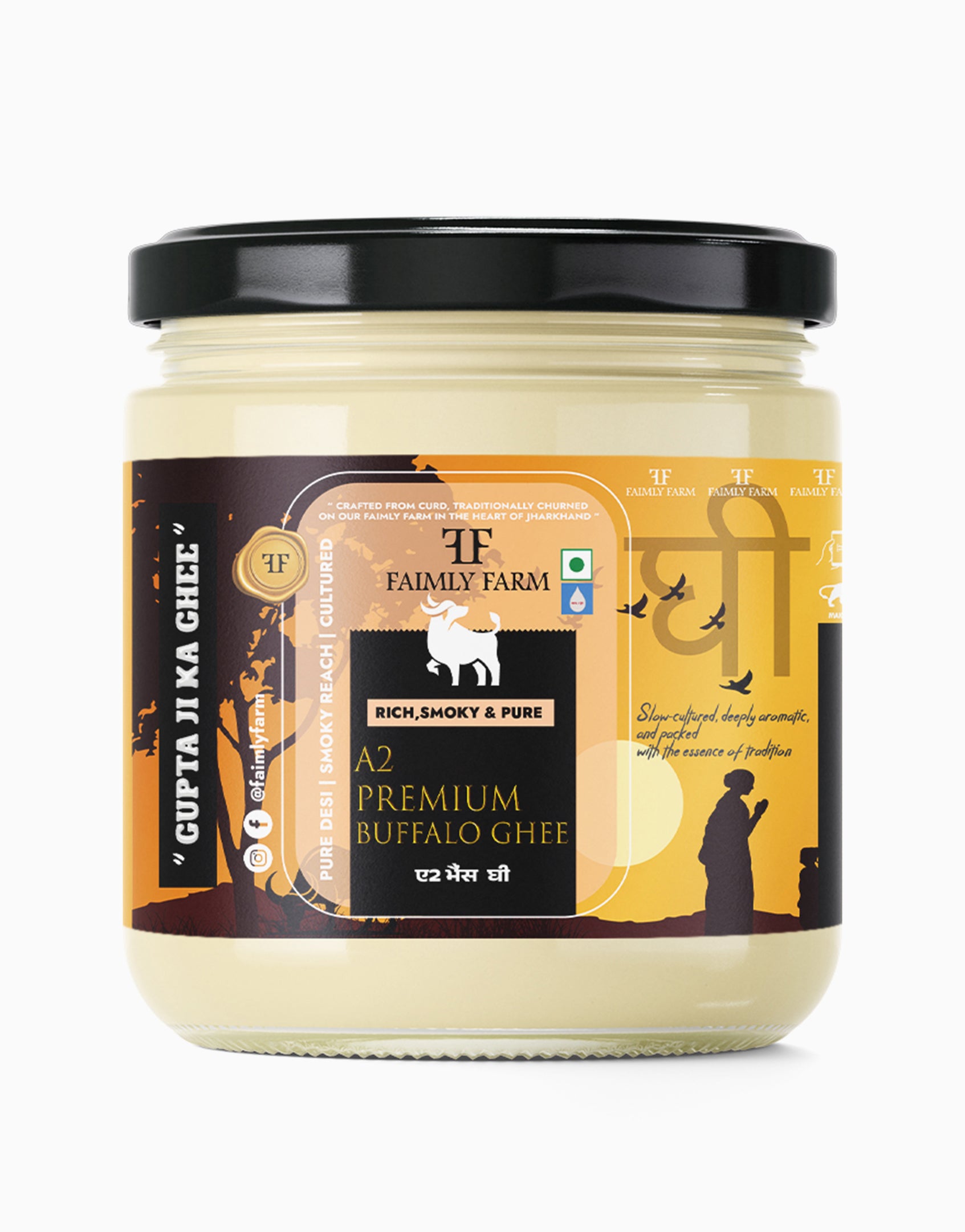 Faimly Farm (Freshly Cultured A2 Ghee) – Pure Desi | Smoky Reach | Cultured - Cultured A2 Buffalo Ghee Fresh and Premium is made from curd of desi buffalo milk using the ancient bilona method. The cultured curd is churned to butter and slow-cooked to create a thick, danedar ghee with bold smoky flavor and deep nourishment.