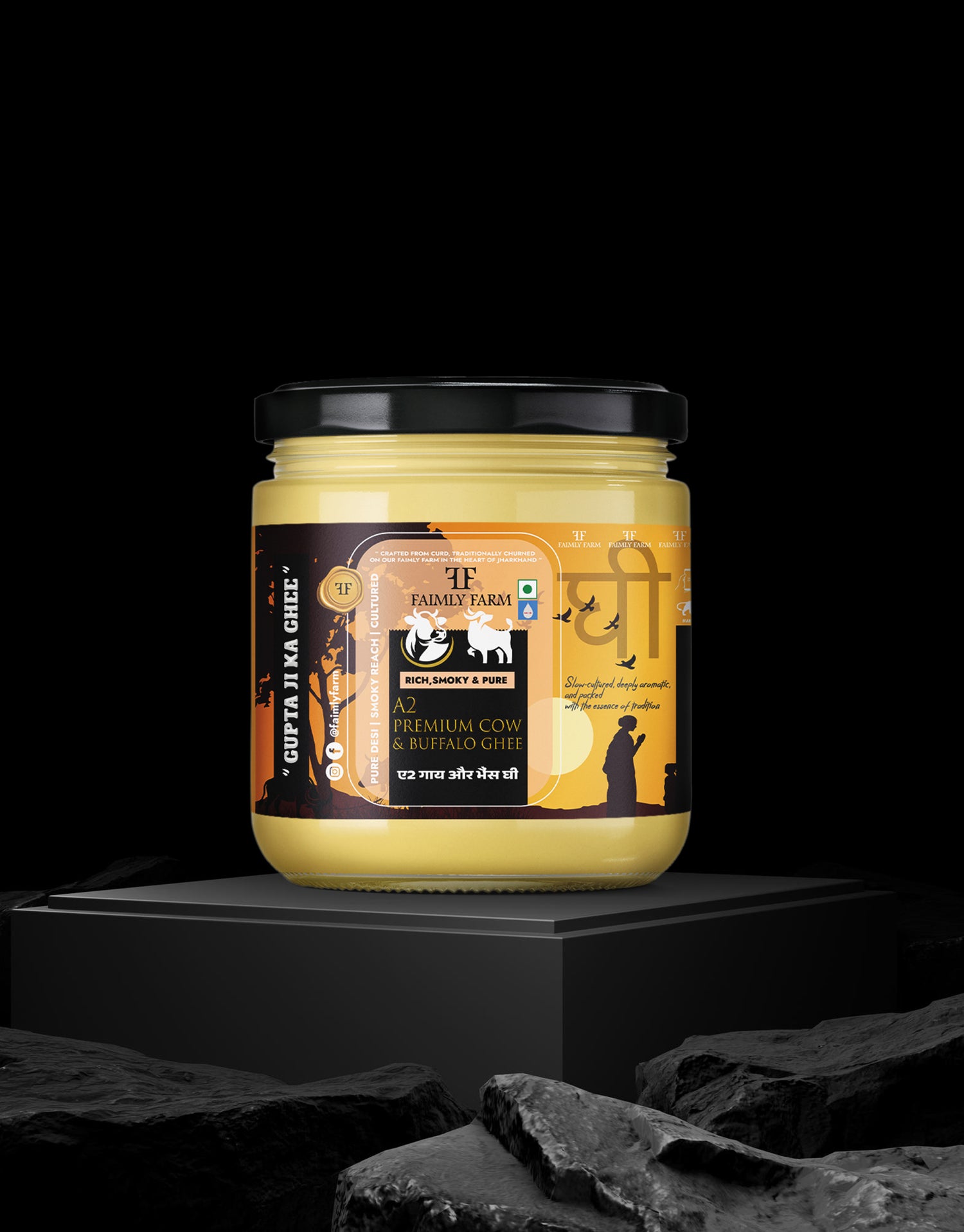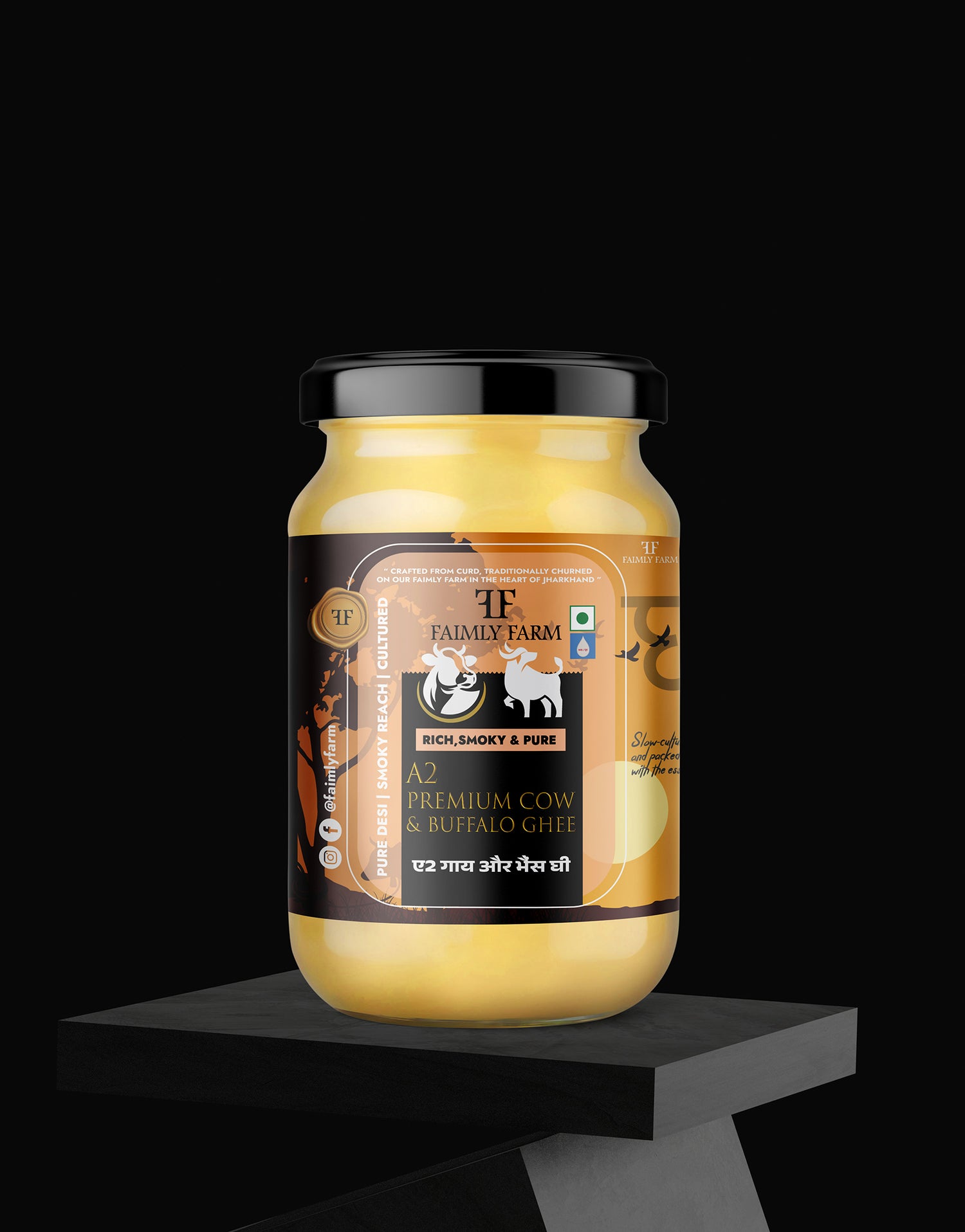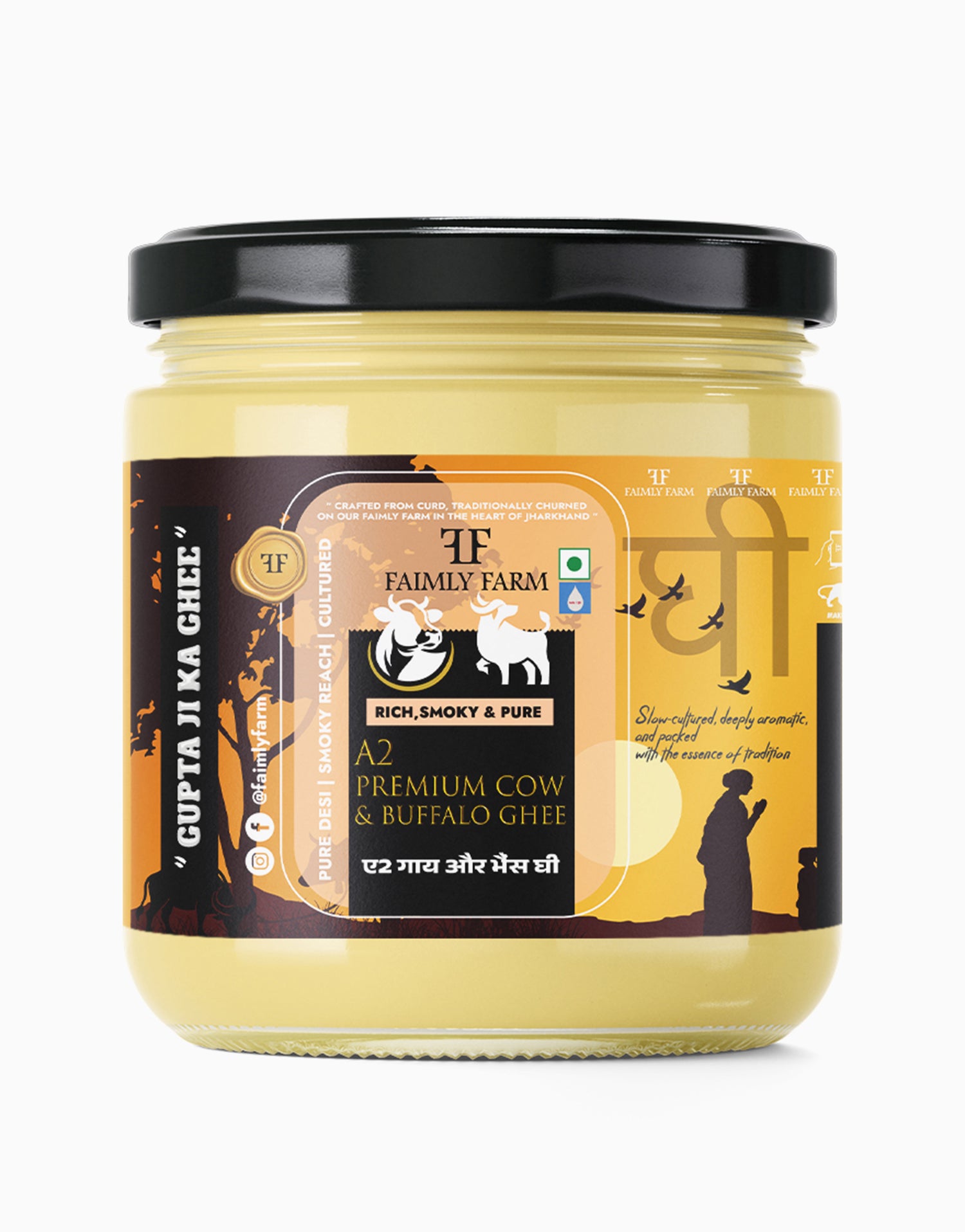 Faimly Farm (Freshly Cultured A2 Ghee) – Pure Desi | Smoky Reach | Cultured - Cultured A2 Cow & Buffalo Blend Ghee Fresh and Premium is crafted from curd of native desi cow and buffalo milk using the traditional bilona method. Slow-cooked to a smoky finish, it offers a rich aroma, danedar texture, and balanced nutrition.