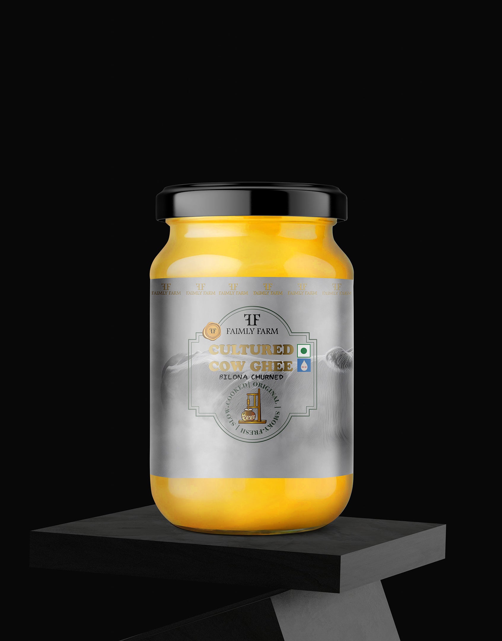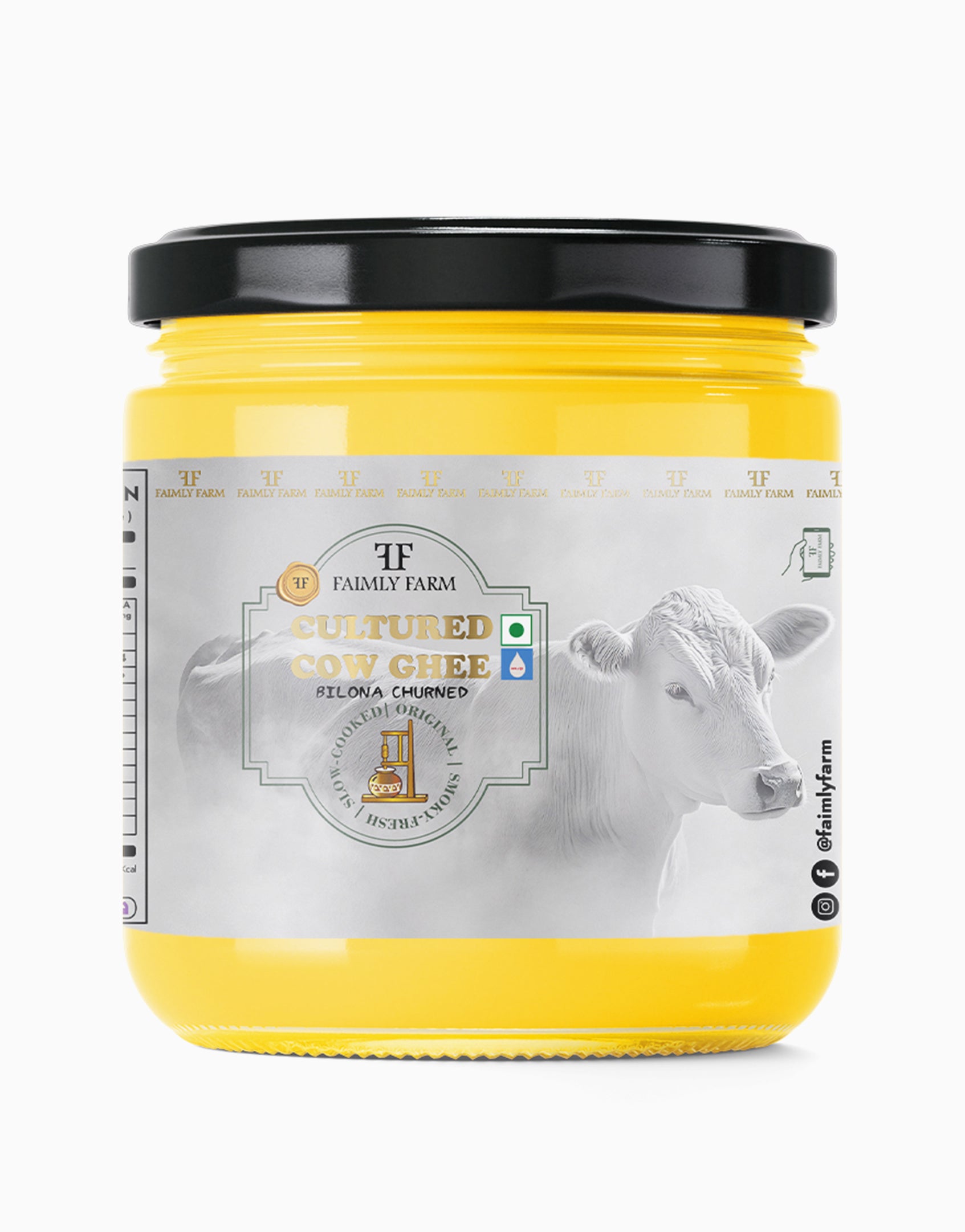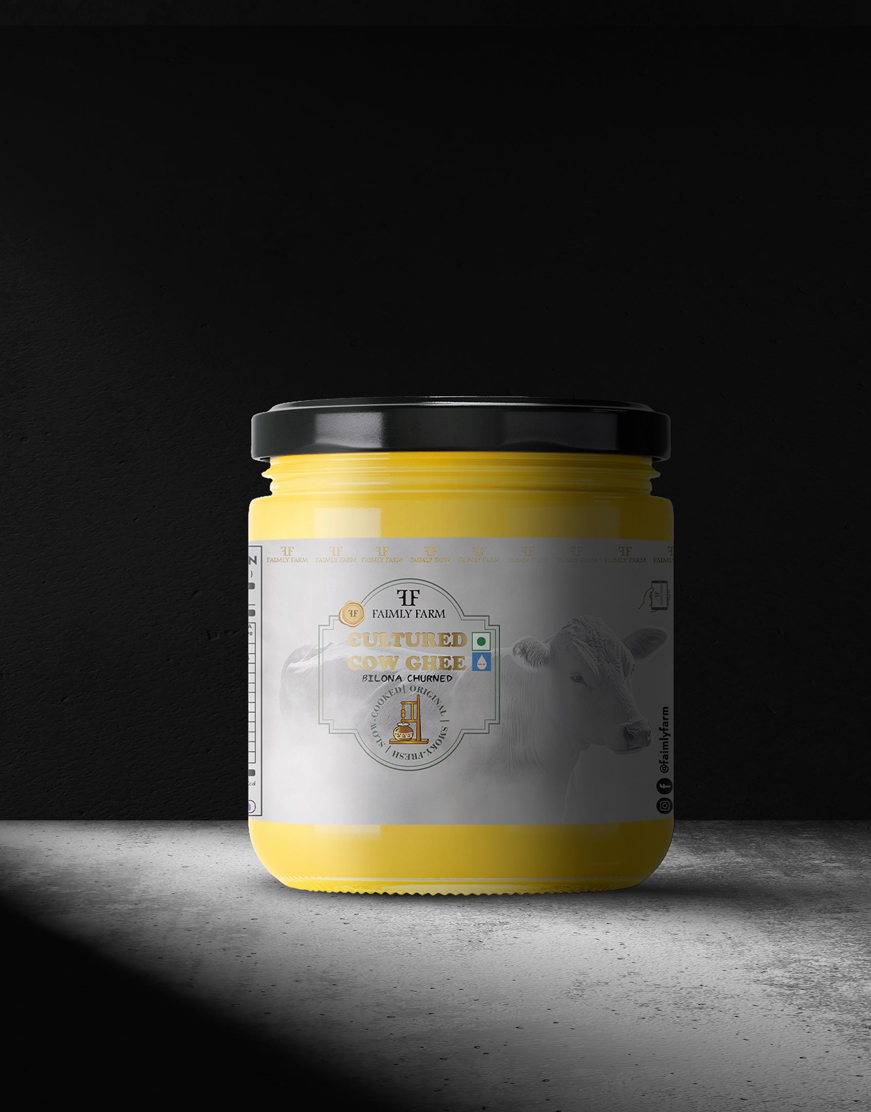 Cultured Cow Ghee from Faimly Farm is a slow-cooked, hand-churned ghee made from curd-based butter using traditional methods. It features a smoky aroma, rich danedar texture, and deep golden hue, reflecting purity and small-batch craftsmanship.