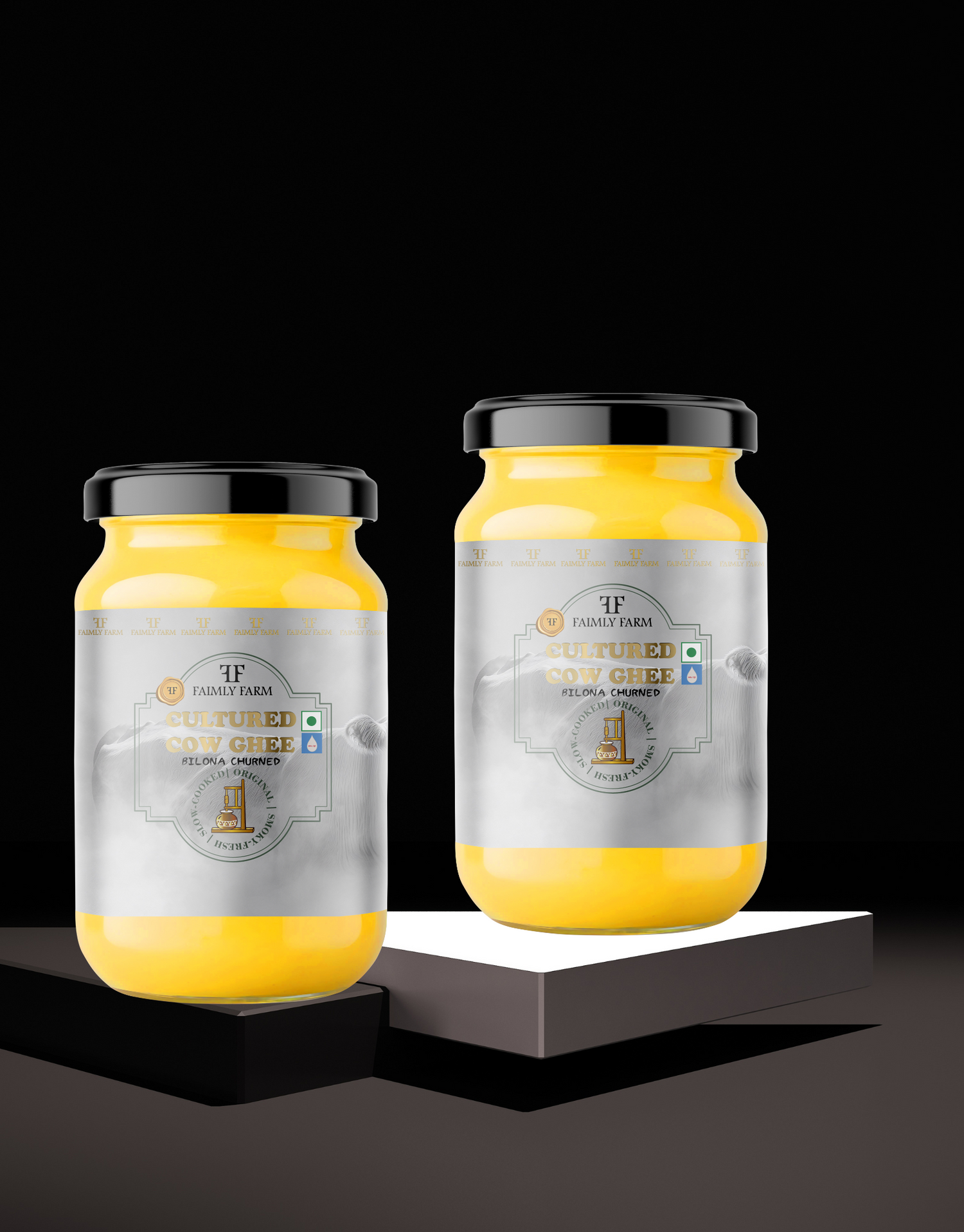 Faimly Farm Cultured Cow Ghee Faimly Combo is a premium, slow-cooked, smoky-fresh ghee made from the milk of forest-grazed cows using traditional hand-churned Bilona methods. This cultured ghee combo offers ancestral richness and digestive wellness in every spoonful. Rich in fat-soluble vitamins and natural antioxidants, it supports enhanced metabolism, immunity, and energy. Perfect for authentic Indian cooking and holistic health, this chemical-free, handcrafted ghee blend brings natural goodness and heritage quality to your kitchen.
