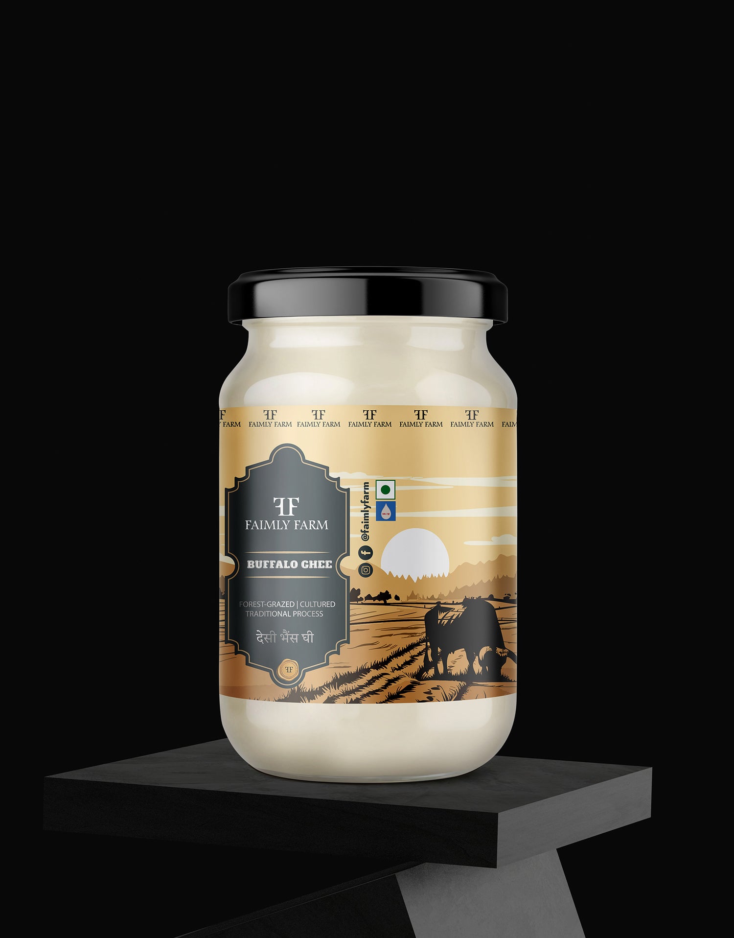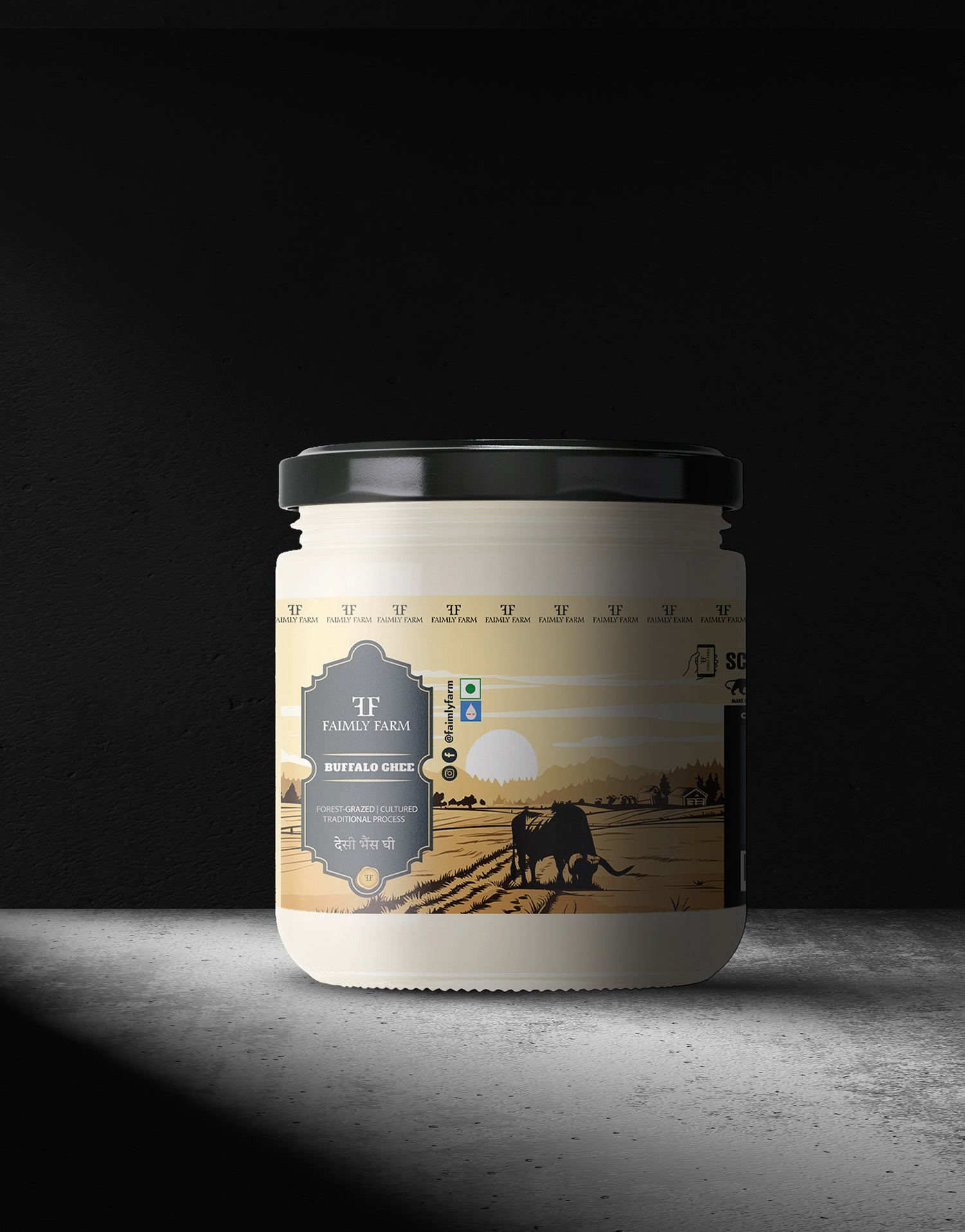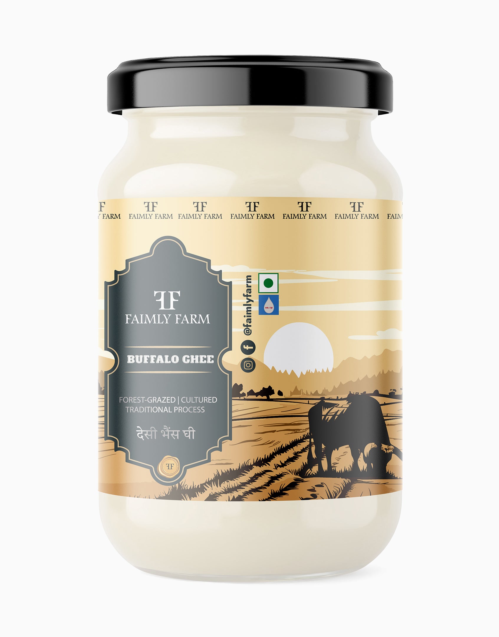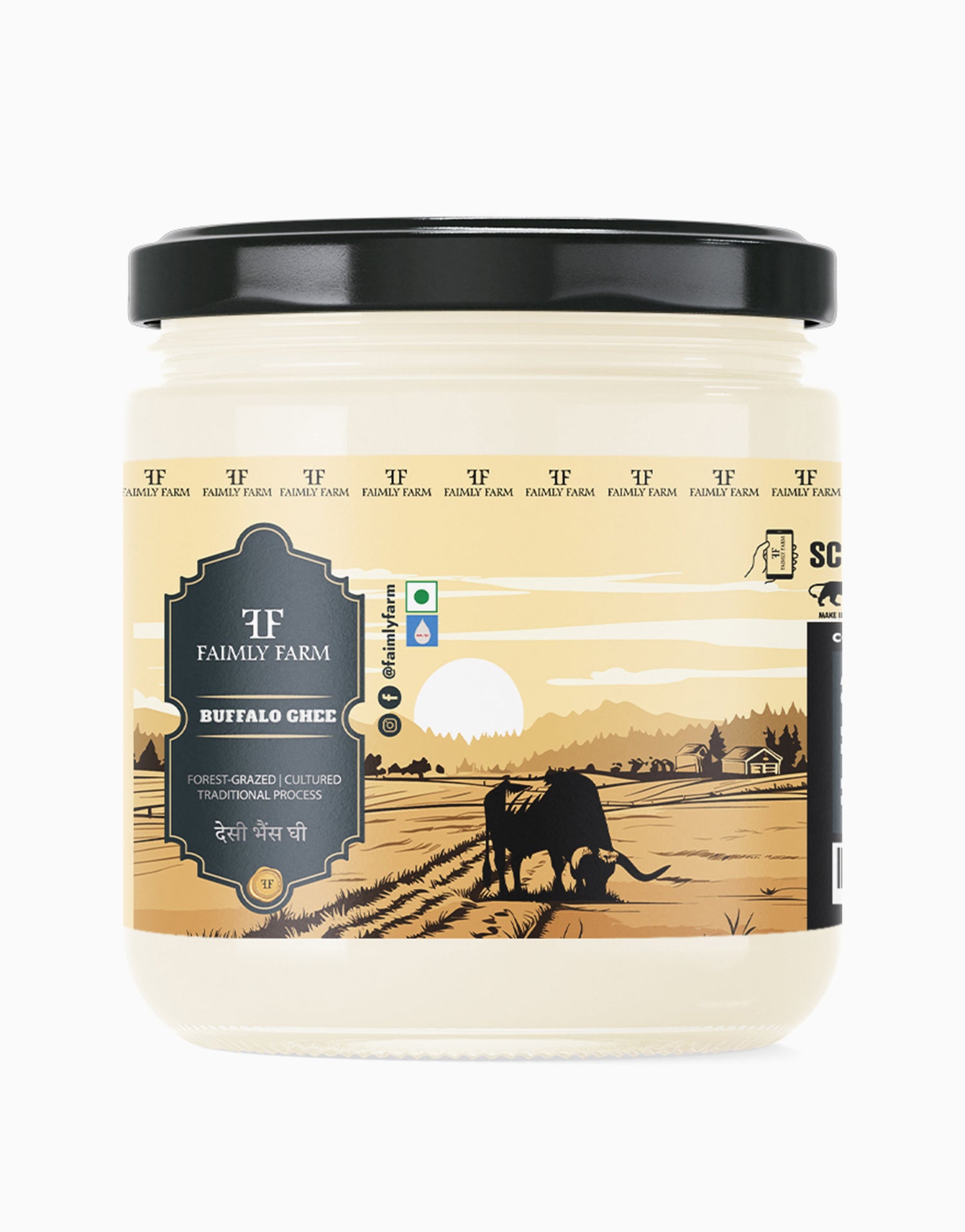 Desi Buffalo Ghee from Faimly Farm is a pure premium ghee made from the curd of forest-grazed buffalo milk, churned using the traditional Bilona method. Slow-cooked with care, it preserves a thick, grainy texture, bold aroma, and rich, full flavor.
