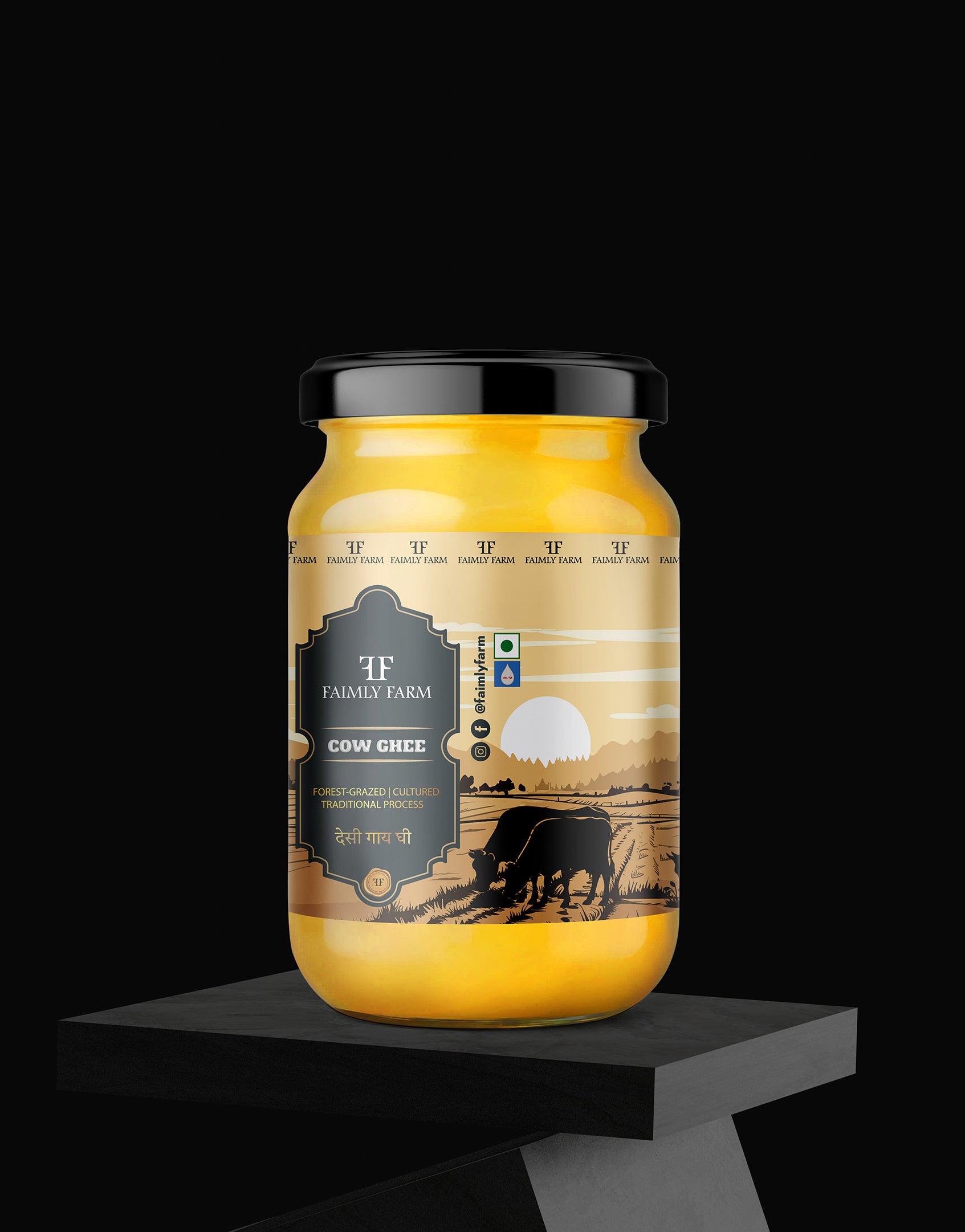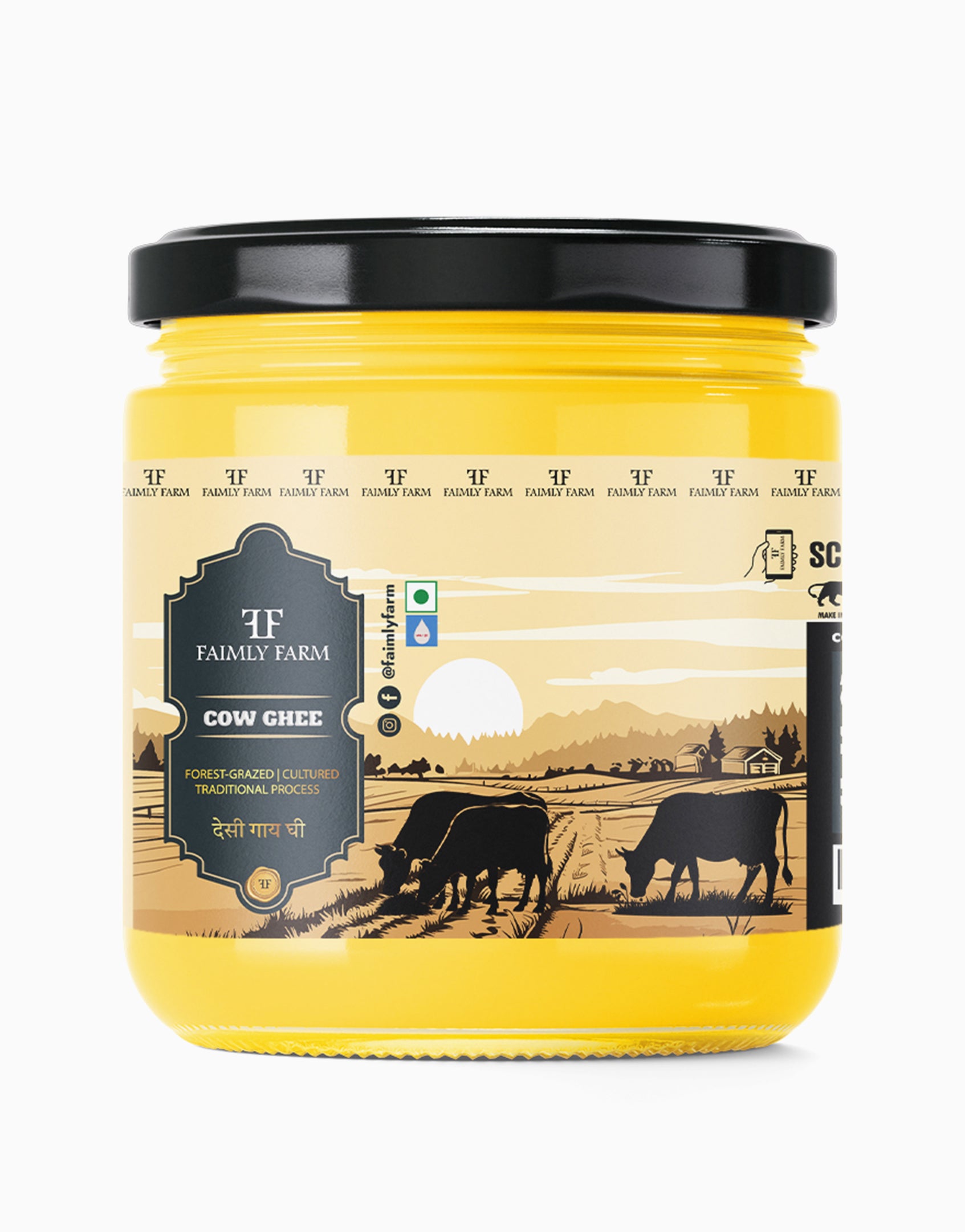 Desi Cow Ghee from Faimly Farm is a pure premium ghee prepared from the milk of forest-grazed Indian cows. The milk is cultured into curd and churned using the ancient Bilona method, followed by slow cooking in traditional vessels to preserve its authentic character.