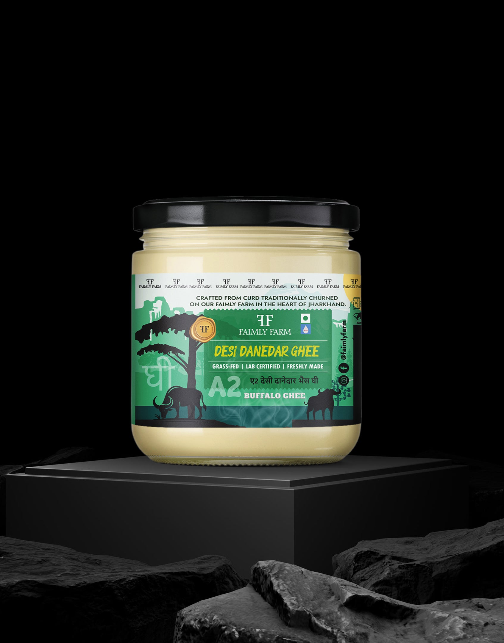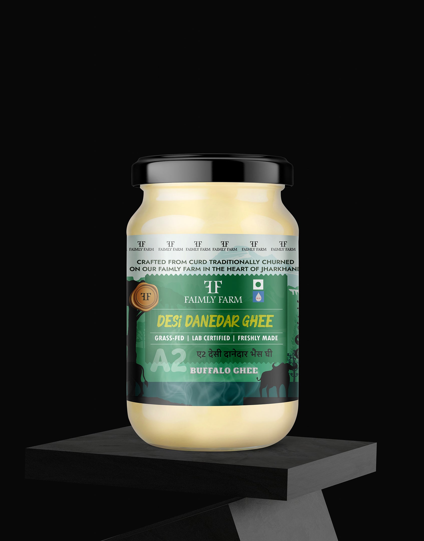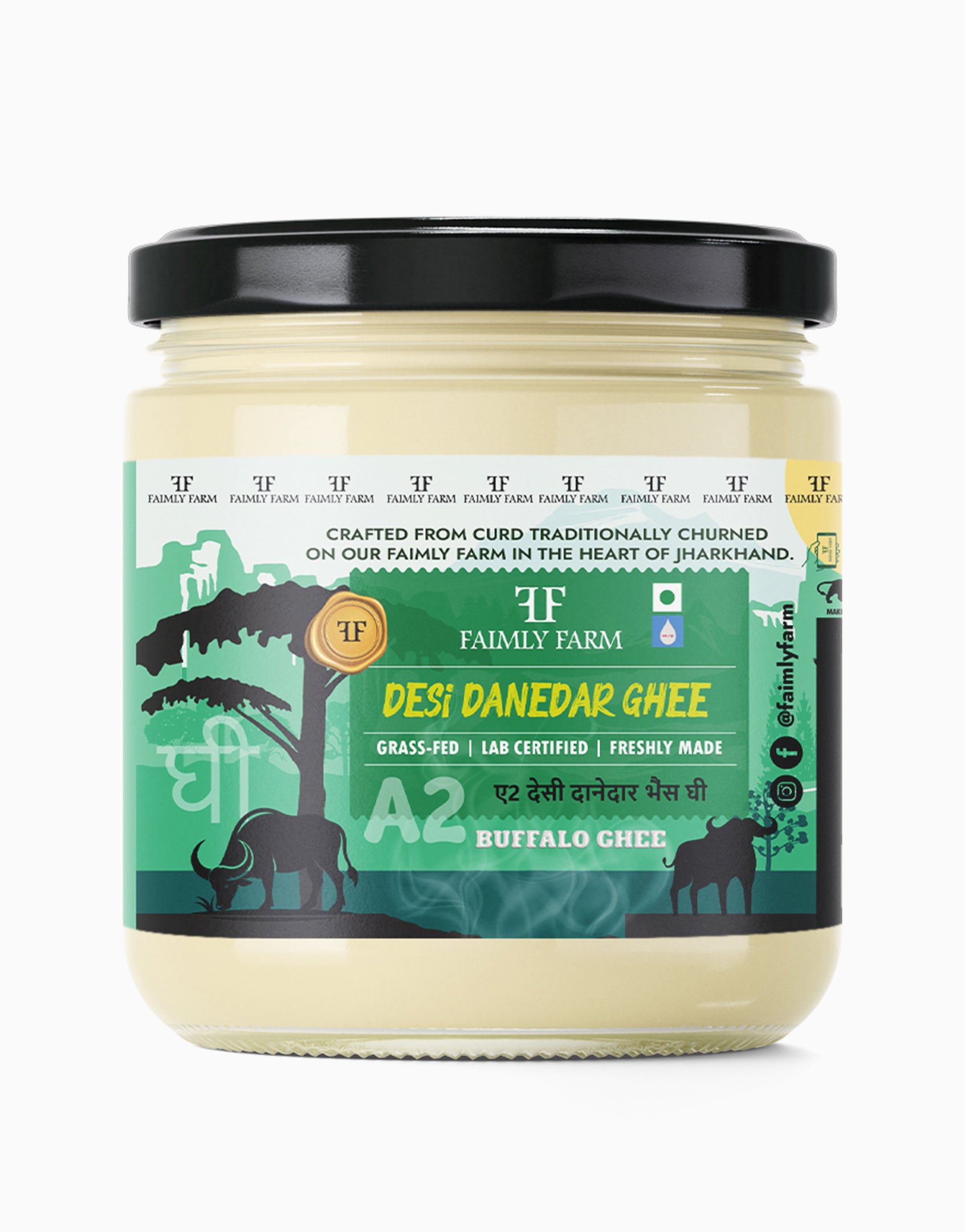 Faimly Farm (Desi Danedar A2 Ghee) – Forest Grazed | Crafted with Traditional | Natural Pure - Desi Danedar A2 Buffalo Ghee is handcrafted from the A2 milk of forest-grazed buffaloes, raised naturally without chemicals or industrial feed. Prepared in villages using the time-honored bilona method, this ghee develops a bold, grainy (danedar) texture and deep, robust flavor.
