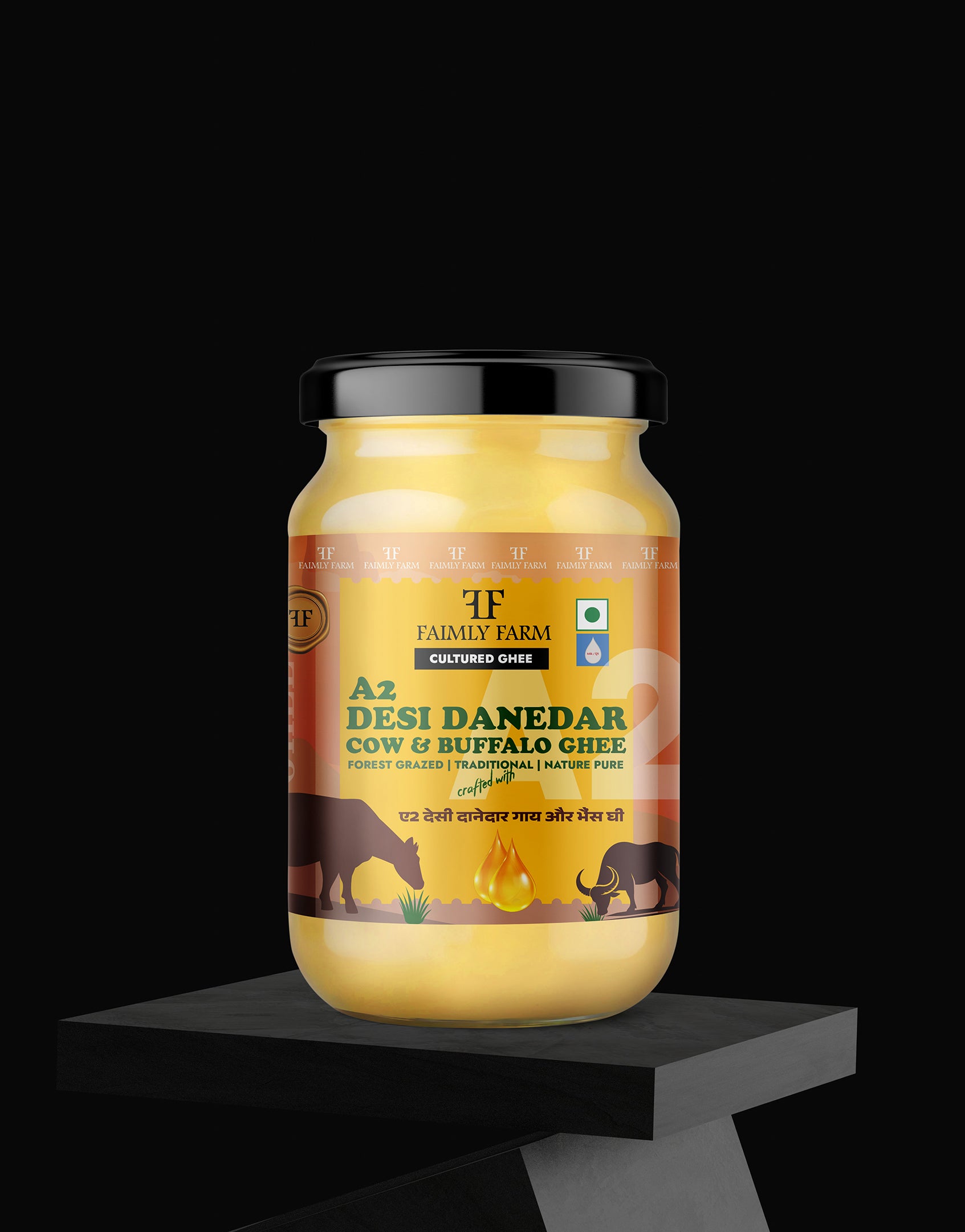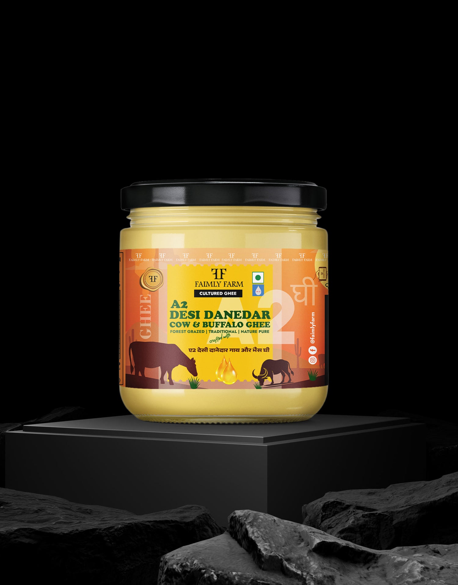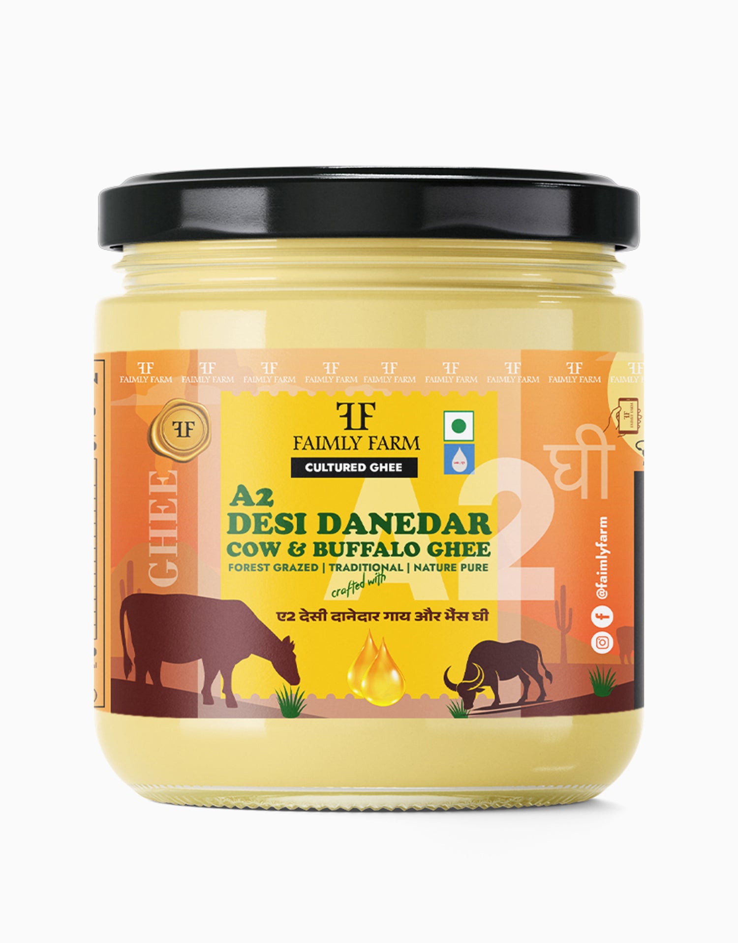 Faimly Farm (Desi Danedar A2 Ghee) – Grass-Fed | Lab Certified | Freshly Made - Desi Danedar A2 Cow & Buffalo Ghee is a wholesome blend of grass-fed A2 cow and buffalo milk. Using the traditional bilona method, curd is churned and slow-cooked to deliver a danedar (grainy), aromatic ghee. This ghee offers the lightness of cow ghee and the richness of buffalo ghee—lab tested for purity and perfect for cooking, rituals, and wellness.