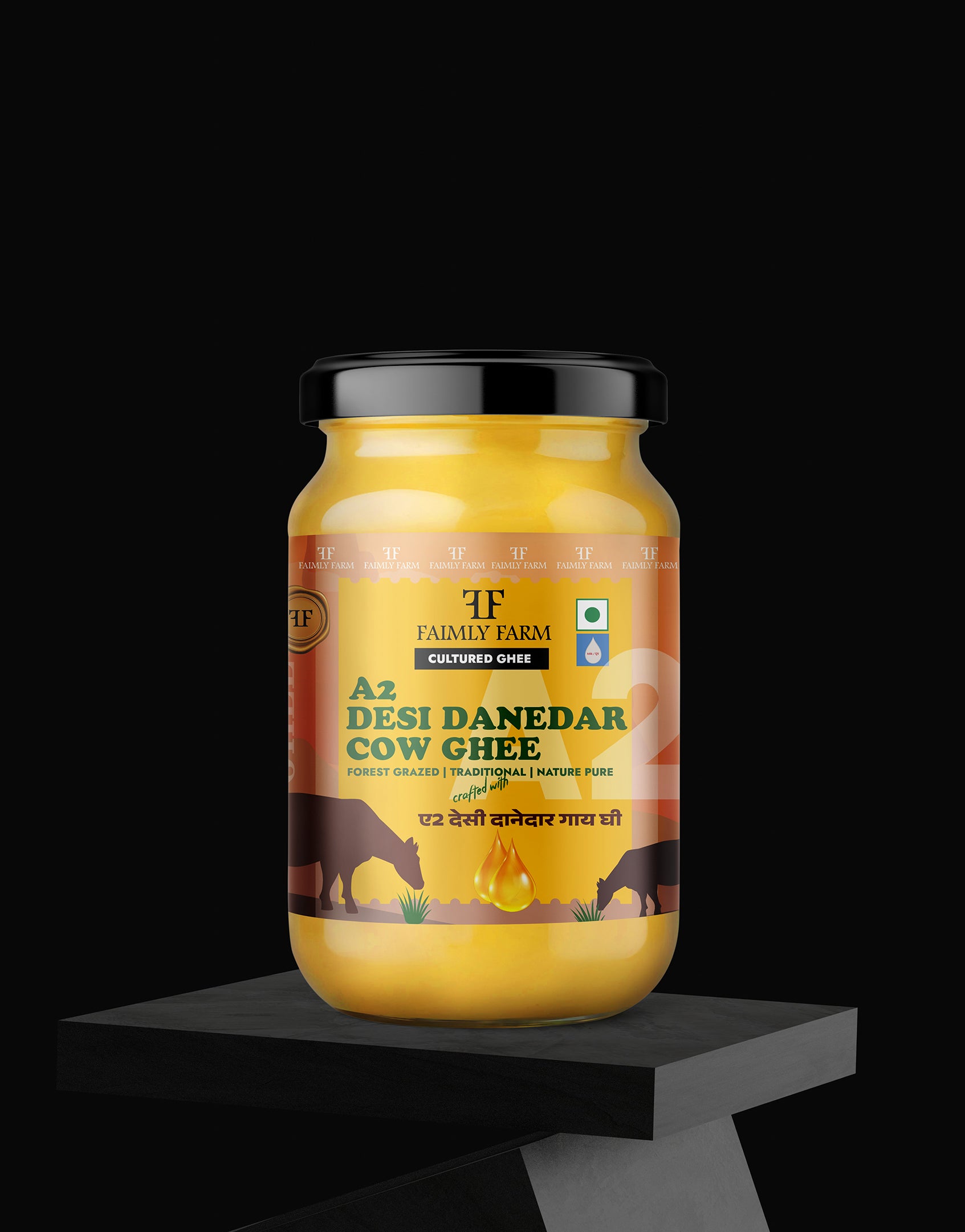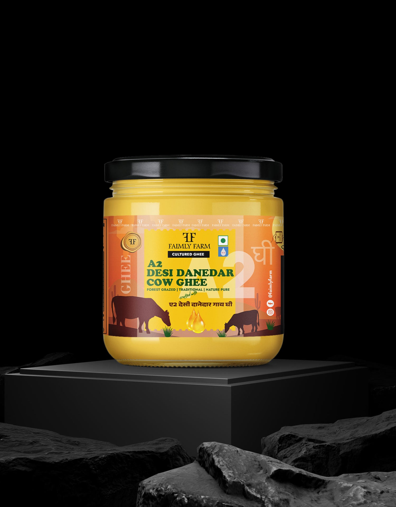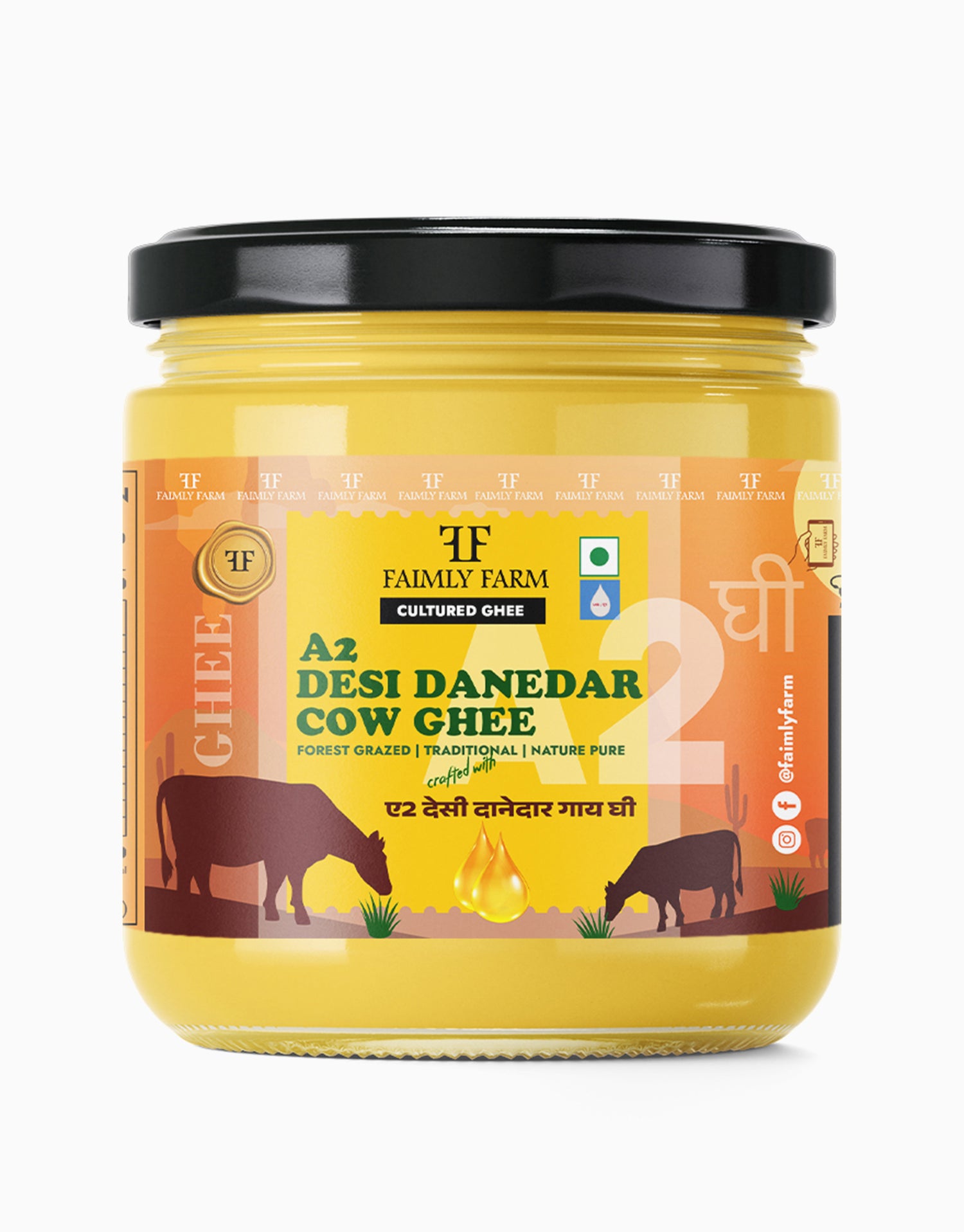 Faimly Farm (Desi Danedar A2 Ghee) – Grass-Fed | Lab Certified | Freshly Made - Desi Danedar A2 Cow Ghee is made from the A2 milk of grass-fed desi cows, using the traditional bilona method. The curd is hand-churned into butter and slow-cooked in small batches to create a rich, golden, danedar (grainy) ghee. Lab tested for purity and safety, it's ideal for cooking, Ayurveda, rituals, and daily nourishment.