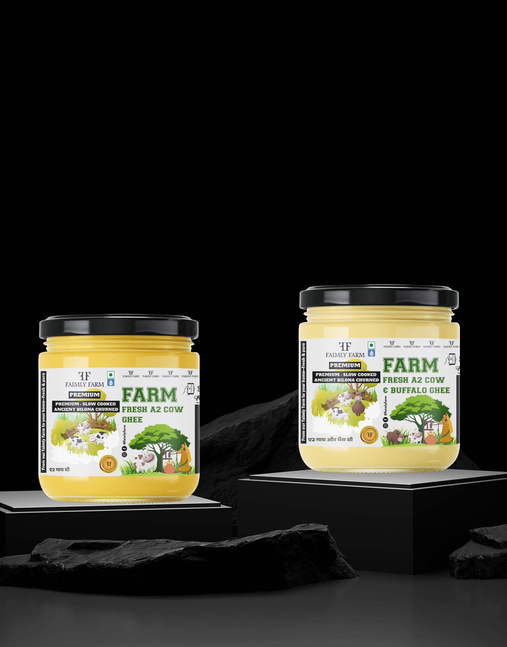 Faimly Farm (Desi Danedar A2 Ghee) – Grass-Fed | Lab Certified | Freshly Made - Enjoy balanced flavor and nourishment with Faimly Farm’s Desi Danedar A2 Ghee Combo – Cow Ghee and Cow & Buffalo Ghee, both Grass-Fed and Lab Certified. Danedar, fresh, and full of desi aroma. Buy now!