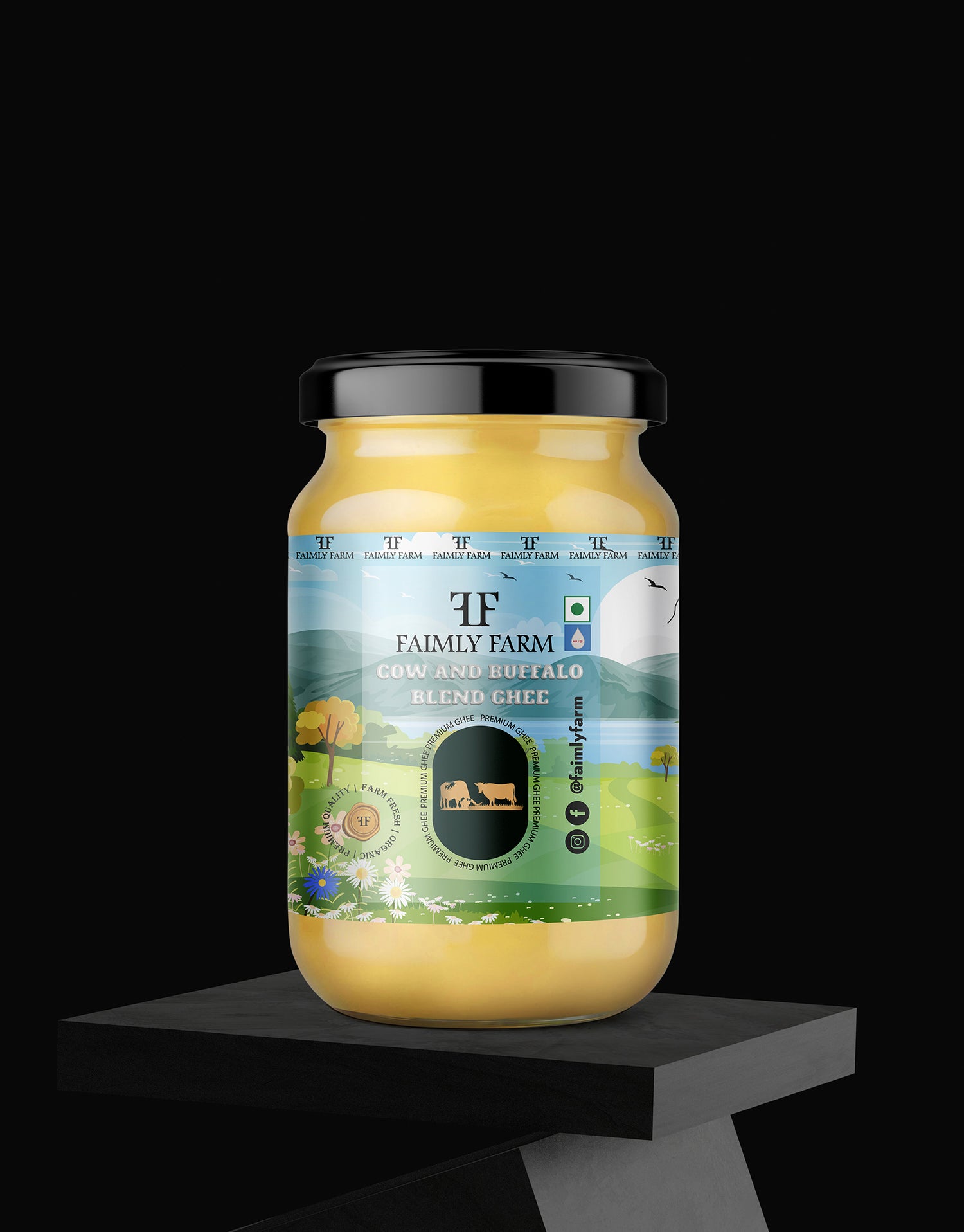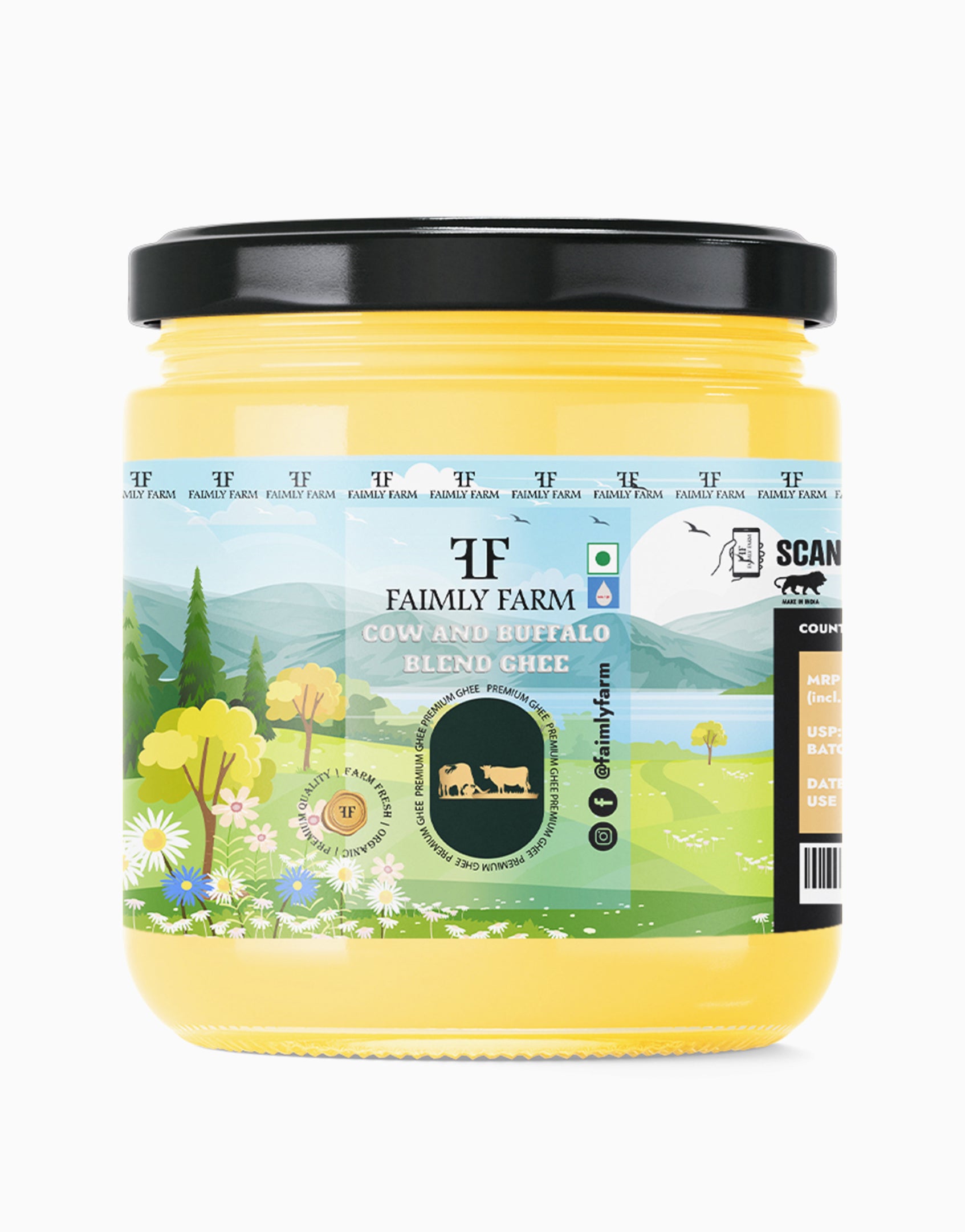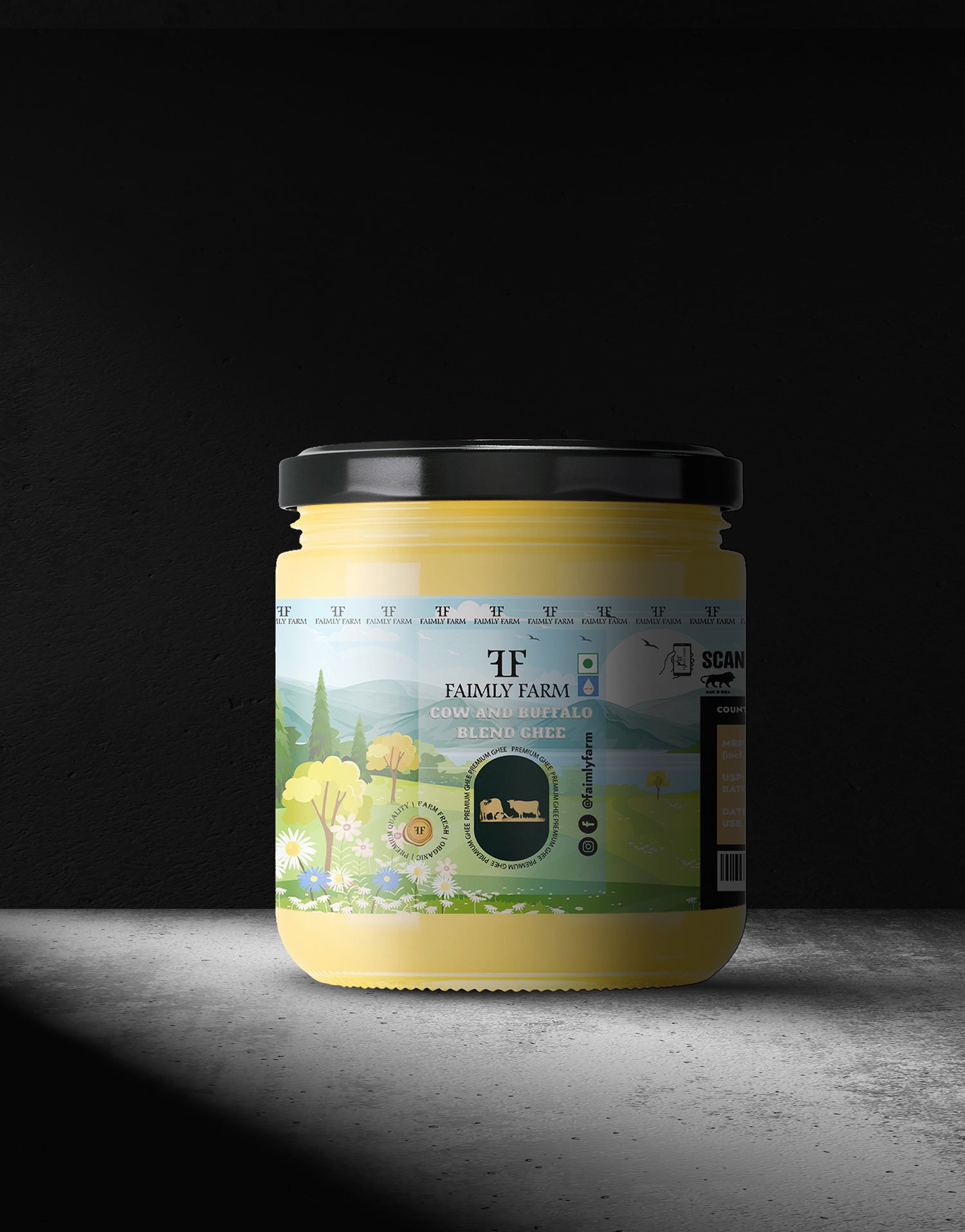 Farm Fresh Cow & Buffalo Blend Ghee from Faimly Farm is a unique mix of organic, farm-fresh cow and buffalo milk ghee, crafted in small batches using slow-cook methods. This blend combines the light, aromatic qualities of cow ghee with the creamy richness and bold taste of buffalo ghee, offering a perfect balance of flavor and nutrition.
