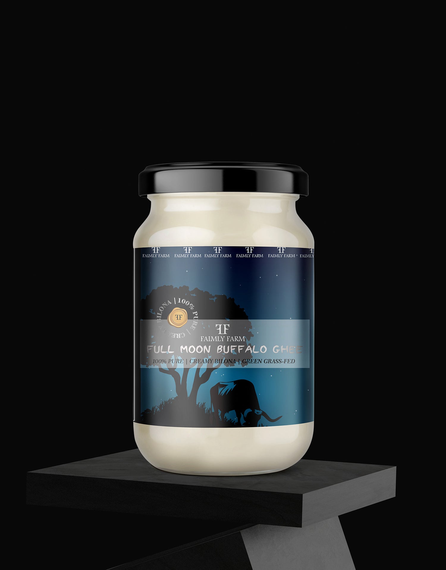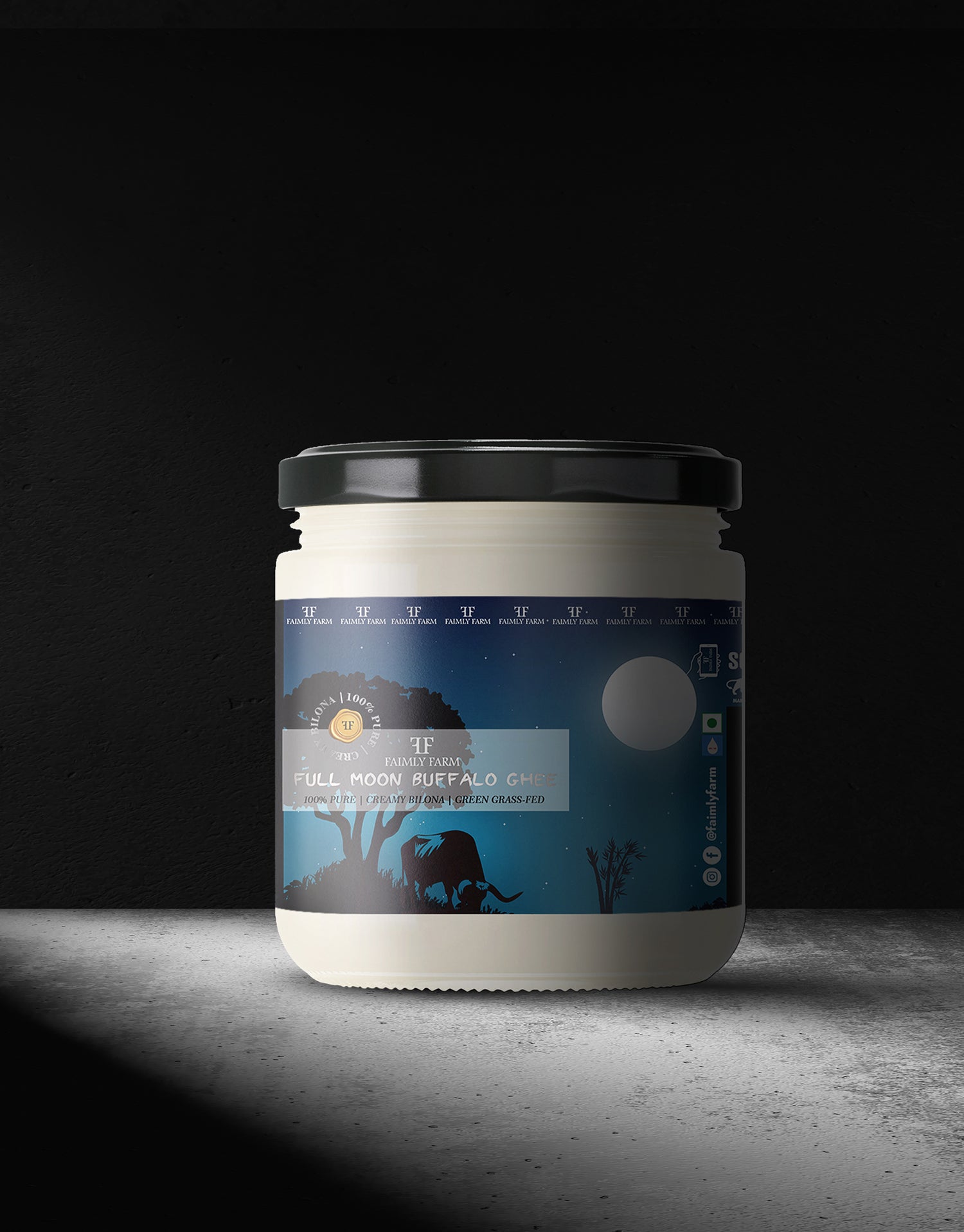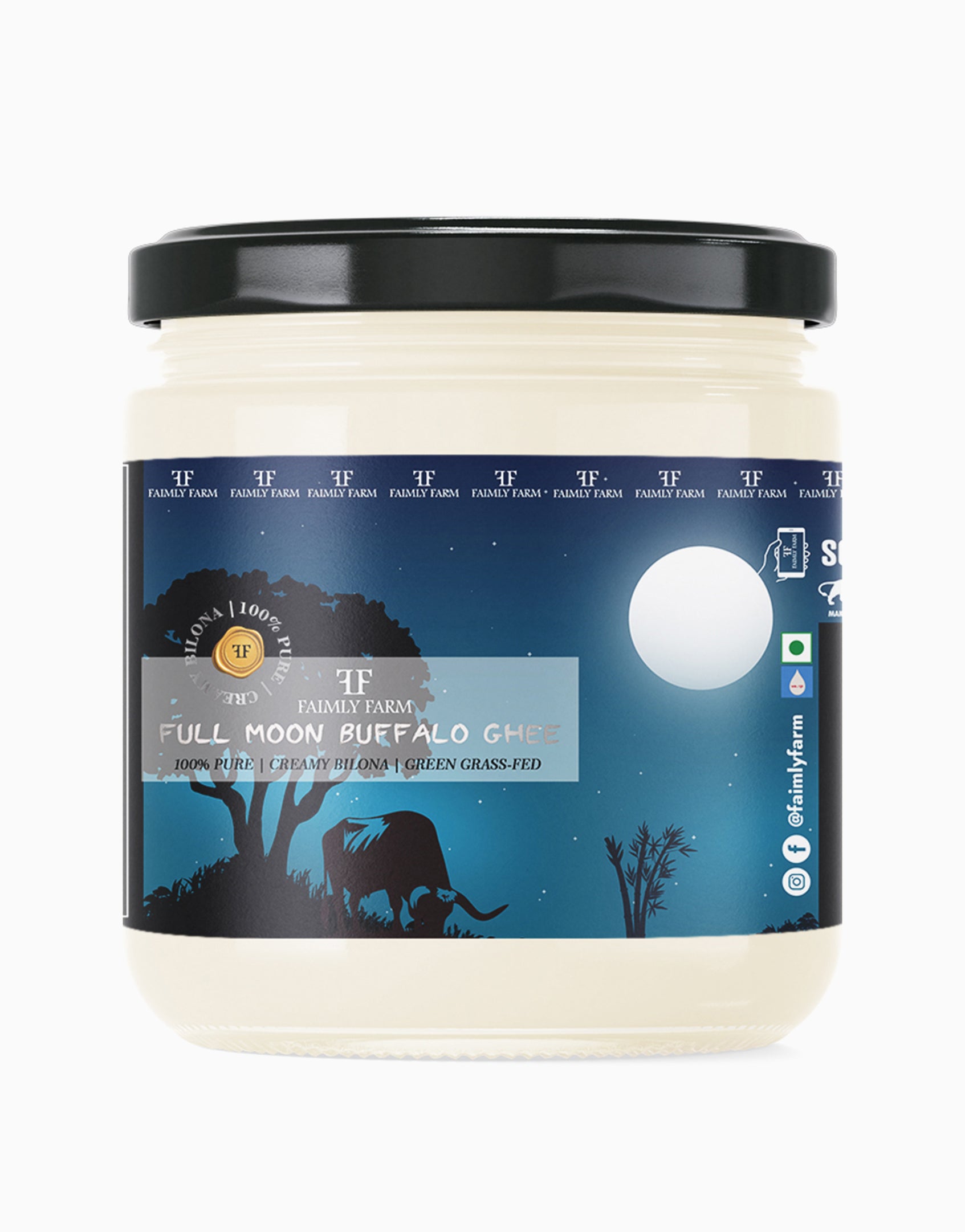 Full Moon Buffalo Ghee from Faimly Farm is a special edition, hand-churned ghee made during the full moon using cream-rich bilona butter from green grass-fed buffalo milk. Slow-cooked using traditional methods, it delivers a dense, danedar texture, rich aroma, and deep flavor.