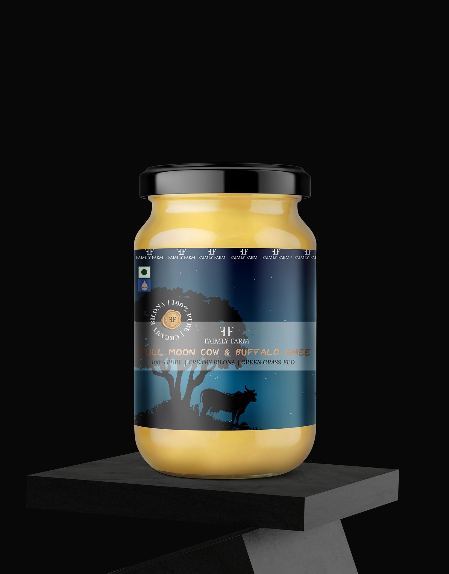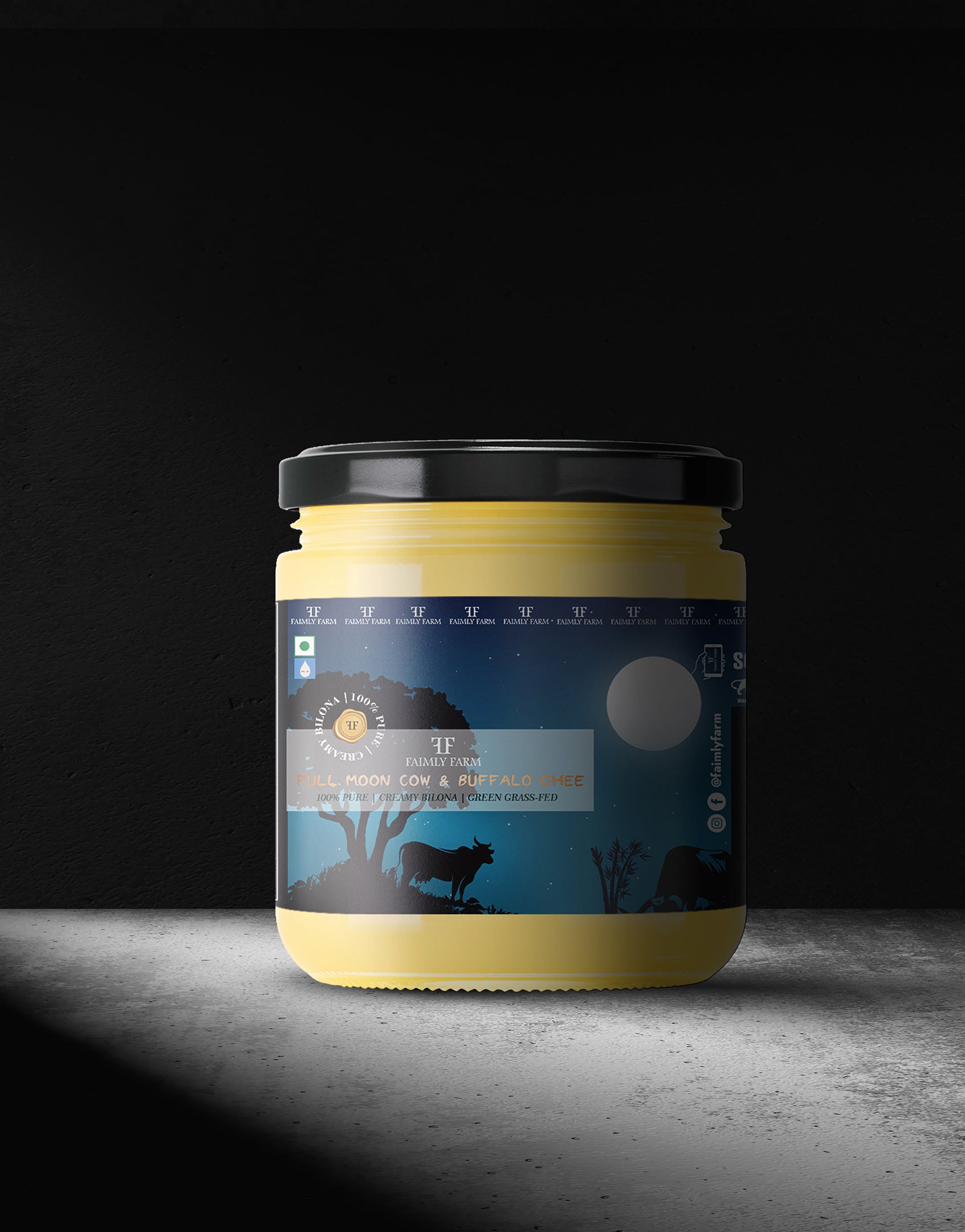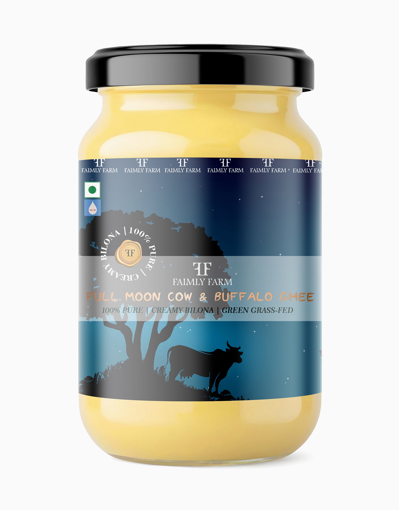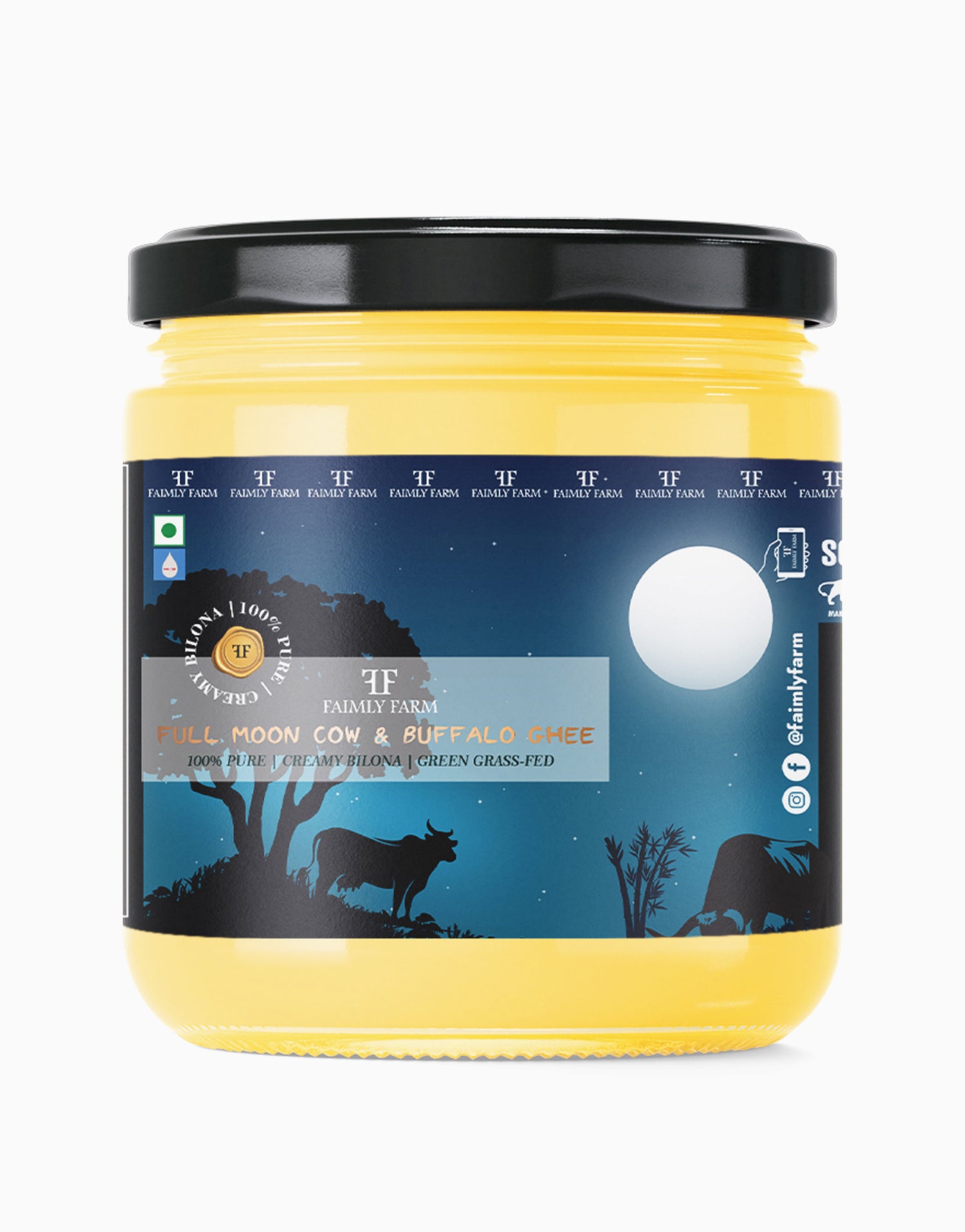 Full Moon Cow & Buffalo Blend Ghee from Faimly Farm is a premium, hand-churned ghee made from a balanced blend of green grass-fed cow and buffalo milk. Crafted during the Purnima (Full Moon) using the creamy Bilona method, it is slow-cooked and ultra-clarified to preserve its aroma, purity, and nutrient potency.