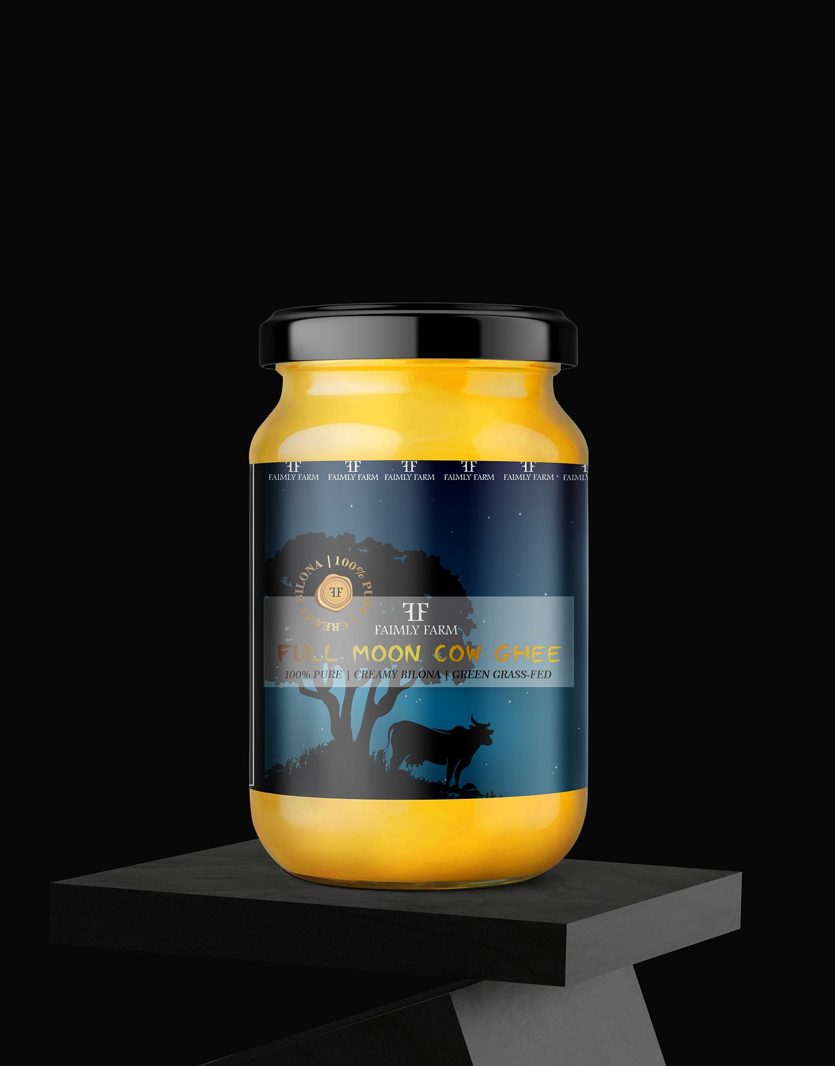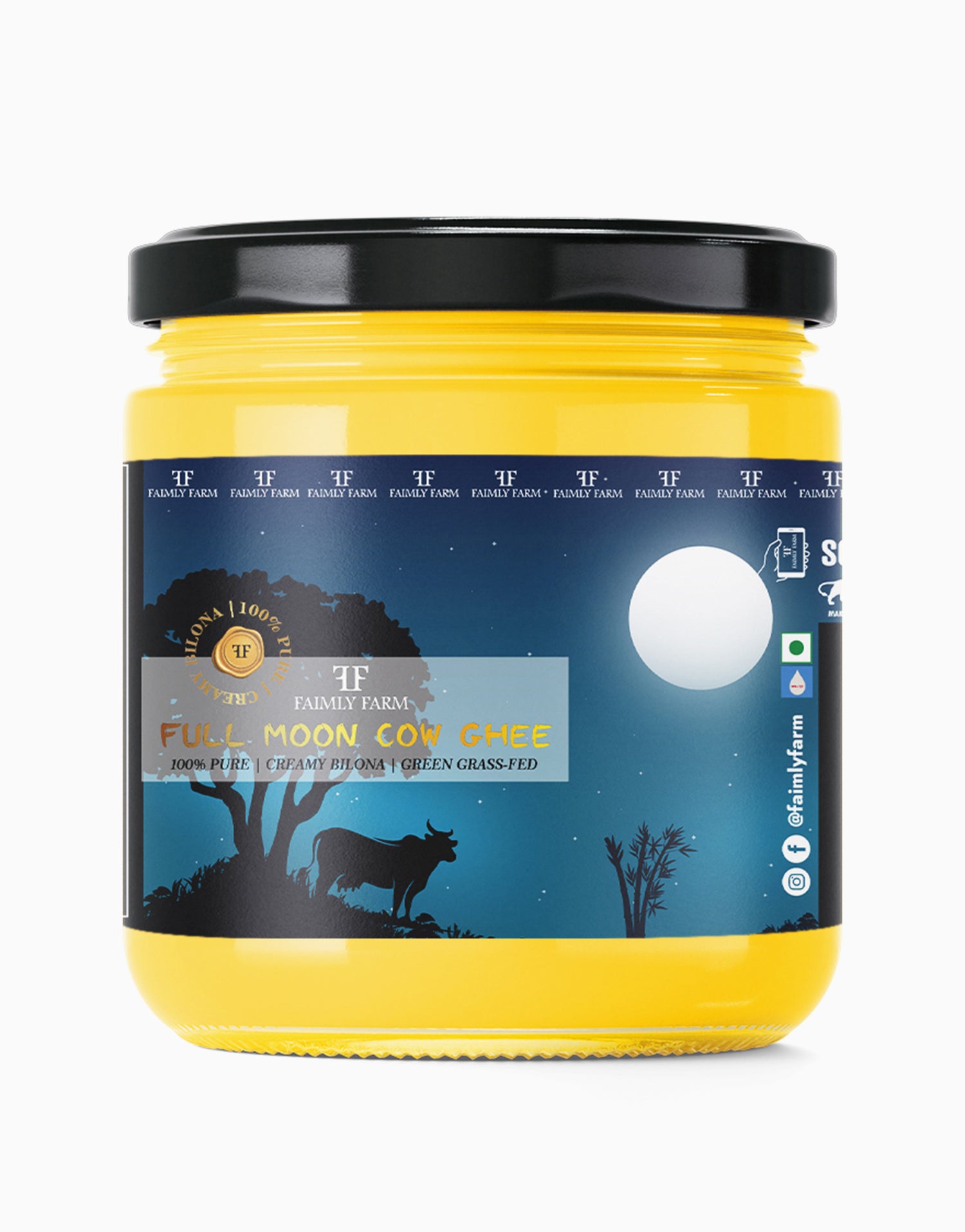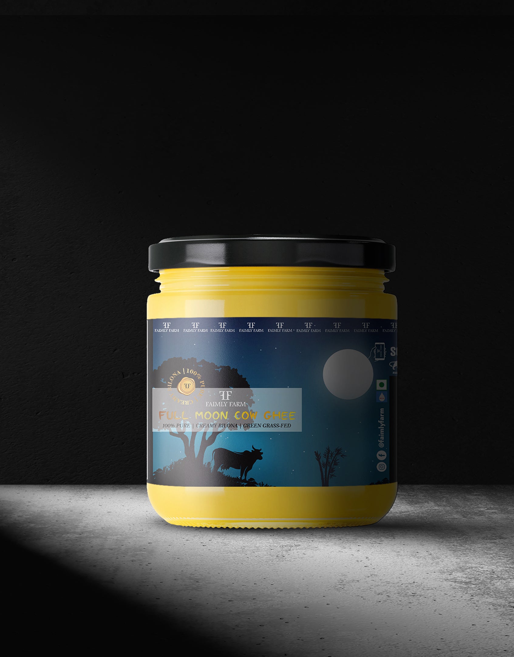Full Moon Cow Ghee from Faimly Farm is a special edition ghee crafted during the full moon using green grass-fed desi cow milk. The milk is cultured into curd, hand-churned using the creamy Bilona method, and slow-cooked to produce a smooth, danedar texture with rich aroma and golden clarity.