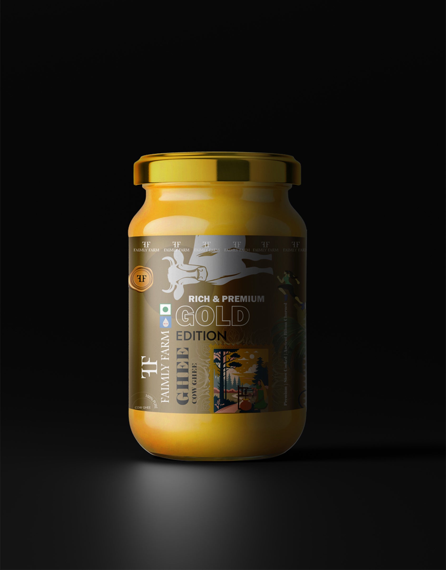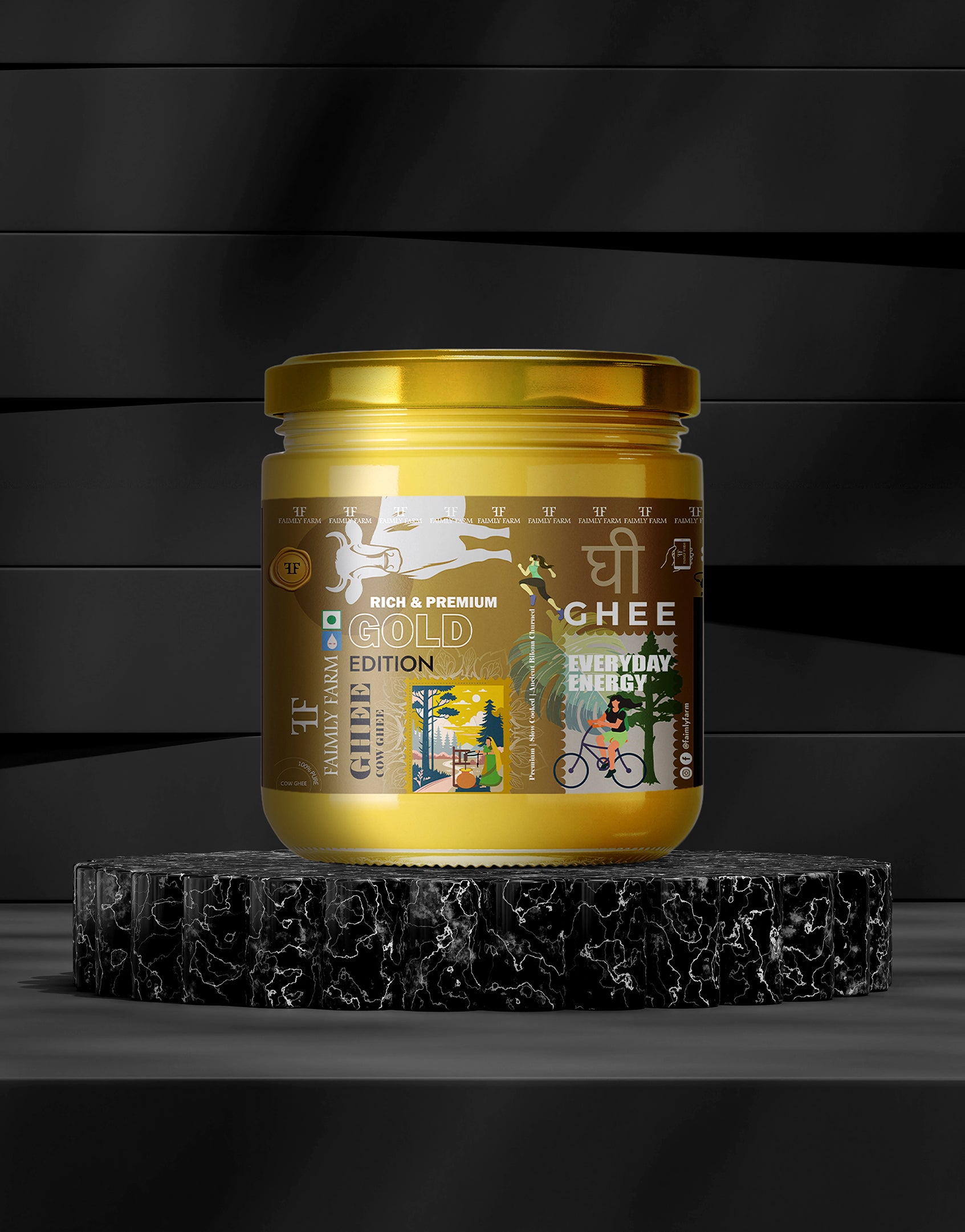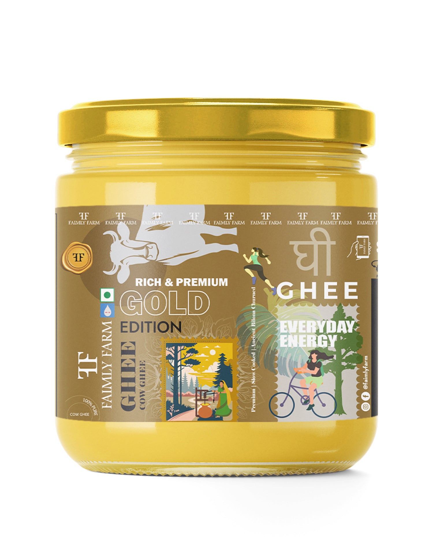 Faimly Farm (Premium Quality & Richnes) – Premium | Slow Cooked | Ancient Bilona Churned - Experience heritage in every spoon. This Gold Edition A2 Cow Ghee is slow-cooked in clay pots using the ancient Bilona method. Rich in texture, deeply aromatic, and packed with nutrition, it's perfect for festivals, rituals, or premium gifting.