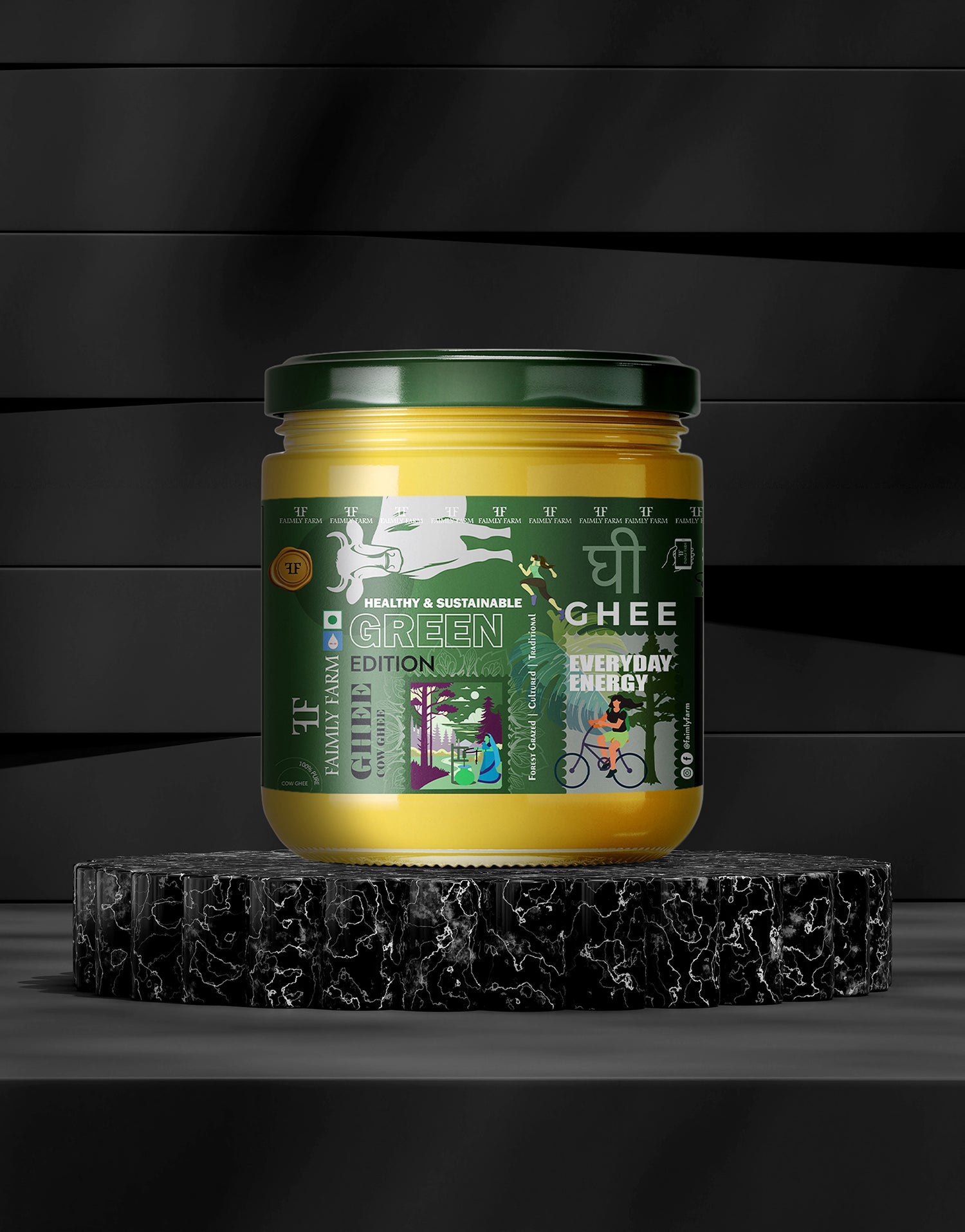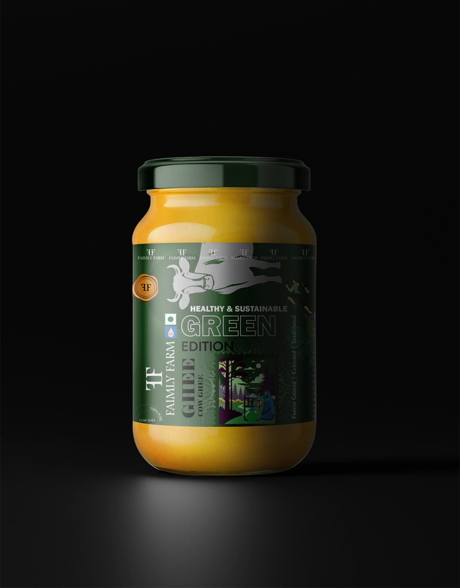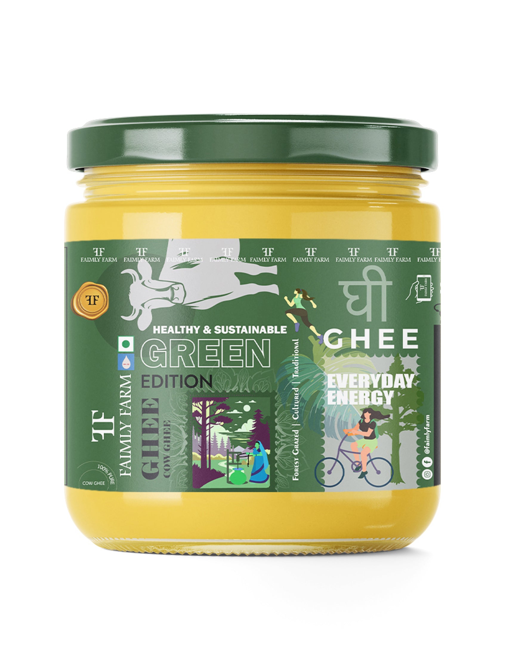 Faimly Farm (Health Benefits & Sustainability) – Forest Grazed | Cultured | Traditional - Green Edition A2 Cow Ghee is made from the milk of forest-grazed cows, using the traditional Bilona method. Naturally cultured curd is churned to extract ghee rich in aroma, taste, and nutrition. No chemicals, no shortcuts – just pure green goodness. Ideal for immunity, digestion, and deep cooking flavor.