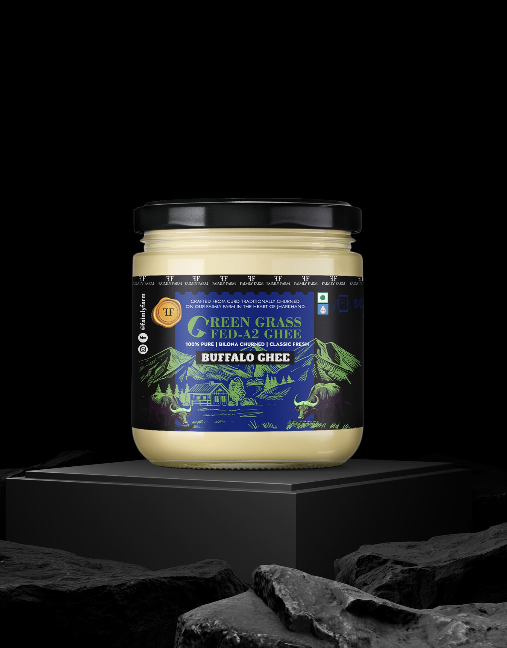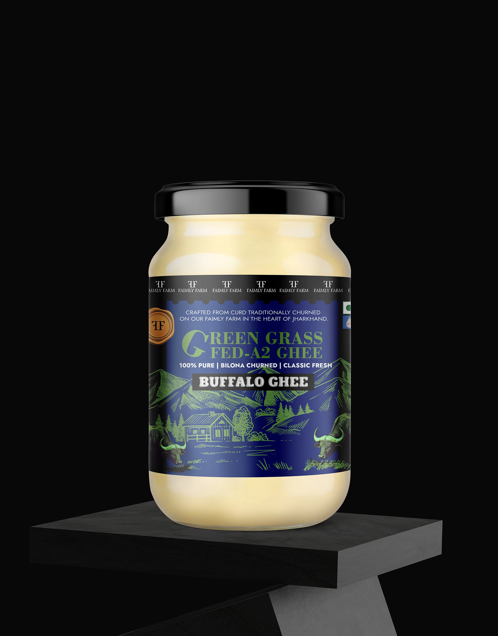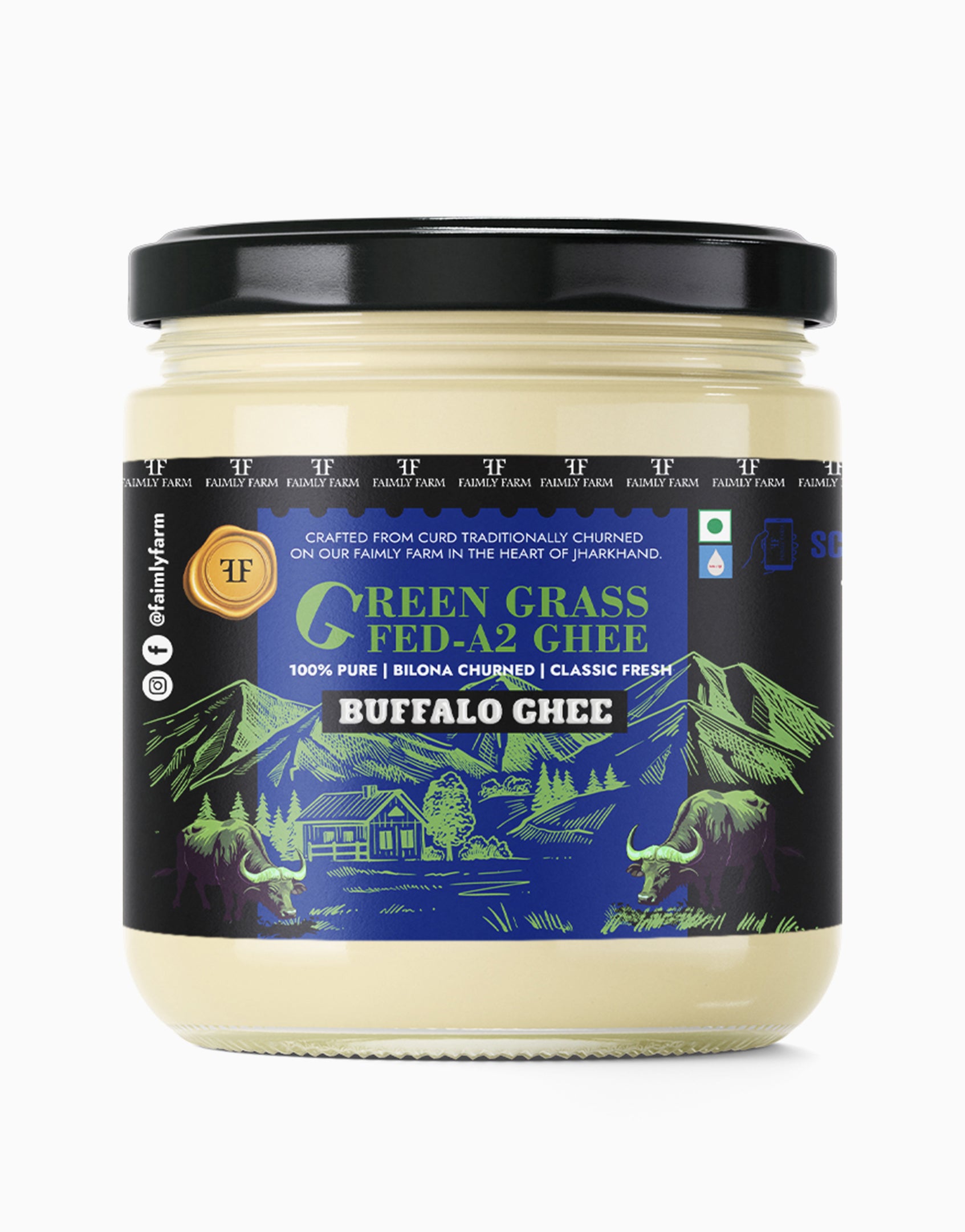 Faimly Farm (Green Grass-Fed A2 Ghee) – 100% Pure | Bilona Churned | Classic Fresh - Green Grass-Fed A2 Buffalo Ghee is made from the A2 milk of naturally grass-fed buffaloes using the traditional bilona method. Curd is hand-churned into butter and then slow-cooked over a low flame to create a thick, danedar ghee with a deep, aromatic flavor.