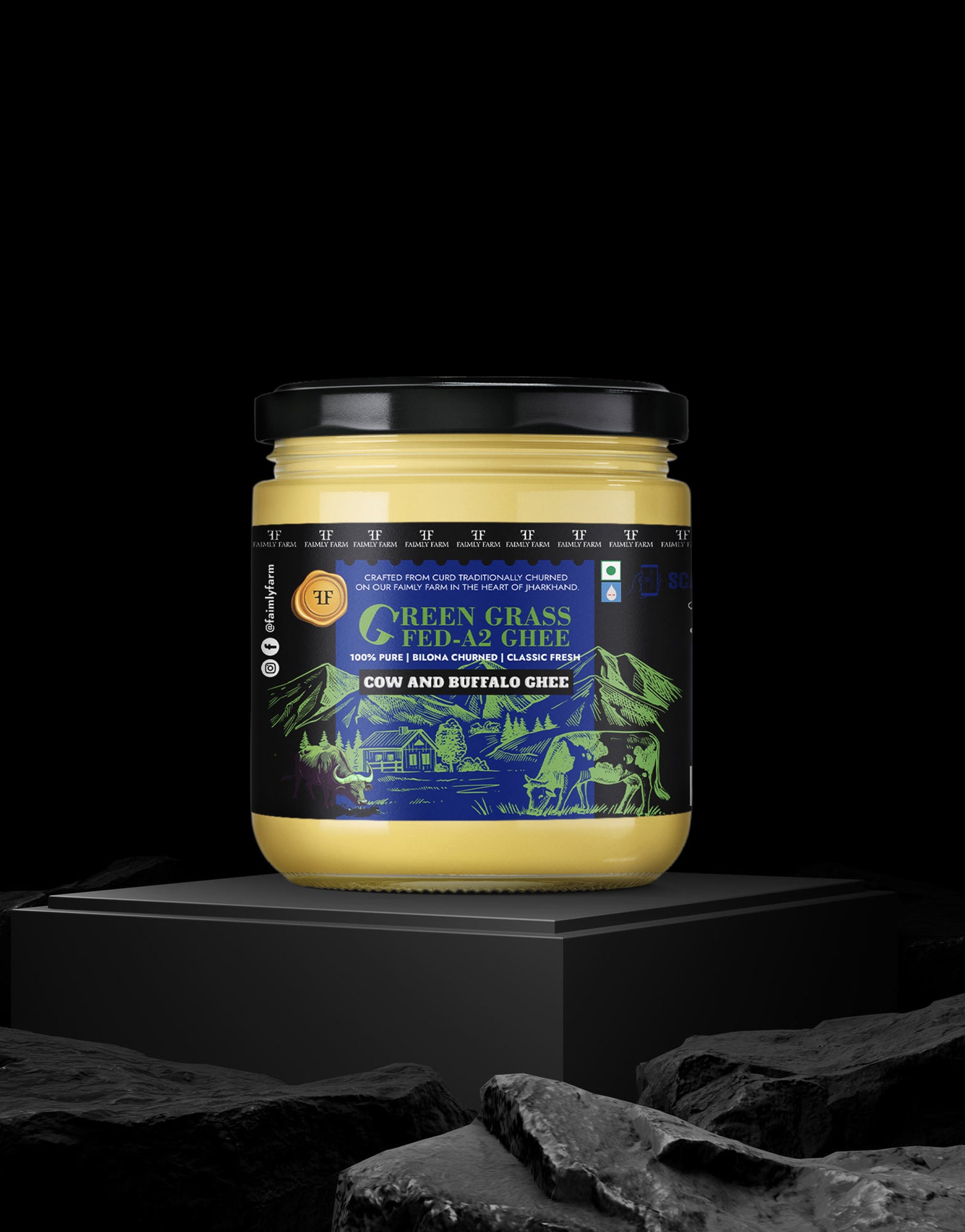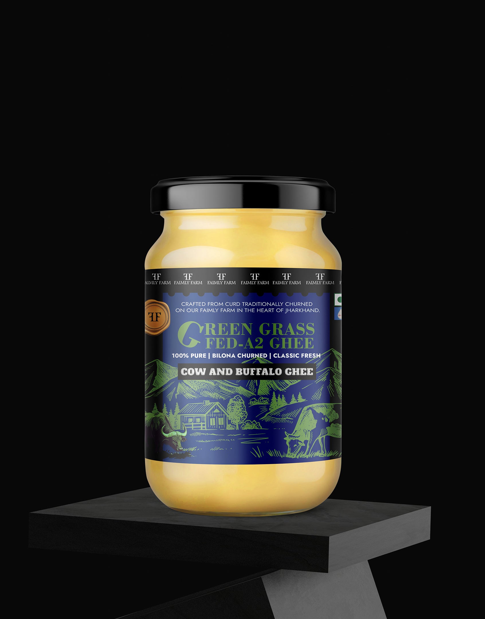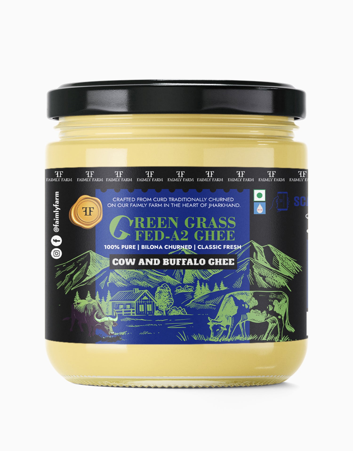 Faimly Farm (Green Grass-Fed A2 Ghee) – 100% Pure | Bilona Churned | Classic Fresh - Green Grass-Fed A2 Buffalo Ghee is crafted from the A2 milk of free-grazing buffaloes, traditionally prepared using the bilona method. Curd is hand-churned into butter and slow-cooked in small batches, creating a danedar ghee with a rich texture and deep aroma.