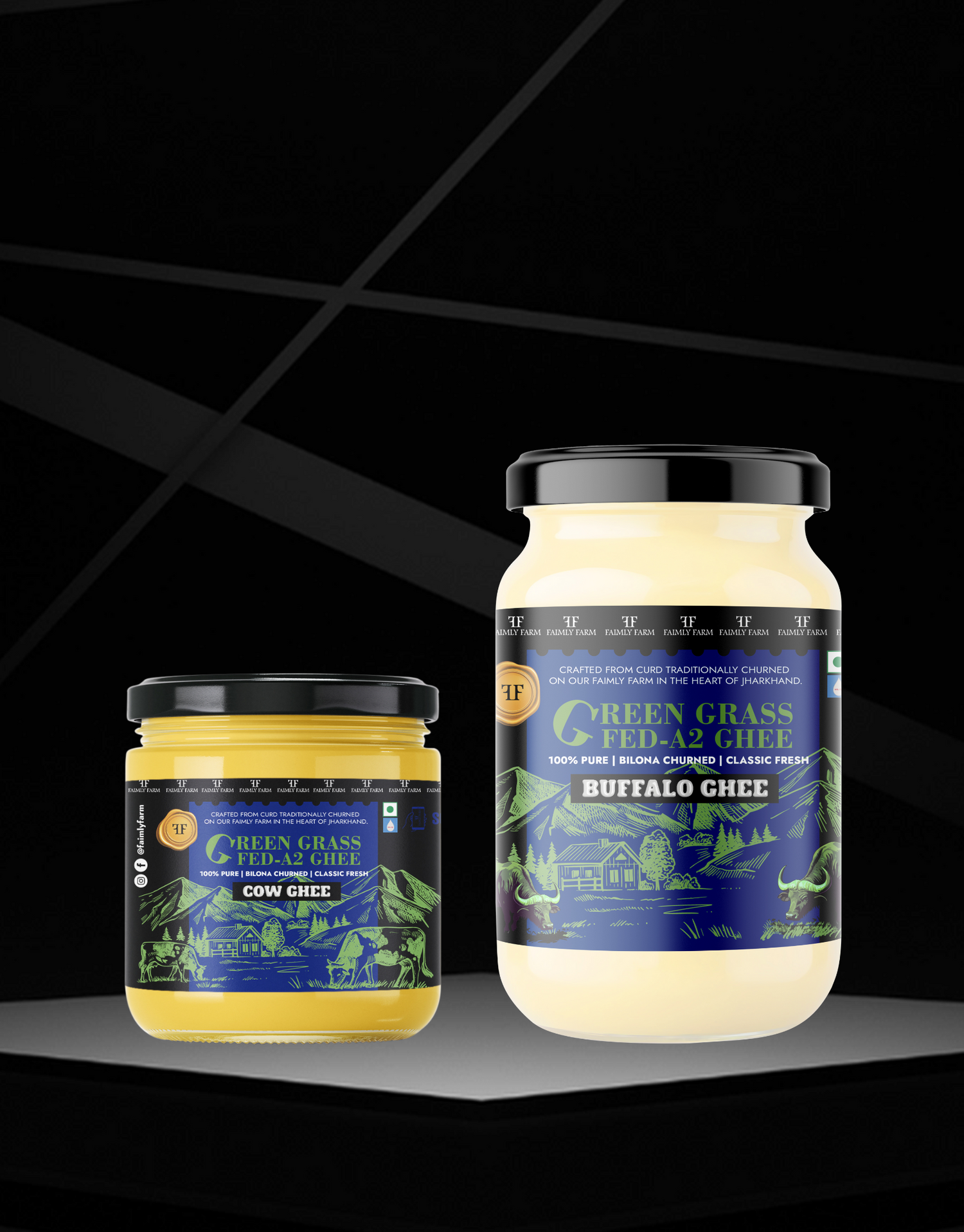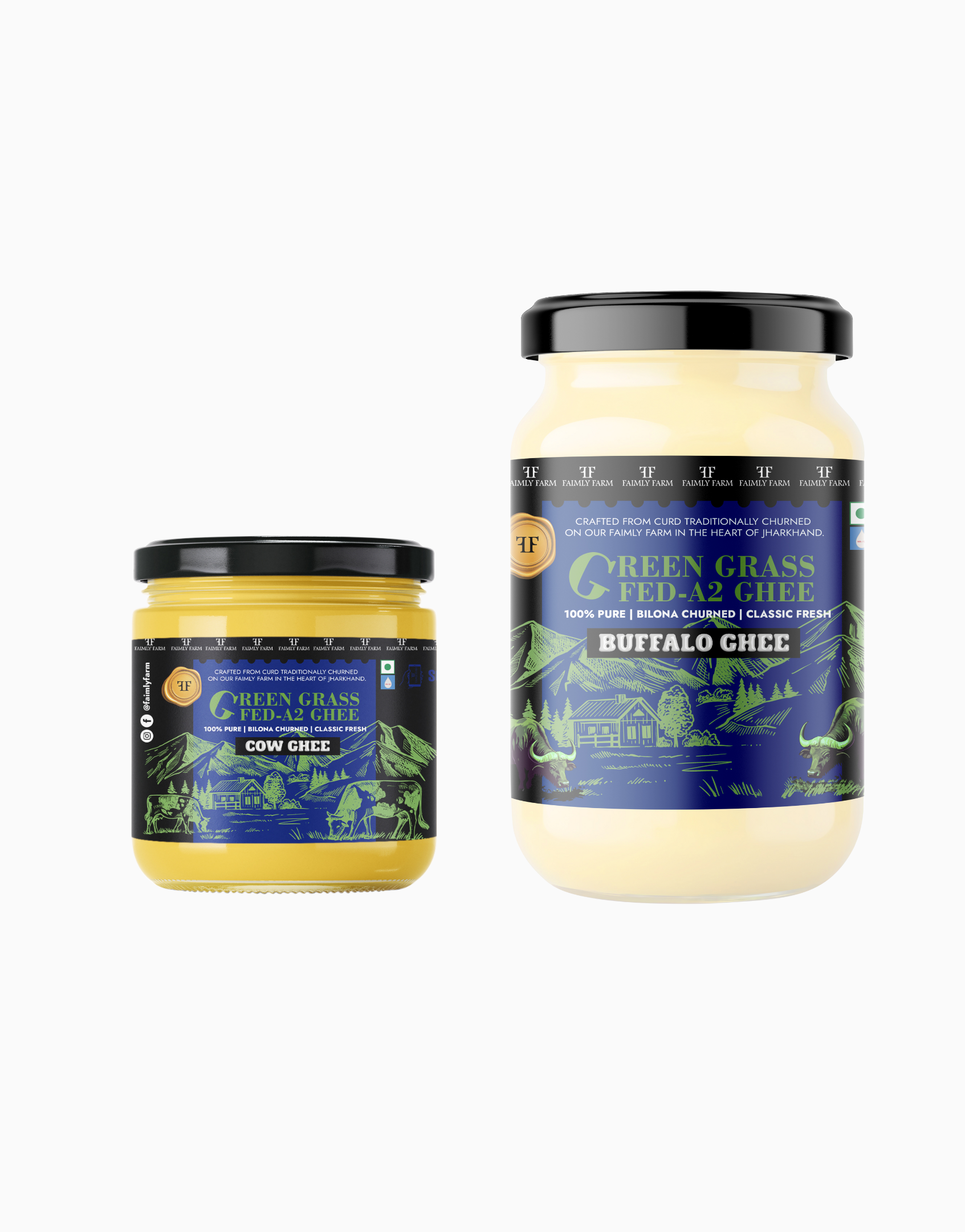 Faimly Farm (Green Grass-Fed A2 Ghee) – 100% Pure | Bilona Churned | Classic Fresh - Sourced from green-fed cows and buffaloes, this Faimly Farm A2 Ghee Combo offers Bilona-crafted purity and Classic Freshness. Supports immunity, digestion, and traditional Indian cooking. Order premium A2 ghee online today!
