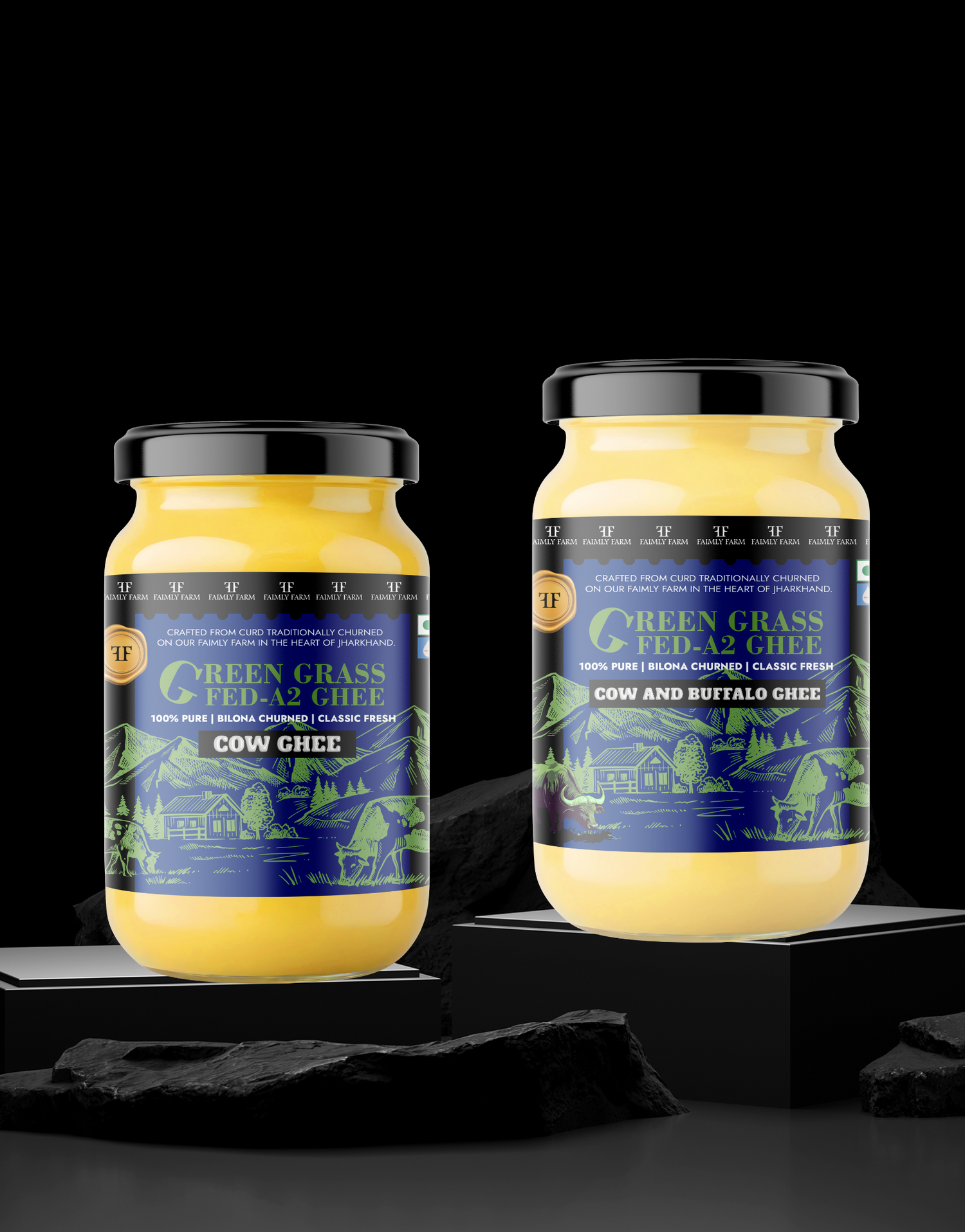 Faimly Farm (Green Grass-Fed A2 Ghee) – 100% Pure | Bilona Churned | Classic Fresh - Experience true desi richness with Faimly Farm’s Green Grass-Fed A2 Ghee Combo – a premium mix of Cow & Buffalo Ghee and Cow Ghee, Bilona Churned and naturally fresh. Perfect for digestion, immunity, and everyday energy. Shop online today!