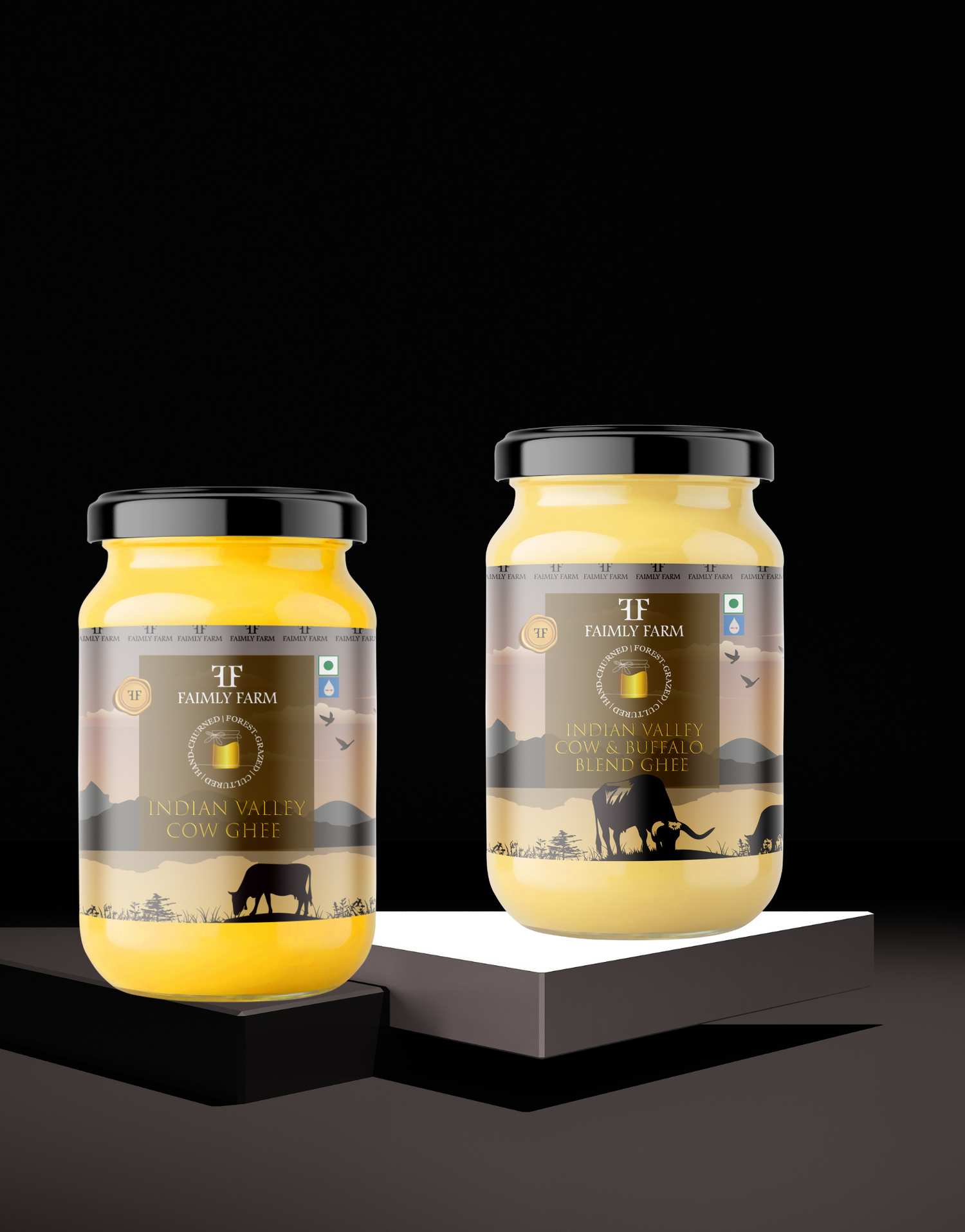 Indian Valley Cow Ghee Faimly Combo from Faimly Farm is a premium cultured ghee collection featuring cow ghee and a cow & buffalo blend ghee. Made from forest-grazed desi milk using traditional curd-culturing, hand-churning, and slow-cooking methods, it delivers a danedar texture, rich aroma, and nutrient-rich, digestible goodness.