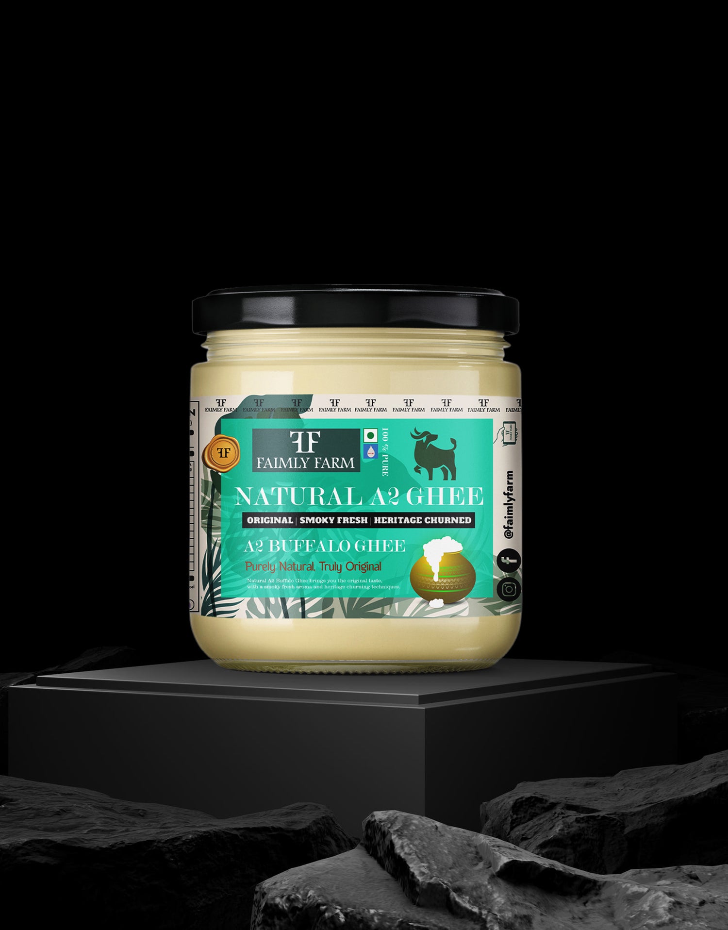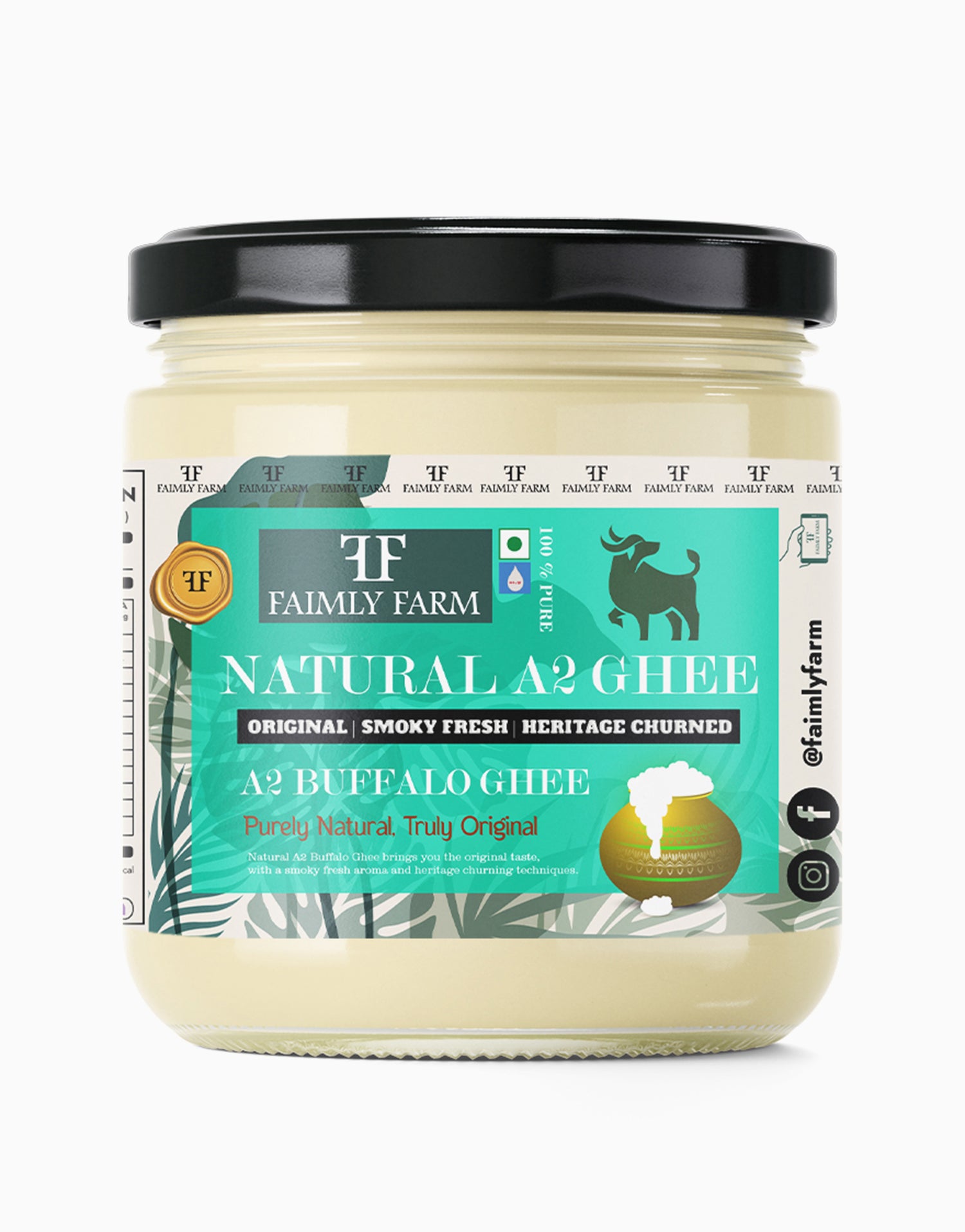 Faimly Farm (Nature's Pure A2 Collection) – Original | Smoky Fresh | Heritage Churned - Prepared from A2 buffalo milk using the time-honored bilona method, this ghee is churned from curd and slow-cooked to deliver a bold, smoky aroma and deep flavor. Its thick, danedar texture reflects true heritage and purity—perfect for traditional cooking, wellness rituals, and high-nutrition meals.