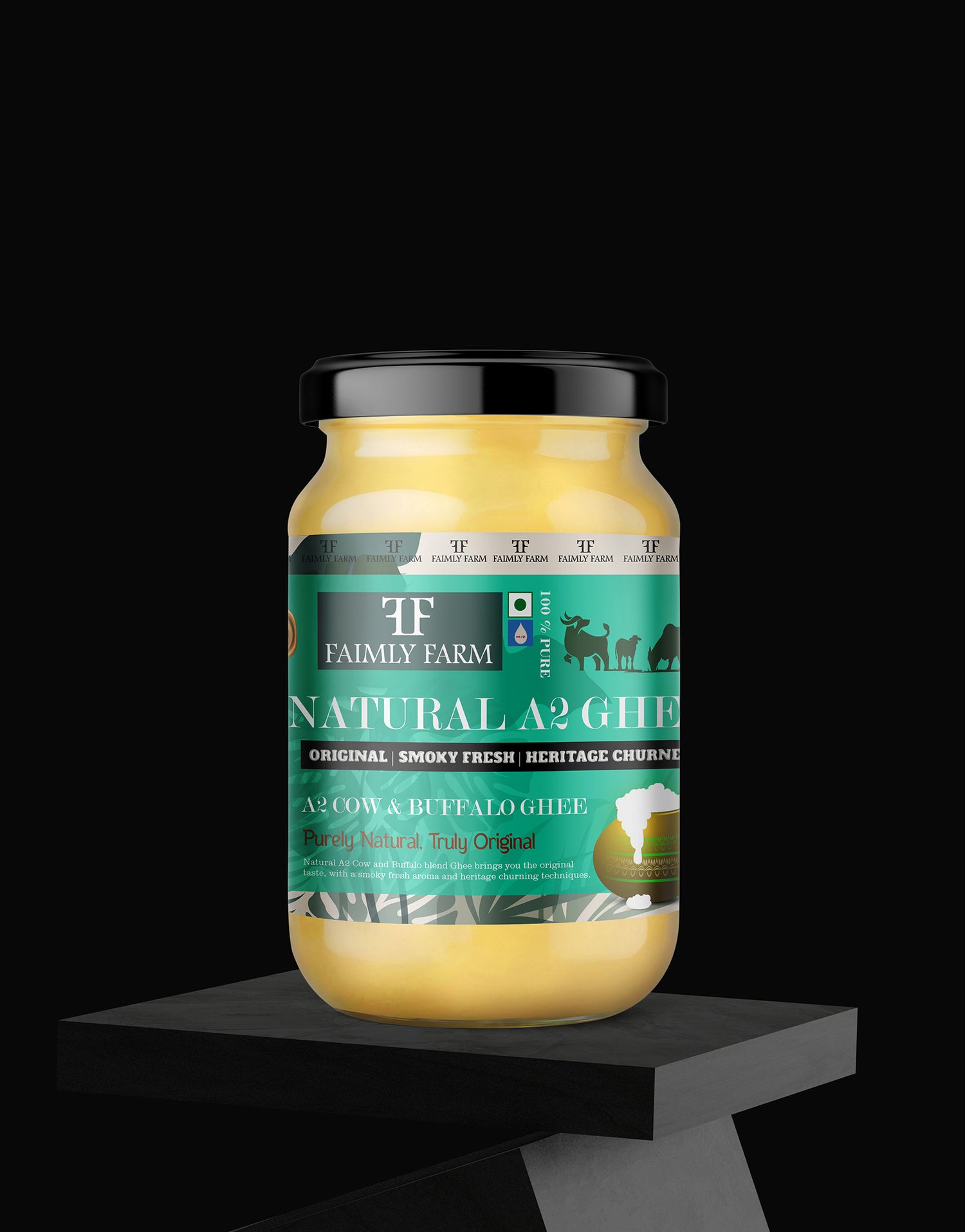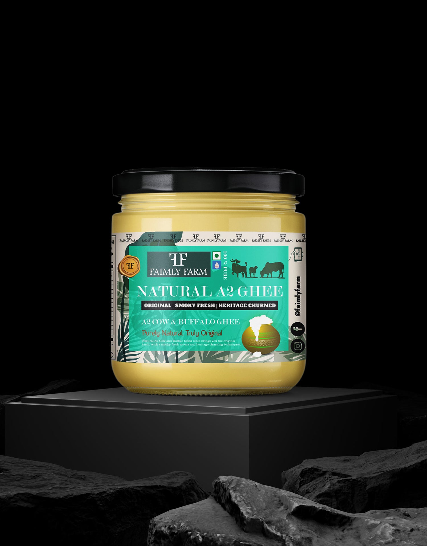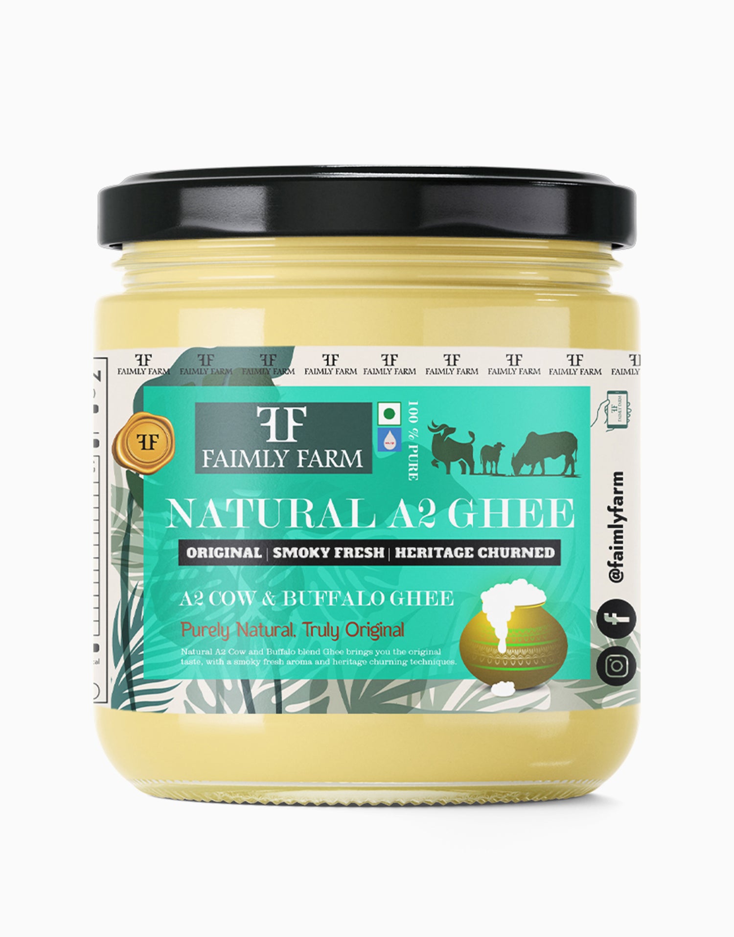 Faimly Farm (Nature's Pure A2 Collection) – Original | Smoky Fresh | Heritage Churned - Nature’s Pure A2 Cow & Buffalo Ghee blends the lightness of A2 cow milk with the creamy richness of A2 buffalo milk. Using the traditional bilona method, curd is hand-churned into butter and slow-cooked over flame to achieve a bold, smoky finish. Danedar in texture and full of heritage flavor, this ghee is crafted by skilled village artisans.