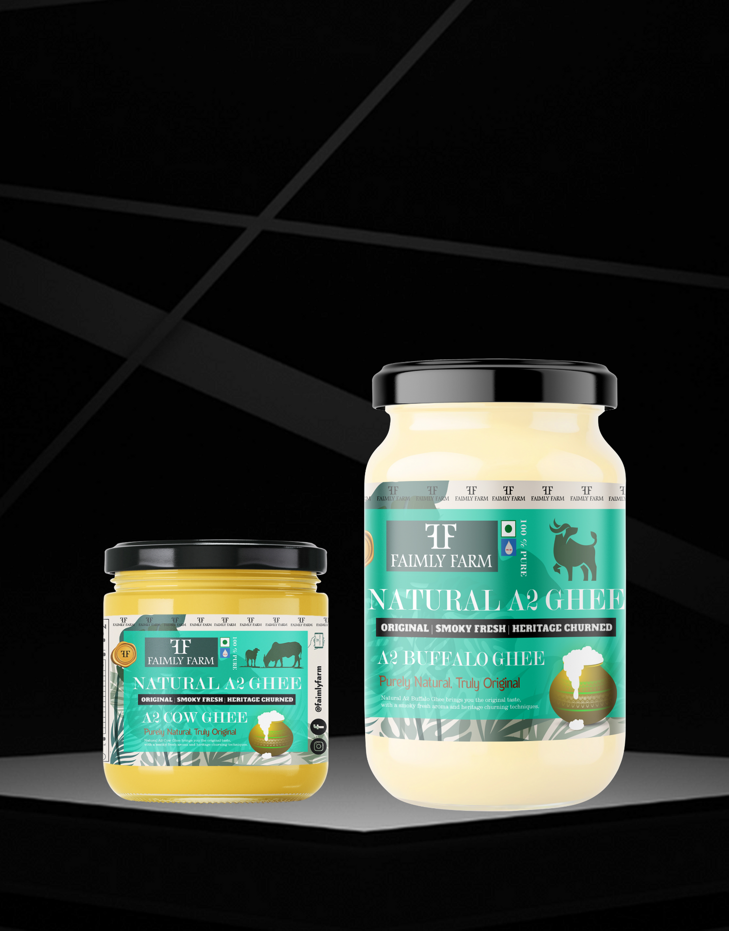 Faimly Farm (Nature's Pure A2 Collection) – Original | Smoky Fresh | Heritage Churned - Buy Nature's Pure A2 Collection Combo Ghee Online from Faimly Farm – a curated blend of Cow Ghee and Buffalo Ghee in Original, Smoky Fresh, and Heritage Churned styles. Crafted from ethically sourced A2 milk, this Ultra Clarified combo delivers Everyday Energy, Rich Nutrition, and 100% Natural Purity for your wellness journey.