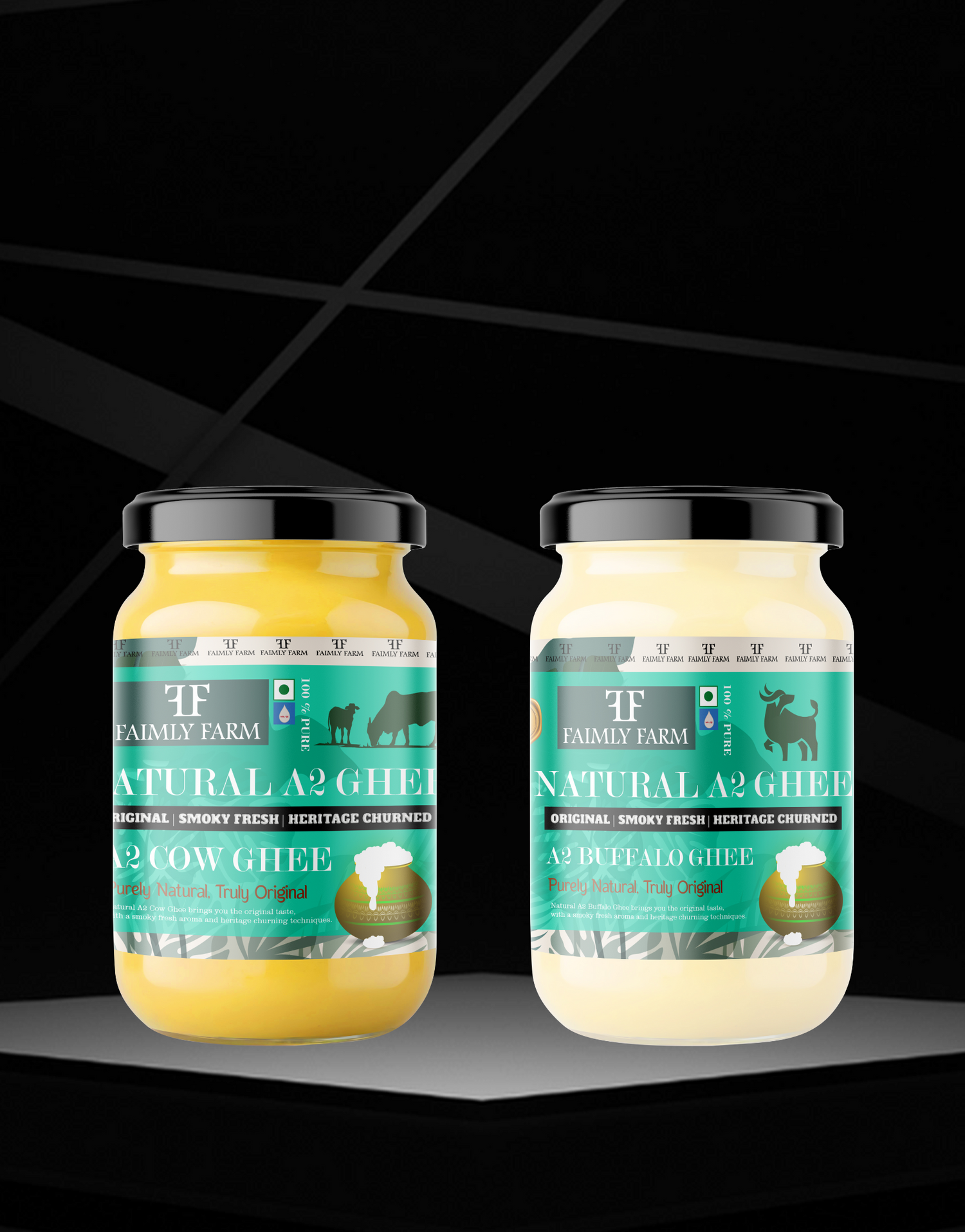 Faimly Farm (Nature's Pure A2 Collection) – Original | Smoky Fresh | Heritage Churned - Buy Nature's Pure A2 Collection Combo Ghee Online from Faimly Farm – featuring Cow Ghee and Buffalo Ghee in Original, Smoky Fresh, and Heritage Churned variants. Made from ethically sourced A2 milk, this Ultra Clarified Ghee combo delivers Everyday Energy, Rich Nutrition, and 100% Natural Purity for balanced daily wellness.