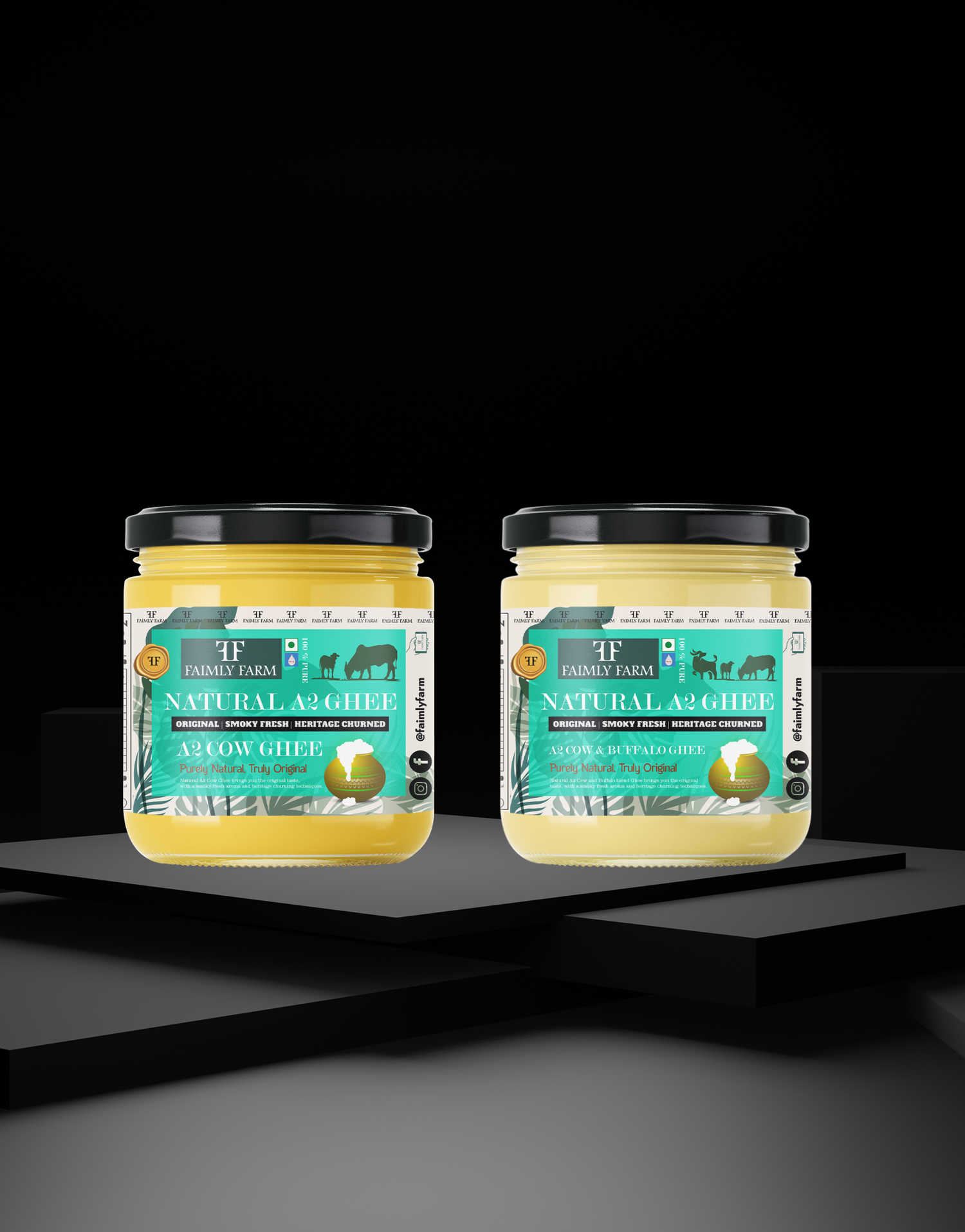 Faimly Farm (Nature's Pure A2 Collection) – Original | Smoky Fresh | Heritage Churned - Buy Nature's Pure A2 Collection Combo Ghee Online from Faimly Farm – a wholesome mix of Cow Ghee and Cow & Buffalo Ghee in Original, Smoky Fresh, and Heritage Churned styles. Crafted from ethically sourced A2 milk, this Ultra Clarified combo offers Everyday Energy, Rich Nutrition, and 100% Natural Wellness.