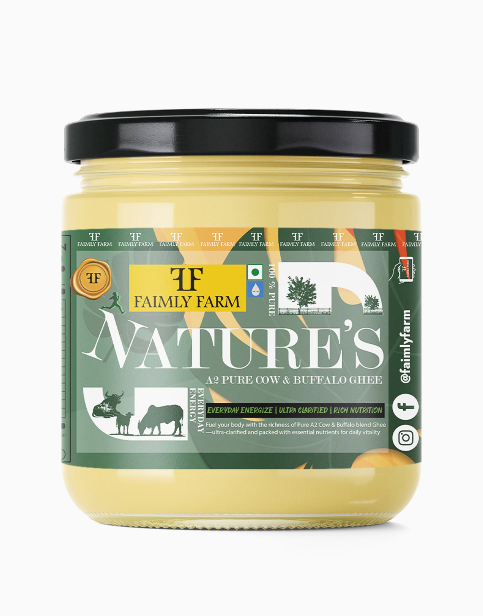 Faimly Farm (Nature's Pure A2 Collection) – Everyday Energize | Ultra Clarified | Rich Nutrition - Experience the perfect balance of Nature’s Pure A2 Cow & Buffalo Ghee—combining the easy digestibility of A2 cow ghee with the rich strength and nutrition of A2 buffalo ghee. Ultra-clarified and naturally packed with vitamins A, D, E, and K, this premium blend fuels energy, supports digestion and metabolism, and nourishes the body from within.