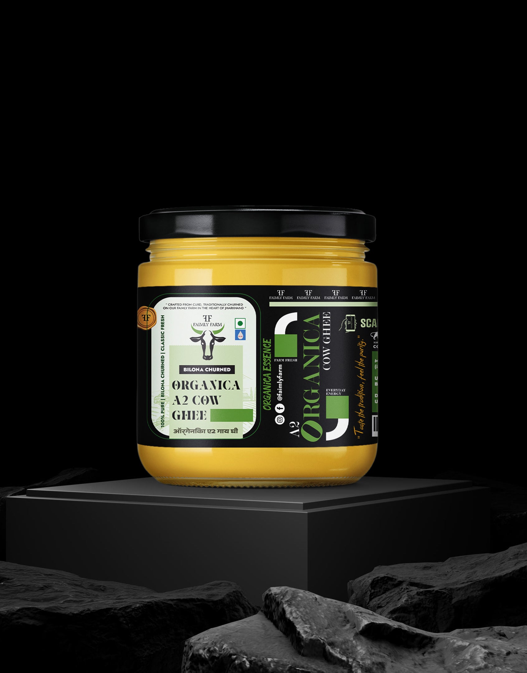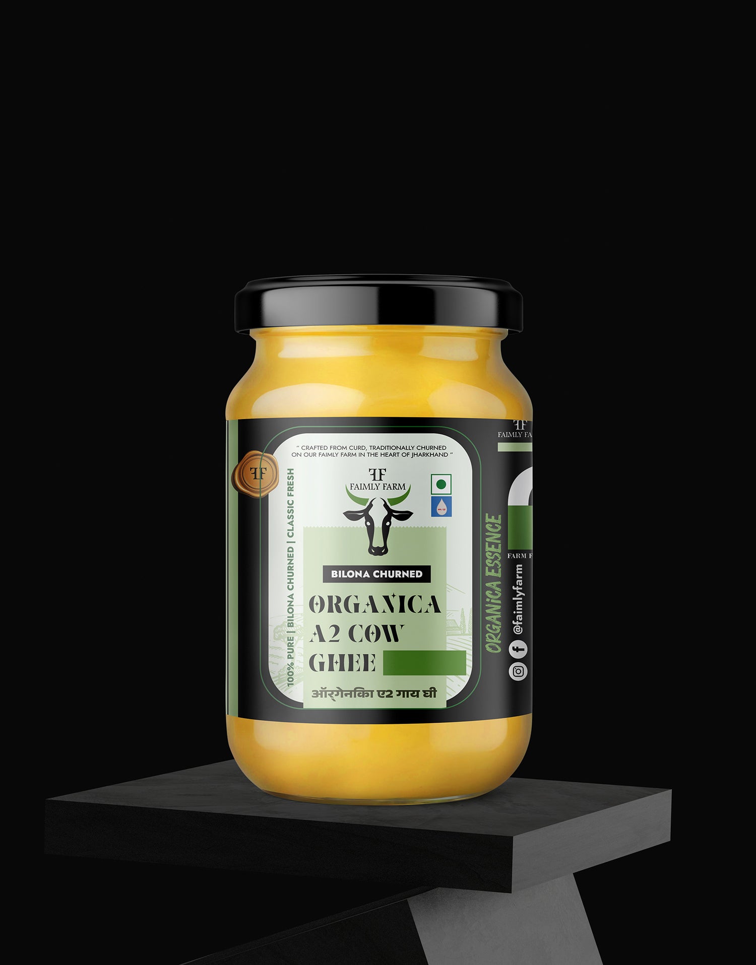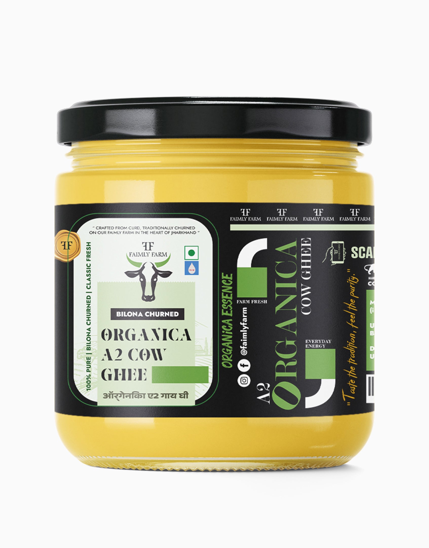 Faimly Farm (Organica Essence) – 100% Pure | Bilona Churned | Classic Fresh - Faimly-Farm Organica A2 Cow Ghee is slow-crafted from the A2 milk of indigenous Indian cows using the time-honored Bilona churning process. Fresh curd is churned into butter and gently simmered over low heat to yield golden, aromatic ghee. Produced in small batches and entirely free from chemicals or preservatives, it retains maximum nutrition, digestive goodness, and purity.