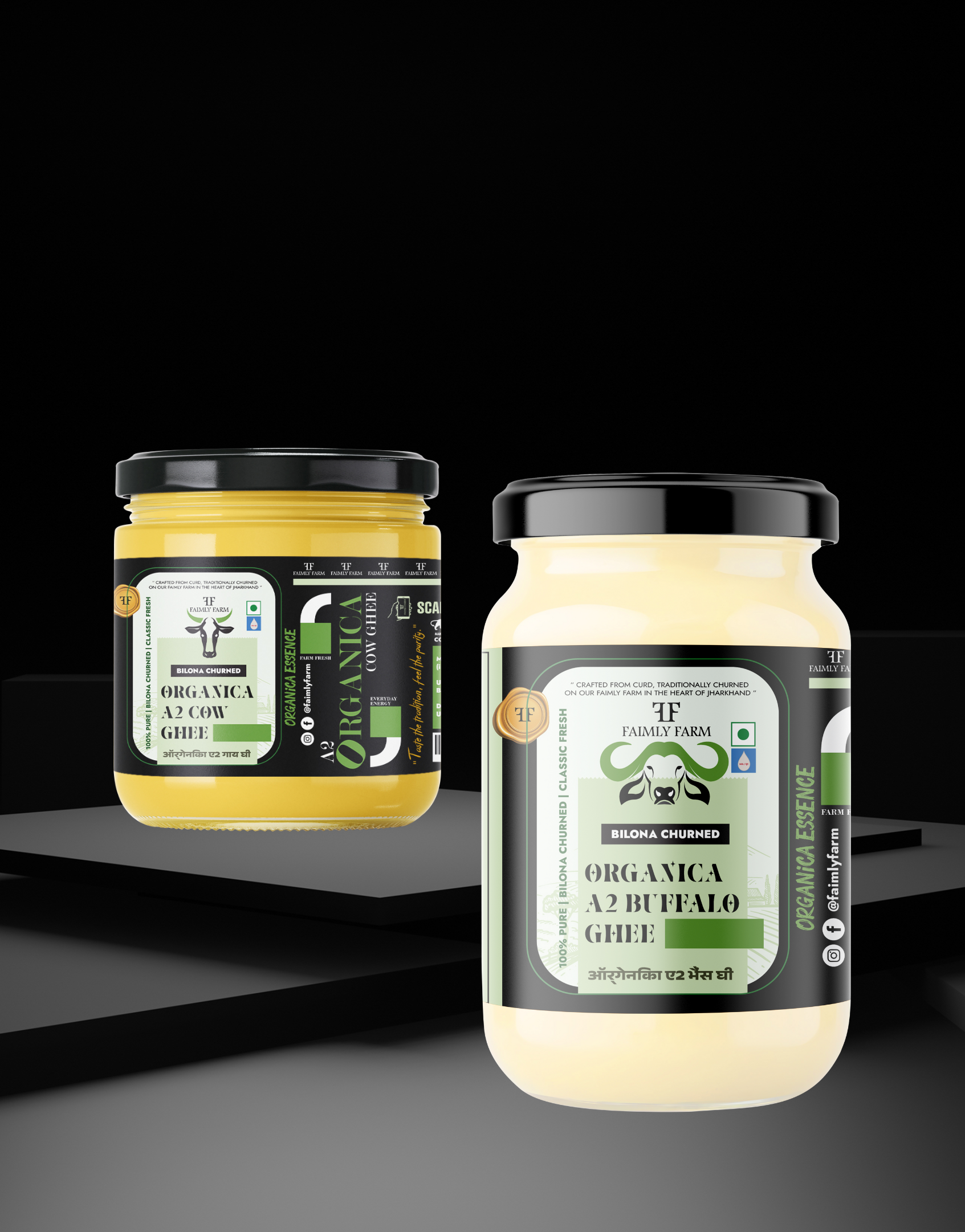 Faimly Farm (Organica Essence) – 100% Pure | Bilona Churned | Classic Fresh - Discover wholesome nourishment with Organica Essence Combo Ghee from Faimly Farm. Made using the traditional Bilona method and 100% pure A2 milk, this premium combo of Cow and Buffalo Ghee offers classic freshness, rich aroma, and authentic purity—perfect for everyday cooking, energy, and wellness.