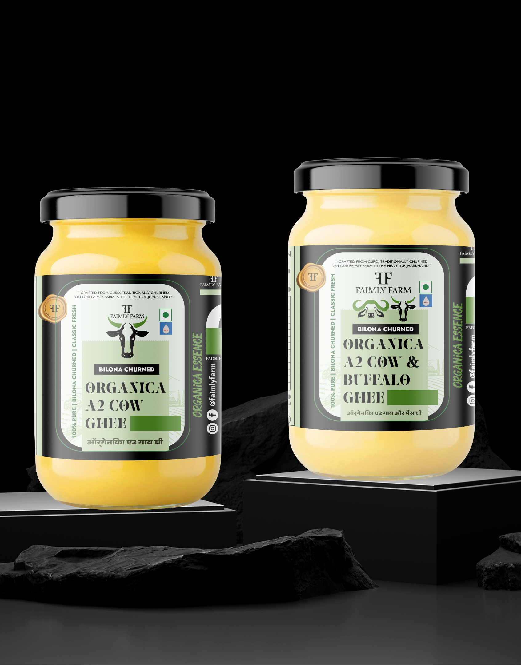 Faimly Farm (Organica Essence) – 100% Pure | Bilona Churned | Classic Fresh - Faimly Farm Organica Essence Combo Ghee includes two essential A2 ghee variants – Cow Ghee and Cow & Buffalo Blend Ghee – handcrafted using the traditional Bilona method. Made from 100% pure A2 milk, this combo delivers a classic fresh texture, rich aroma, and natural nutrition. Ideal for daily cooking, energy, and digestion, it brings together purity, tradition, and health in one nourishing pack. Buy Organica Essence Combo Ghee online and elevate your everyday meals with authentic farm-fresh goodness.