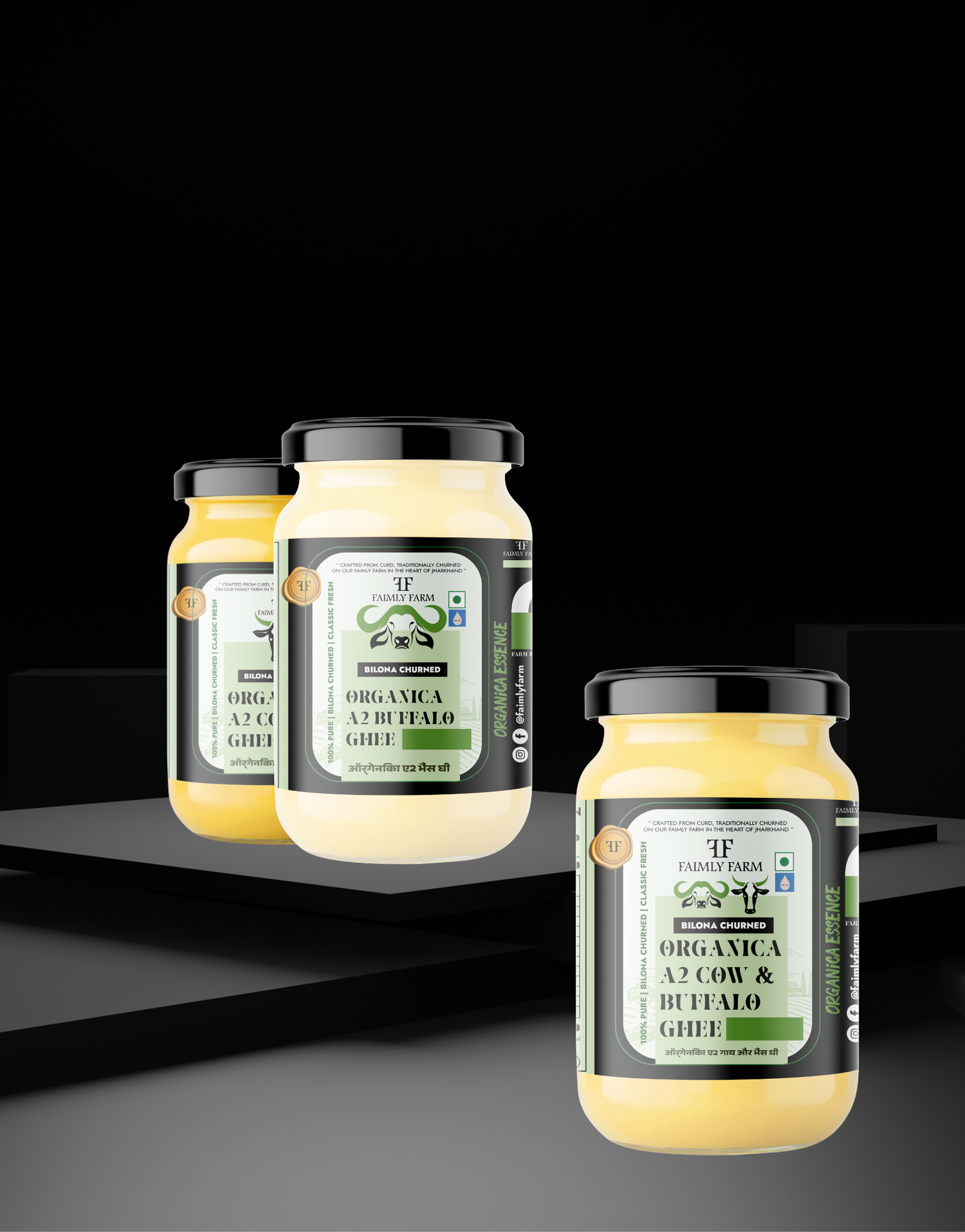 Faimly Farm (Organica Essence) – 100% Pure | Bilona Churned | Classic Fresh - Faimly Farm Organica Essence Trio Ghee features a curated set of three A2 ghee variants – Cow Ghee, Buffalo Ghee, and Cow & Buffalo Blend – made using the traditional Bilona churned method. Each ghee is crafted from 100% pure A2 milk and slow-cooked for a classic fresh texture, rich aroma, and deep nutrition. Ideal for everyday wellness, immunity, and balanced cooking, this trio brings authentic taste and holistic health to your table. Buy Organica Essence Trio Ghee online and embrace purity, tradition, and nourishment in one pack.