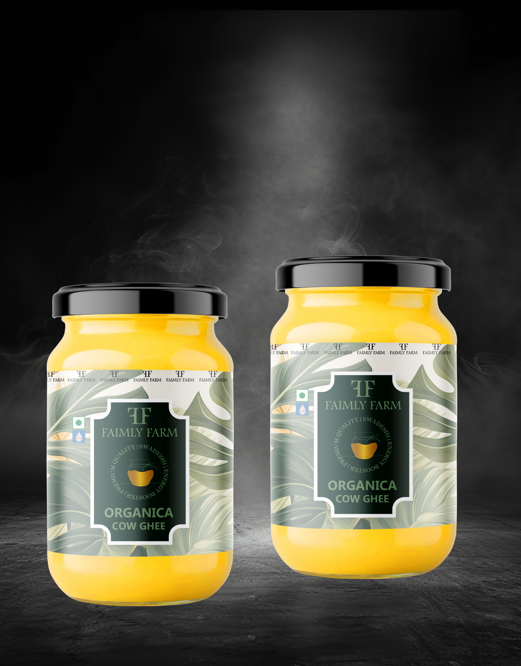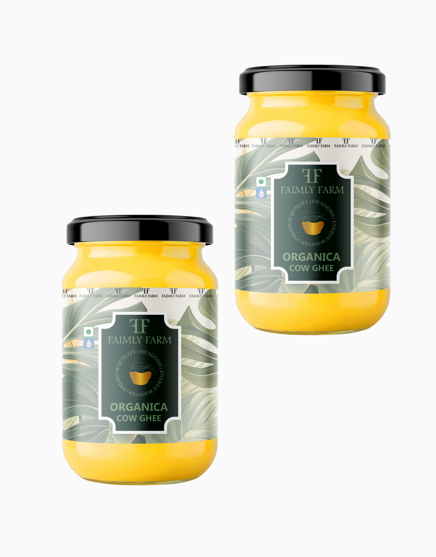 Organica Cow Ghee Twin Pack from Faimly Farm is a Swadeshi, energy-boosting, premium-quality ghee made from pure desi cow milk. Crafted using traditional curd-culturing, hand-churning, and slow-cooking methods, it delivers a smooth, danedar texture, rich aroma, and nutrient-packed goodness.