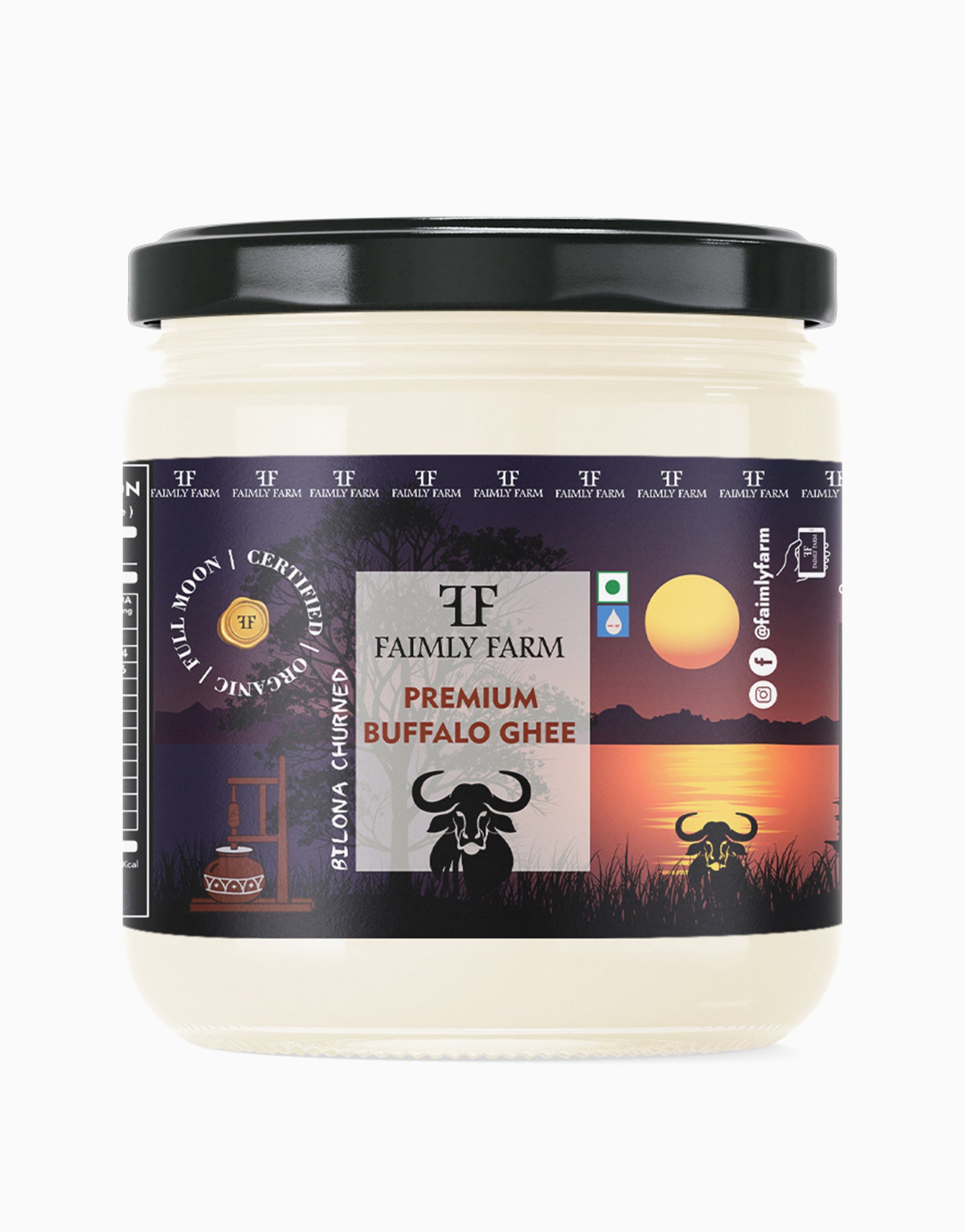 Premium Full Moon Buffalo Ghee from Faimly Farm is a certified organic ghee prepared with buffalo milk and traditional moon-cycle methods. Crafted during the Purnima (Full Moon) phase, it is believed to carry enhanced energy, depth, and sacred resonance.