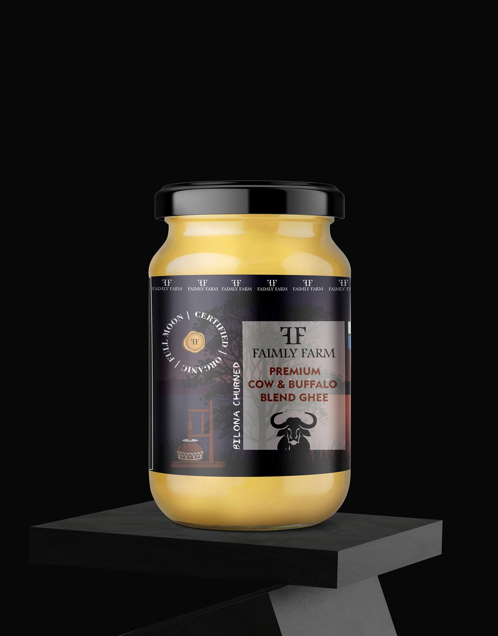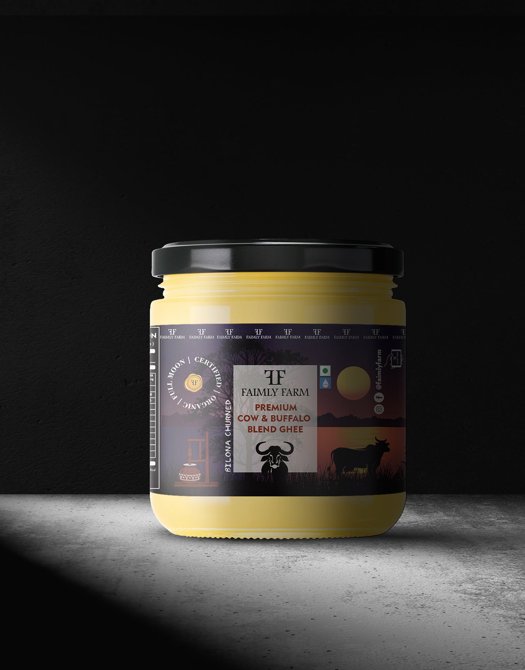 The blend delivers the digestive lightness and aroma of cow ghee with the rich creaminess and depth of buffalo ghee, making it a balanced and nourishing choice.
