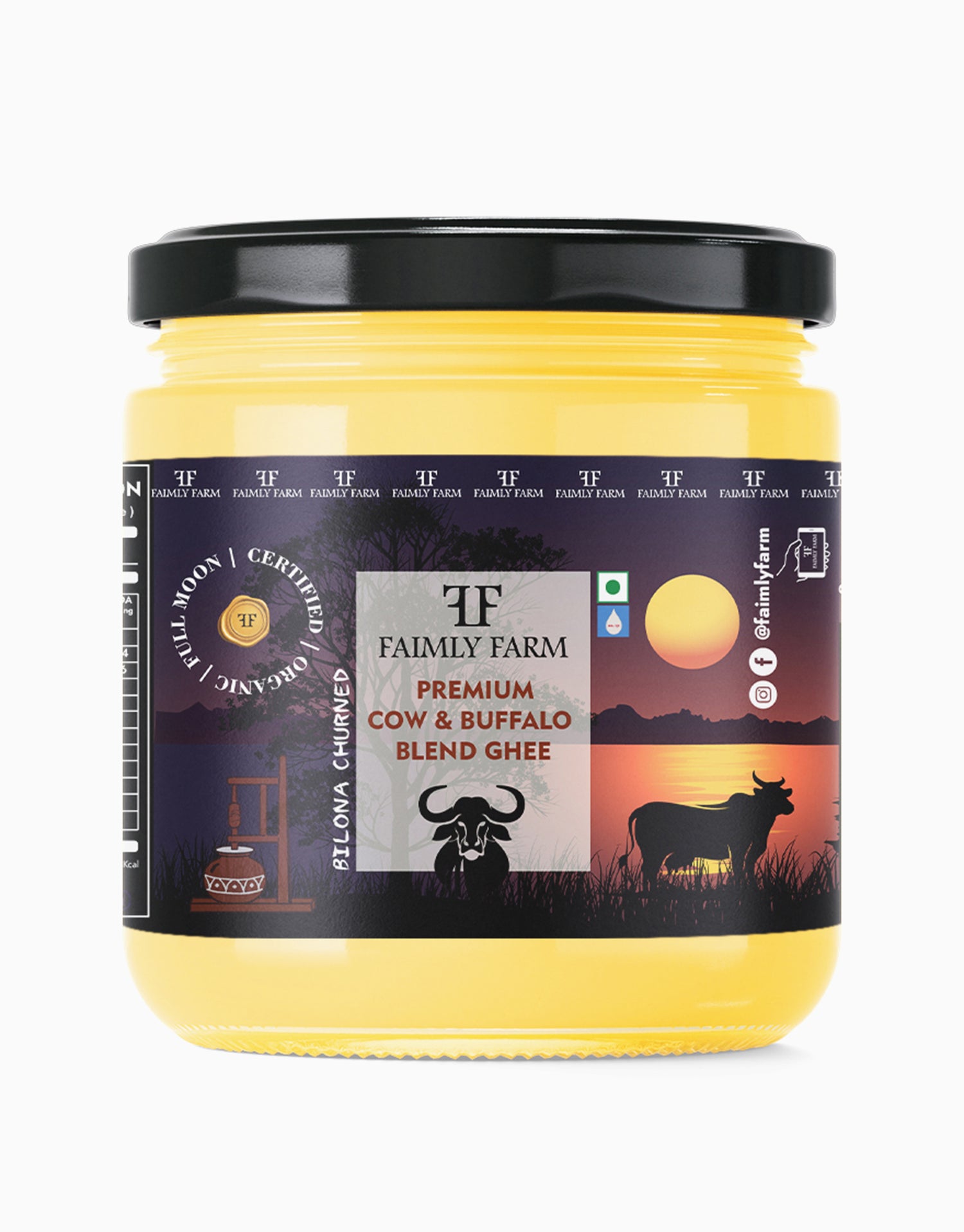 Premium Full Moon Cow & Buffalo Blend Ghee from Faimly Farm is a sacred fusion of certified organic desi cow and buffalo milk, crafted using traditional slow-cook methods under the Purnima (Full Moon) phase. This process is believed to enhance the ghee’s sattvic energy, purity, and vibrational strength.