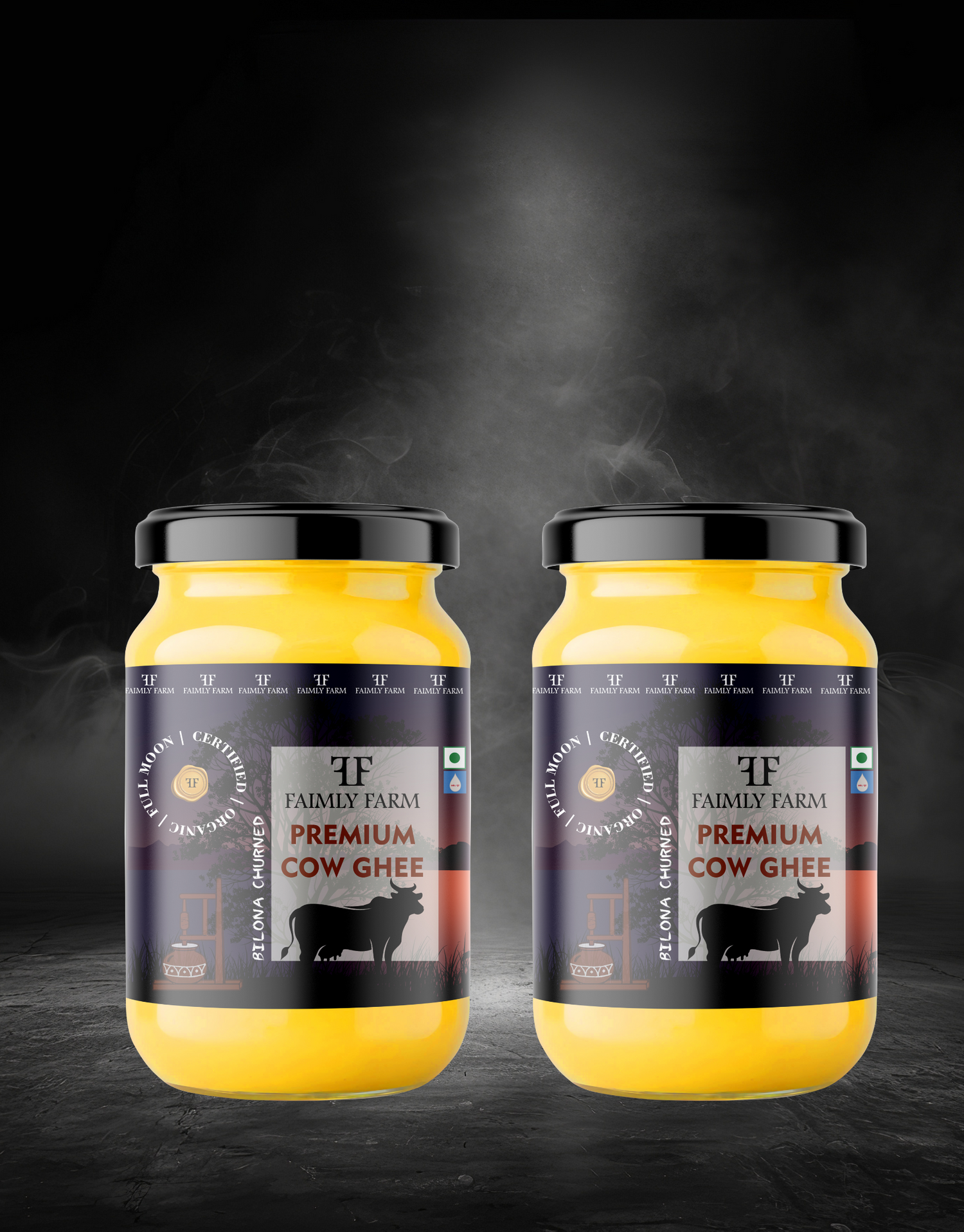 Premium Cow Ghee Celebration Pack from Faimly Farm is a 100% pure, certified, and organic ghee made from desi cow milk sourced during the full moon. Crafted using traditional curd-culturing, hand-churning, and slow-cooking methods, it delivers a rich, aromatic, danedar texture with optimal nutrient retention.